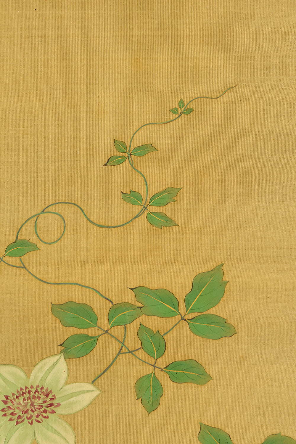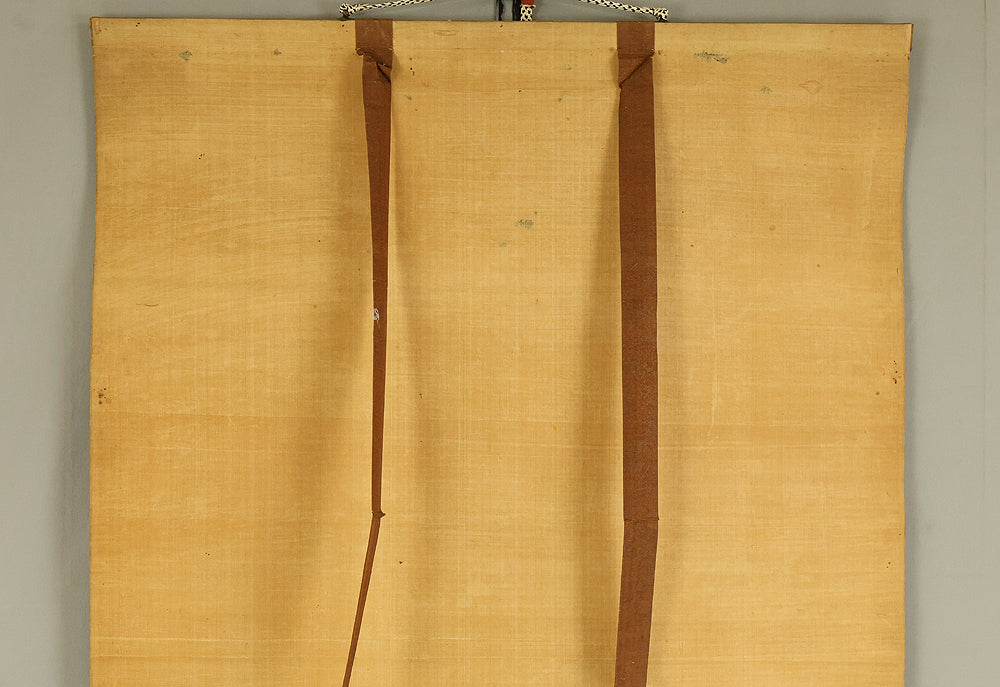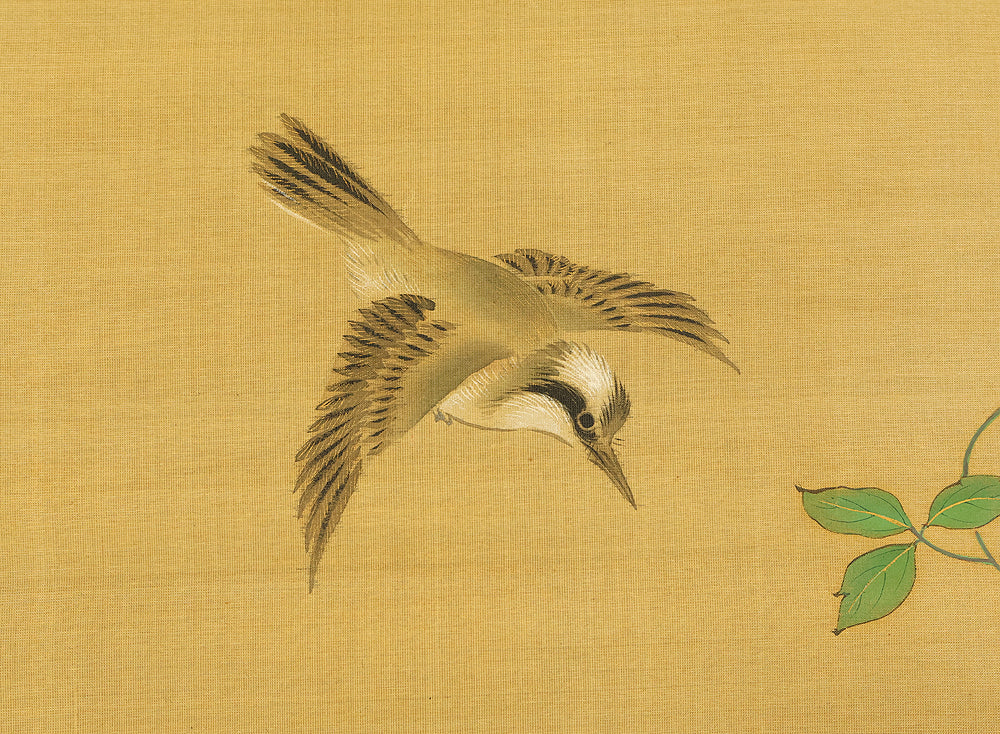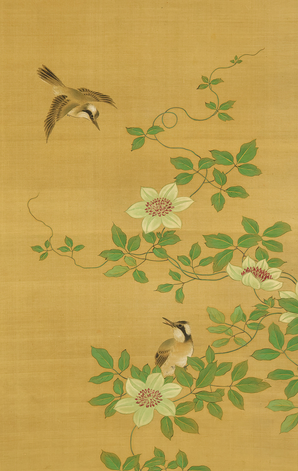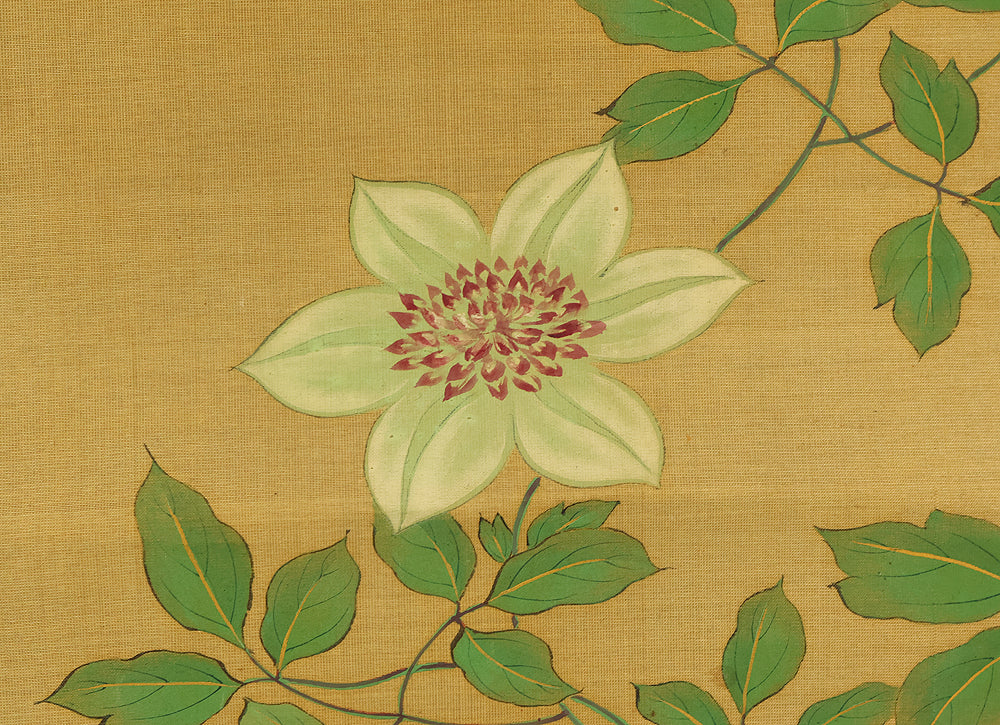 A refined hanging scroll by Sakai Hōitsu, founder of the Edo Rimpa school and one of the most celebrated painters of the late Edo period. The composition features a flowering cretimus vine entwined with delicate foliage, accompanied by two small birds in gentle interaction—an elegant rendering of seasonal vitality and poetic charm. Signed Hoitsu hitsu (抱一 筆) and sealed Bunsen (文詮), the work exemplifies Hōitsu’s mastery of decorative rhythm, lyrical brushwork, and naturalistic detail. Having studied multiple schools—including Kano, Ukiyo-e, Shin Nanpin, Maruyama, and Tosa—Hōitsu ultimately embraced and revitalized the Rinpa tradition of Ogata Kōrin and Ogata Kenzan. This scroll offers a graceful synthesis of classical refinement and Edo-period innovation, ideal for collectors of Rimpa and literati-inspired bird-and-flower painting