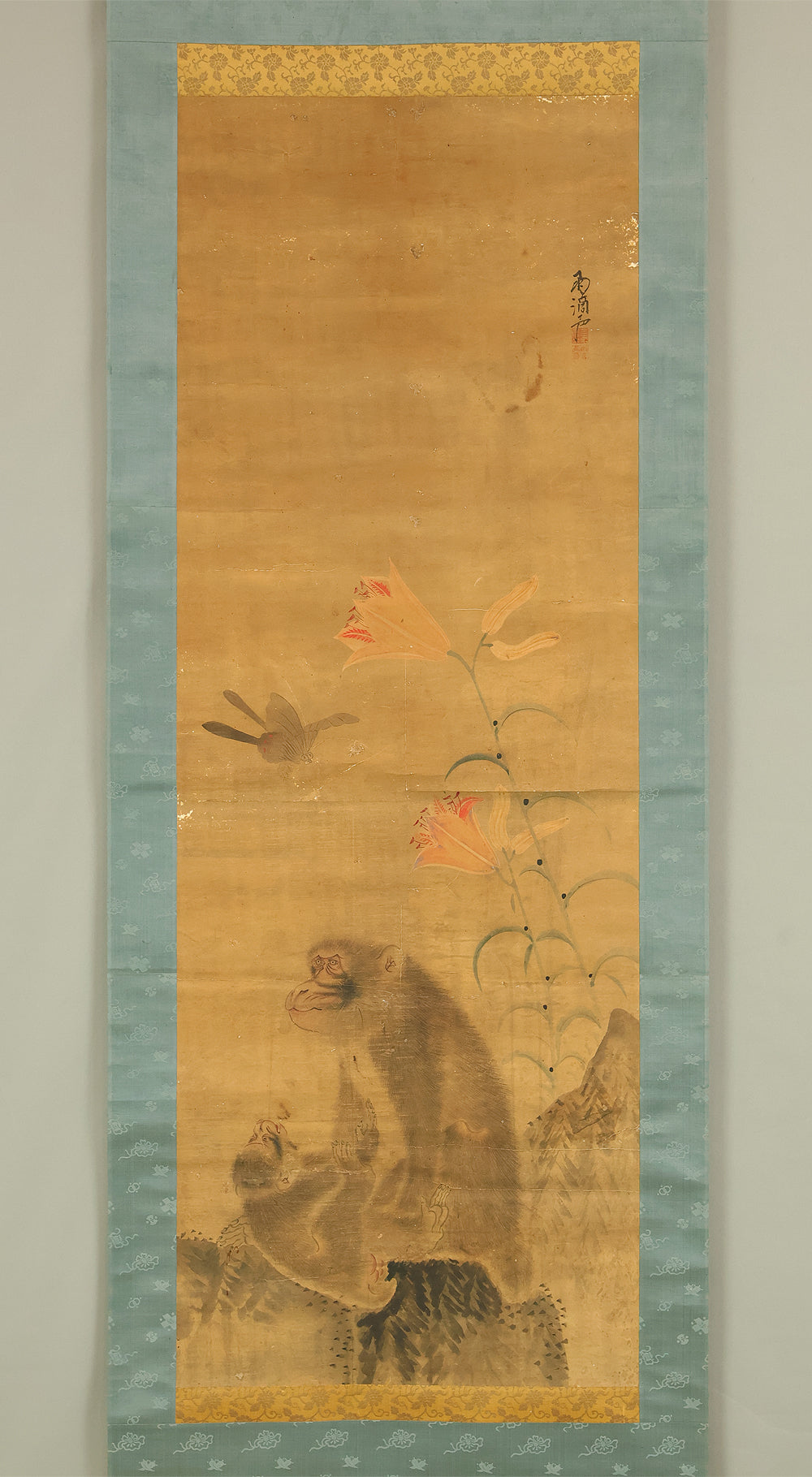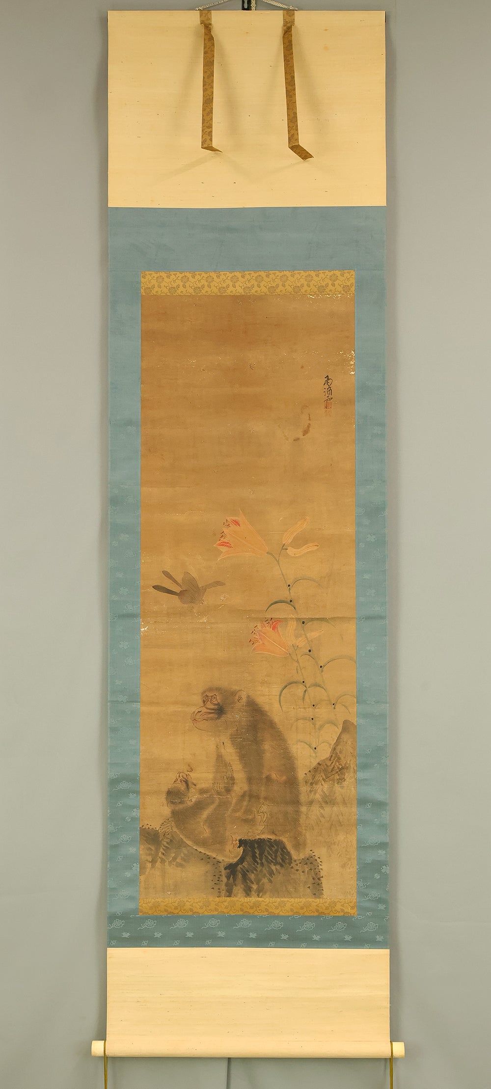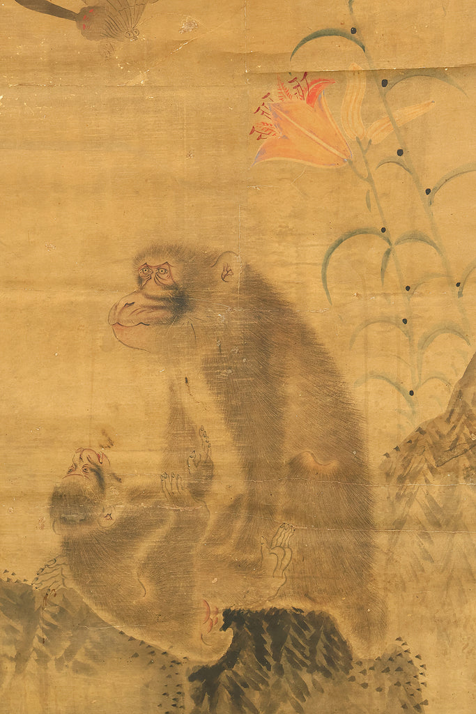 雨滴声 Utekisei Japanese antique art kakejiku kakemono wall hanging scroll / Monkey Family and Lily Flower, Butterfly with Box RE412
