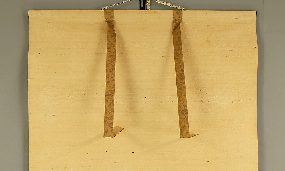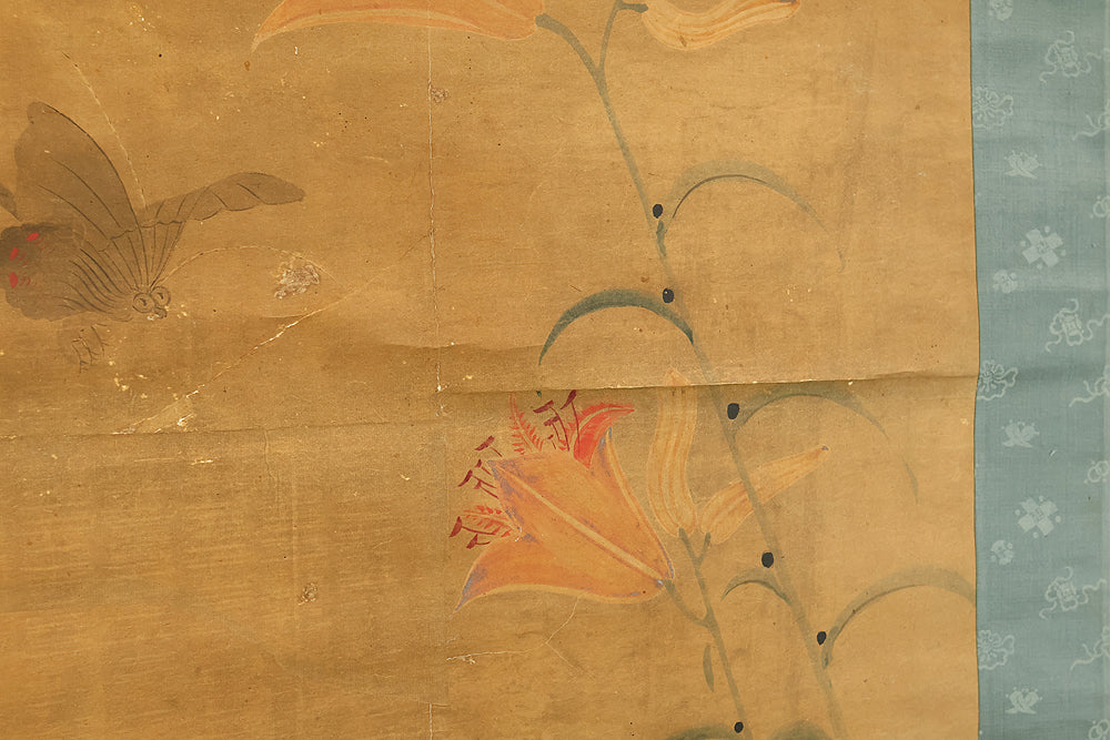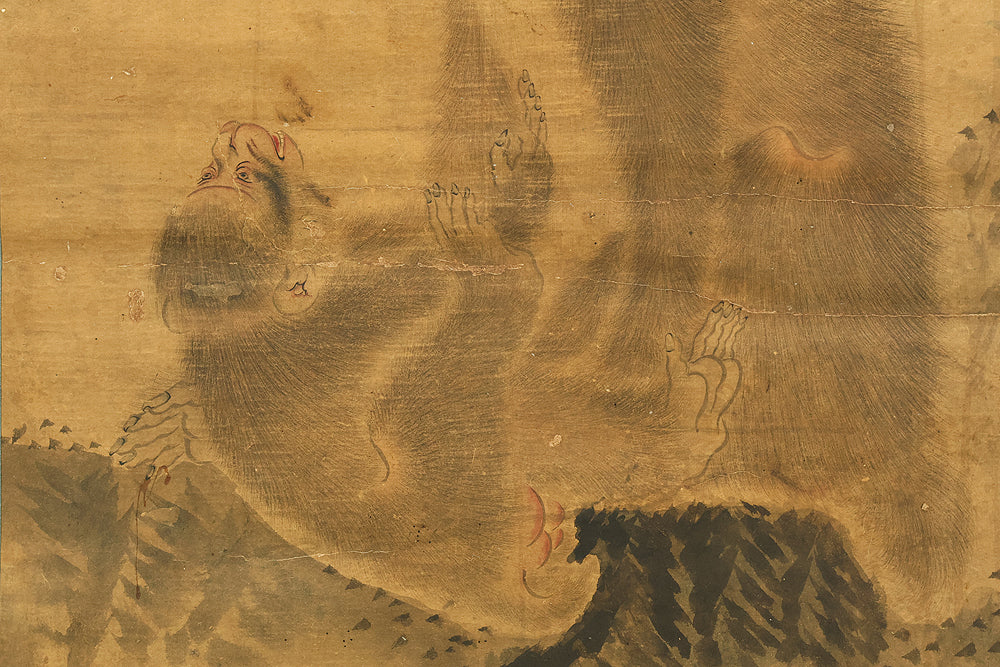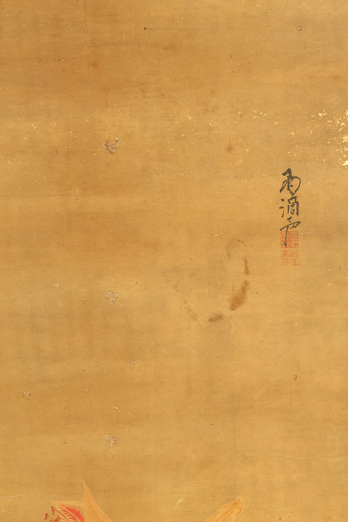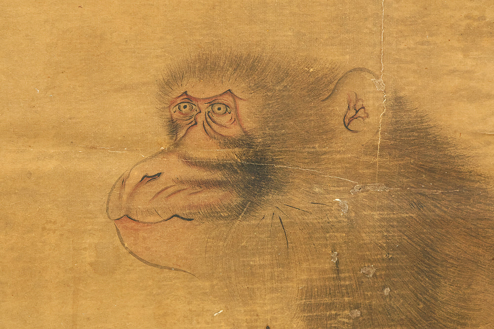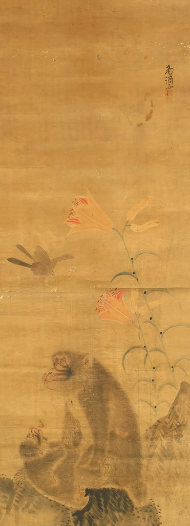 Set against a softly aged ground, this evocative hanging scroll captures an intimate natural vignette in which a monkey and its young rest beneath blooming lilies, while a butterfly drifts lightly through the humid air, suggesting a quiet moment after rainfall. The composition unfolds vertically with gentle restraint, allowing the figures to emerge gradually from the surrounding space, their forms rendered with subdued warmth and humane expression rather than dramatic emphasis. The lilies rise with graceful simplicity, their pale blossoms and curved stems introducing a subtle rhythm that contrasts with the rounded stillness of the monkeys, while the butterfly adds a fleeting sense of motion and seasonal life. The muted palette and softened outlines enhance the contemplative mood, inviting close viewing and reflection, and the presence of the artist’s signature “Utekisei” anchors the work within a personal pictorial voice, while its preservation with an accompanying box underscores the care with which this quietly poetic scene has been valued and transmitted over time.