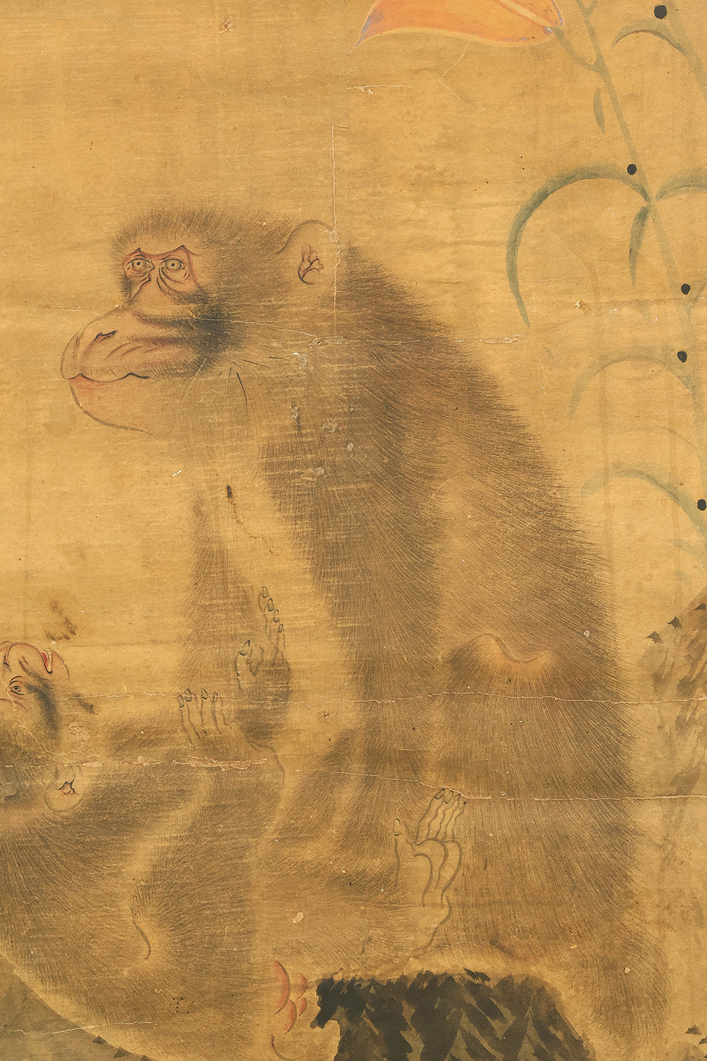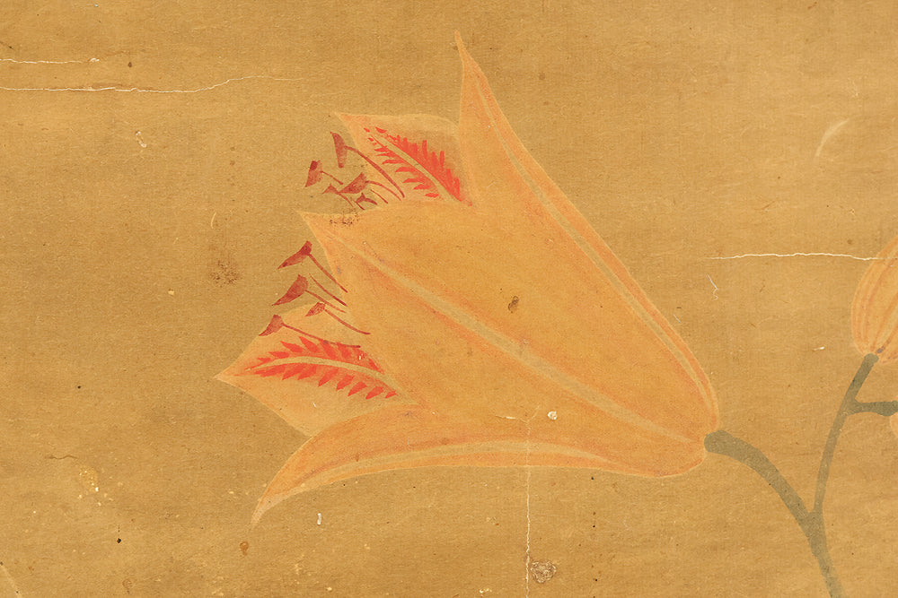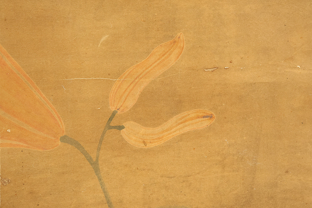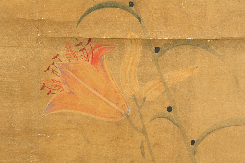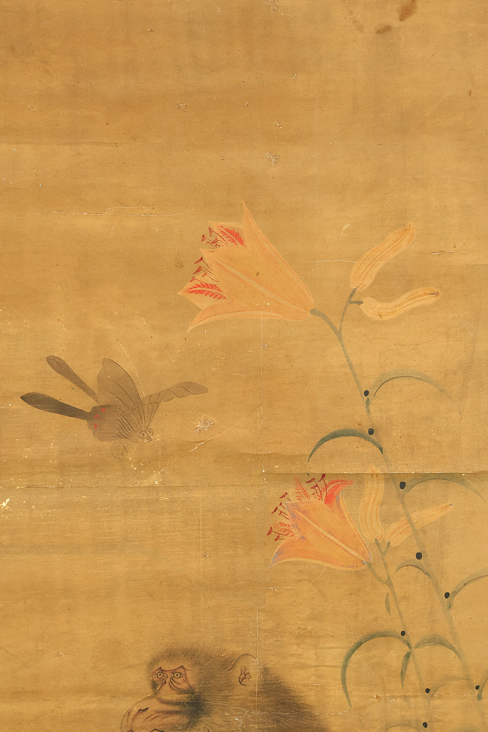 Set against a softly aged ground, this evocative hanging scroll captures an intimate natural vignette in which a monkey and its young rest beneath blooming lilies, while a butterfly drifts lightly through the humid air, suggesting a quiet moment after rainfall. The composition unfolds vertically with gentle restraint, allowing the figures to emerge gradually from the surrounding space, their forms rendered with subdued warmth and humane expression rather than dramatic emphasis. The lilies rise with graceful simplicity, their pale blossoms and curved stems introducing a subtle rhythm that contrasts with the rounded stillness of the monkeys, while the butterfly adds a fleeting sense of motion and seasonal life. The muted palette and softened outlines enhance the contemplative mood, inviting close viewing and reflection, and the presence of the artist’s signature “Utekisei” anchors the work within a personal pictorial voice, while its preservation with an accompanying box underscores the care with which this quietly poetic scene has been valued and transmitted over time.