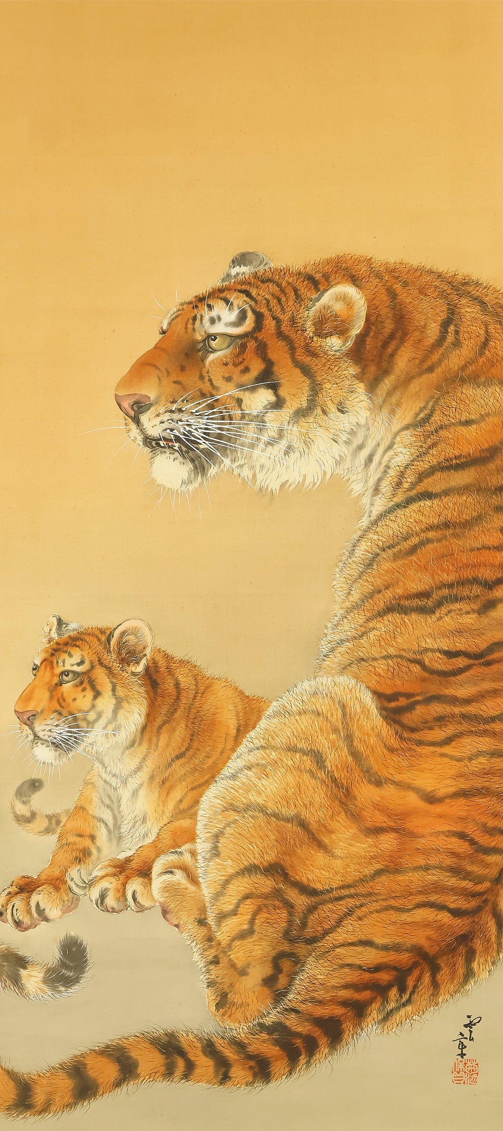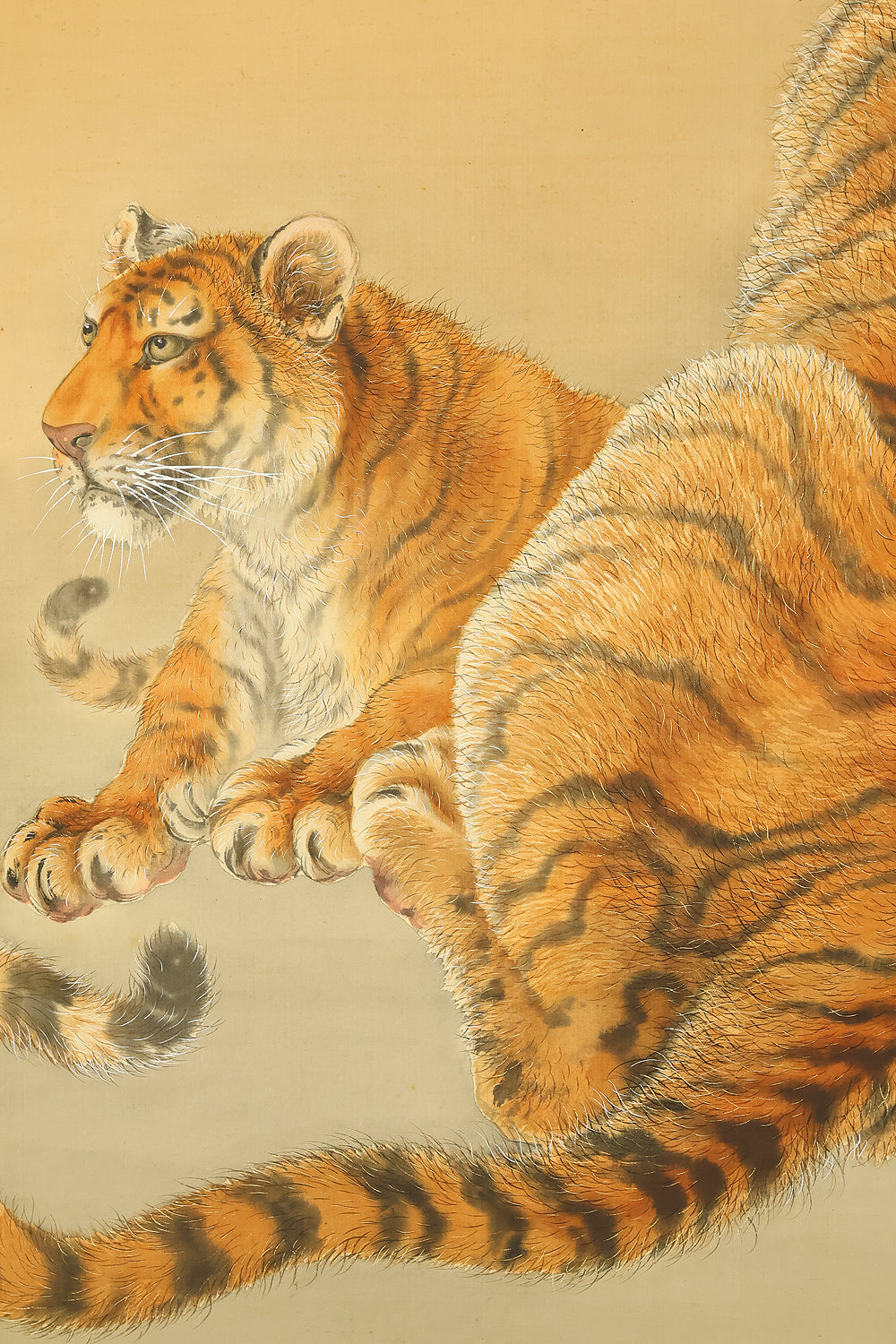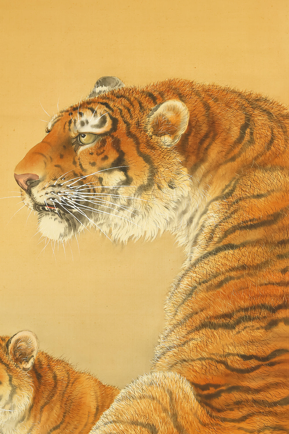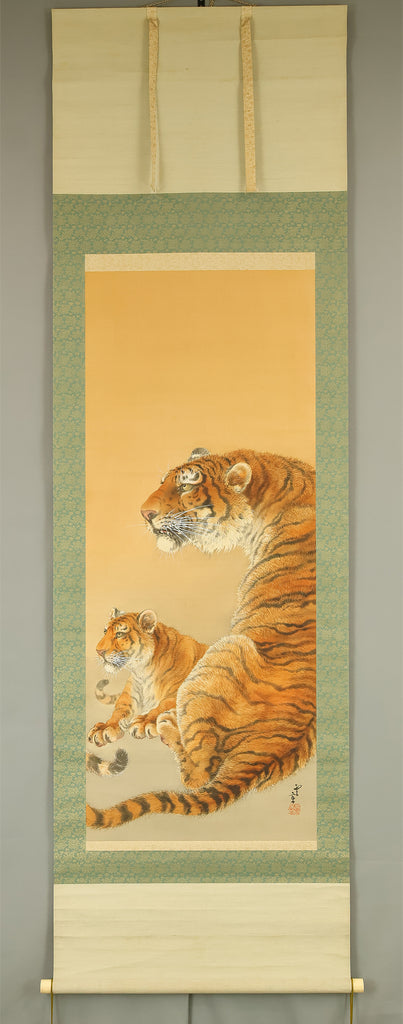 A pair of tigers rests in quiet companionship in this graceful work signed “Unkyō.” The adult tiger sits with a composed alertness, its gaze turned toward something just beyond the frame, while the cub mirrors the posture with a softer, more curious expression. Their striped forms are rendered with a calm precision, the fur marked by subtle gradations that give warmth and presence to the scene. The background’s gentle glow softens the atmosphere, allowing the figures to stand out without harshness, creating a sense of safety and quiet strength. Unkyō balances realism with tenderness: the adult’s poised dignity and the cub’s gentle dependence form a natural harmony that feels both protective and intimate. As a presence in a living space, the scroll introduces a steadying energy—strength without aggression, warmth without sentimentality. Over time, it has a way of grounding the room, encouraging a sense of stability and quiet confidence, much like the calm vigilance of the tiger itself.