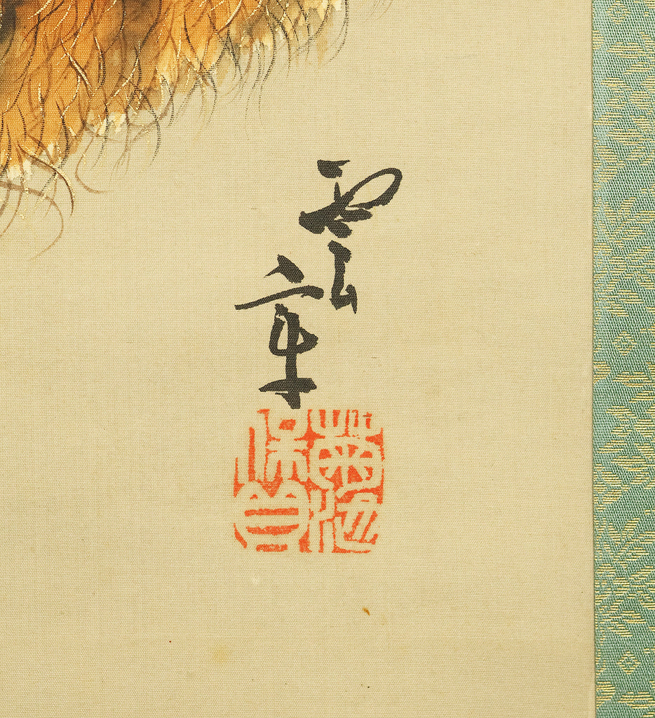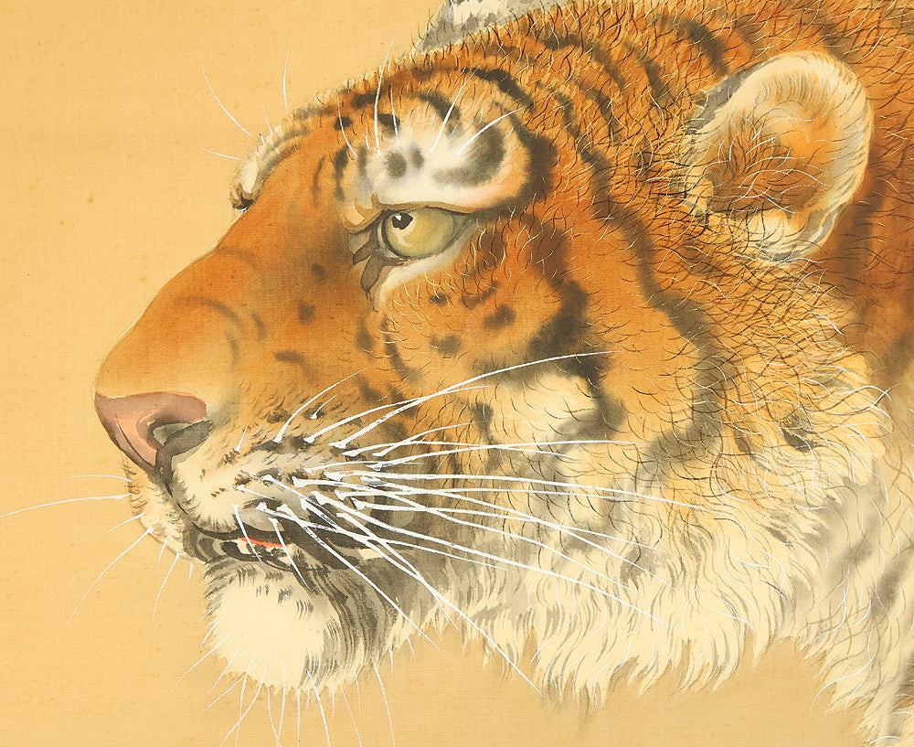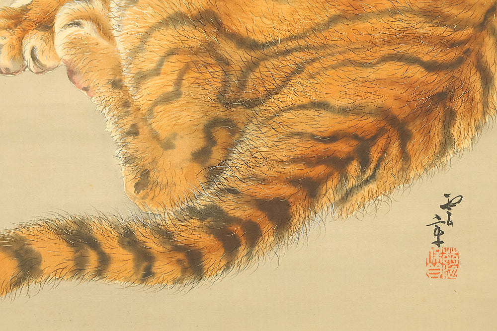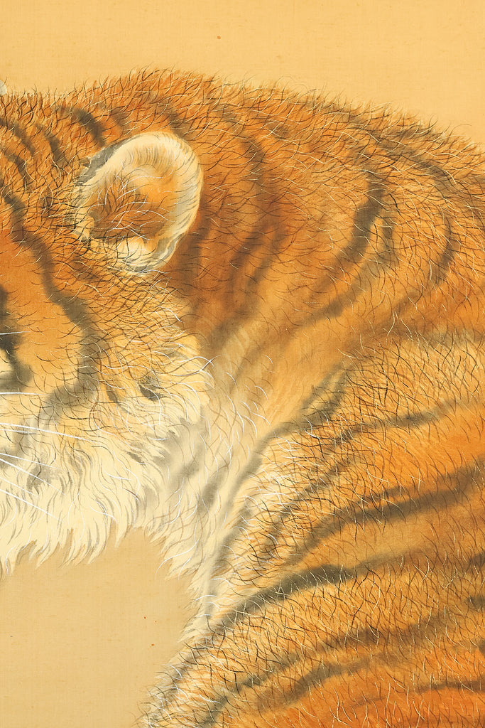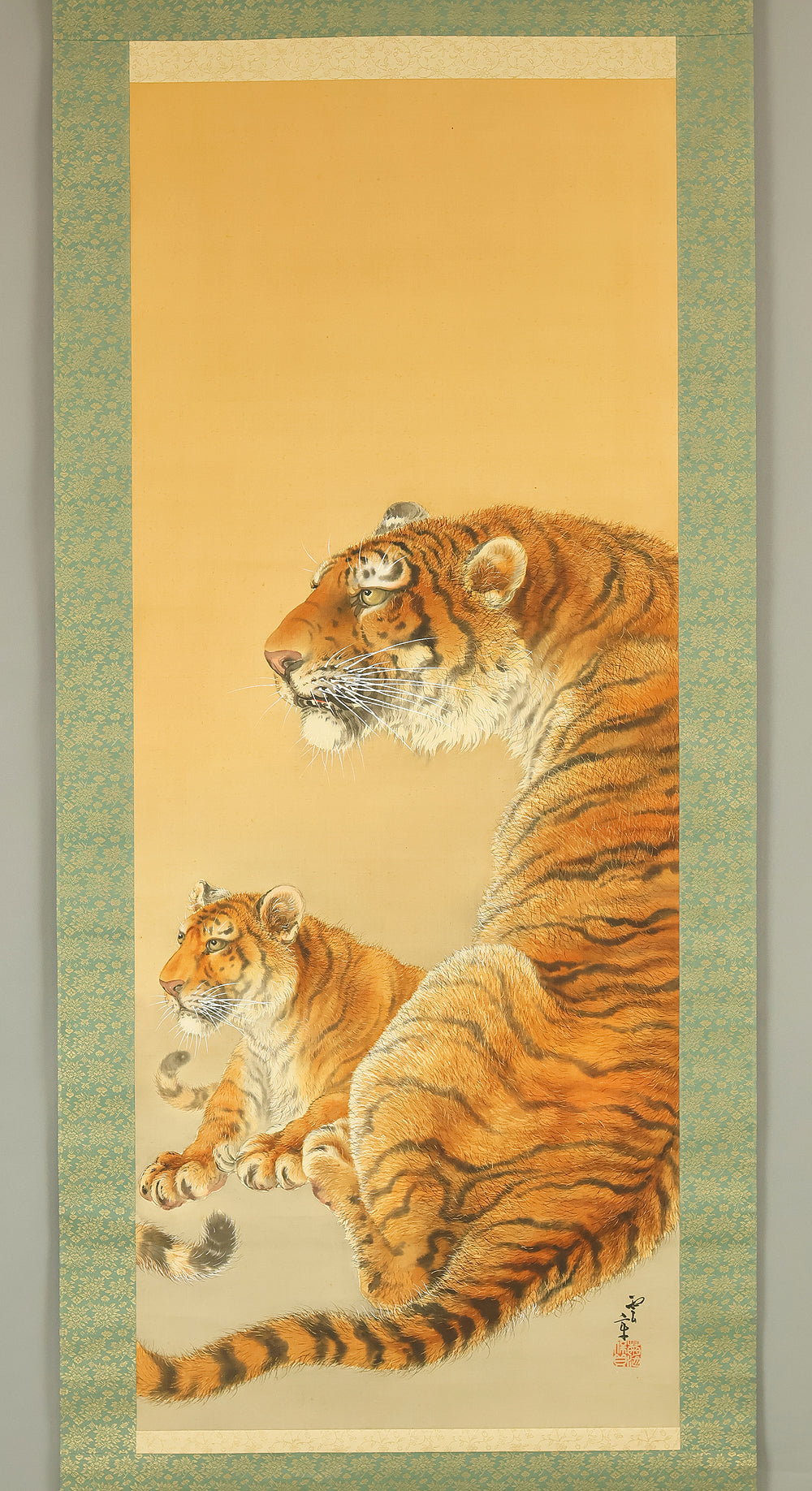 A pair of tigers rests in quiet companionship in this graceful work signed “Unkyō.” The adult tiger sits with a composed alertness, its gaze turned toward something just beyond the frame, while the cub mirrors the posture with a softer, more curious expression. Their striped forms are rendered with a calm precision, the fur marked by subtle gradations that give warmth and presence to the scene. The background’s gentle glow softens the atmosphere, allowing the figures to stand out without harshness, creating a sense of safety and quiet strength. Unkyō balances realism with tenderness: the adult’s poised dignity and the cub’s gentle dependence form a natural harmony that feels both protective and intimate. As a presence in a living space, the scroll introduces a steadying energy—strength without aggression, warmth without sentimentality. Over time, it has a way of grounding the room, encouraging a sense of stability and quiet confidence, much like the calm vigilance of the tiger itself.