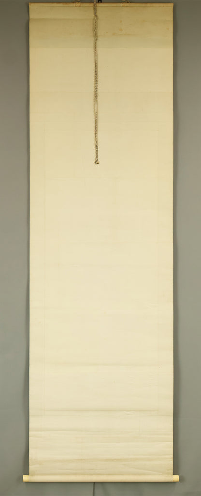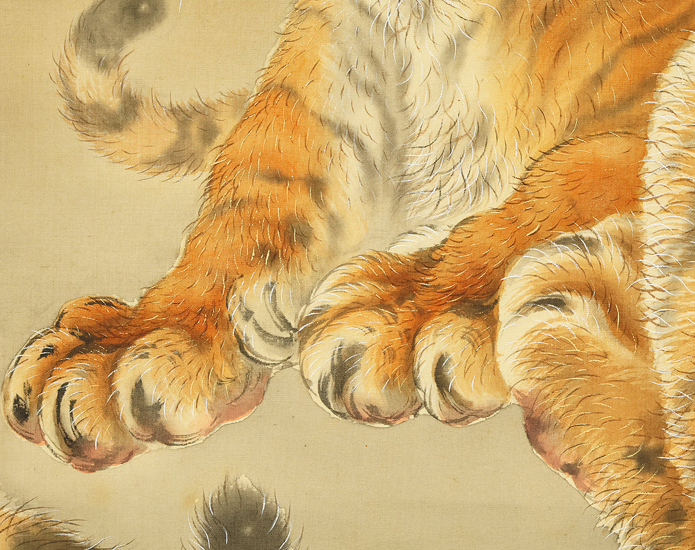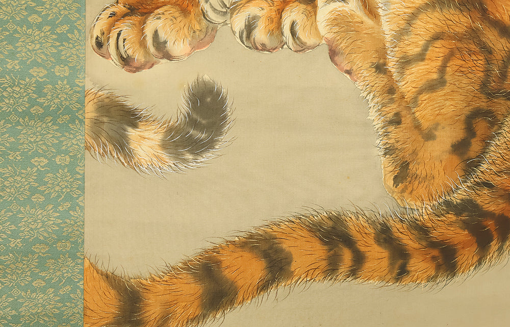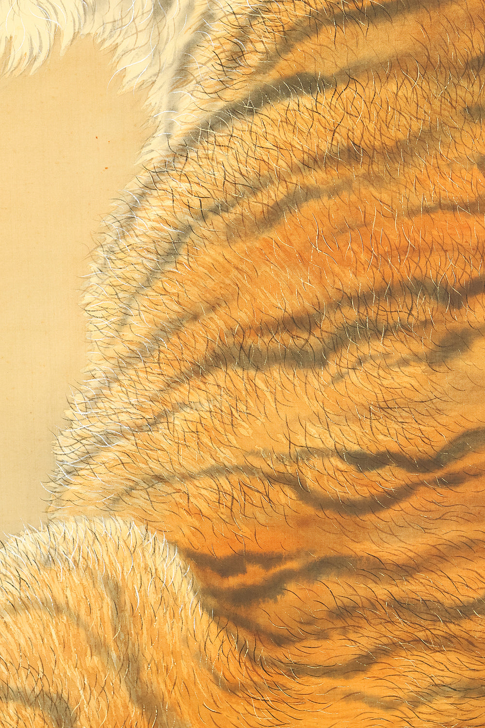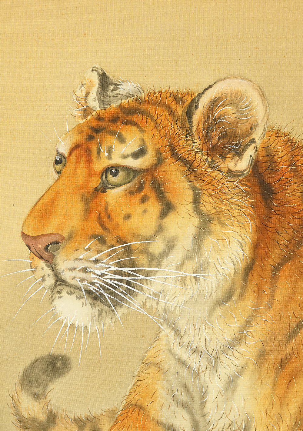 A pair of tigers rests in quiet companionship in this graceful work signed “Unkyō.” The adult tiger sits with a composed alertness, its gaze turned toward something just beyond the frame, while the cub mirrors the posture with a softer, more curious expression. Their striped forms are rendered with a calm precision, the fur marked by subtle gradations that give warmth and presence to the scene. The background’s gentle glow softens the atmosphere, allowing the figures to stand out without harshness, creating a sense of safety and quiet strength. Unkyō balances realism with tenderness: the adult’s poised dignity and the cub’s gentle dependence form a natural harmony that feels both protective and intimate. As a presence in a living space, the scroll introduces a steadying energy—strength without aggression, warmth without sentimentality. Over time, it has a way of grounding the room, encouraging a sense of stability and quiet confidence, much like the calm vigilance of the tiger itself.