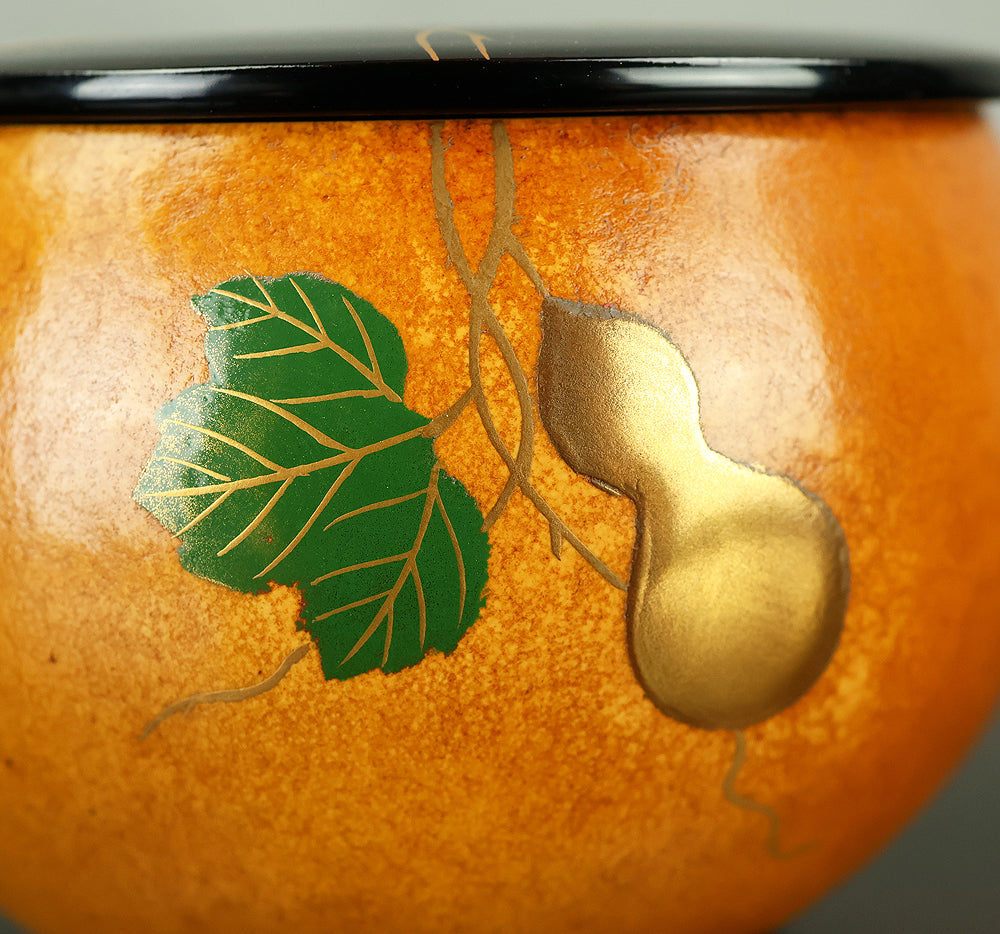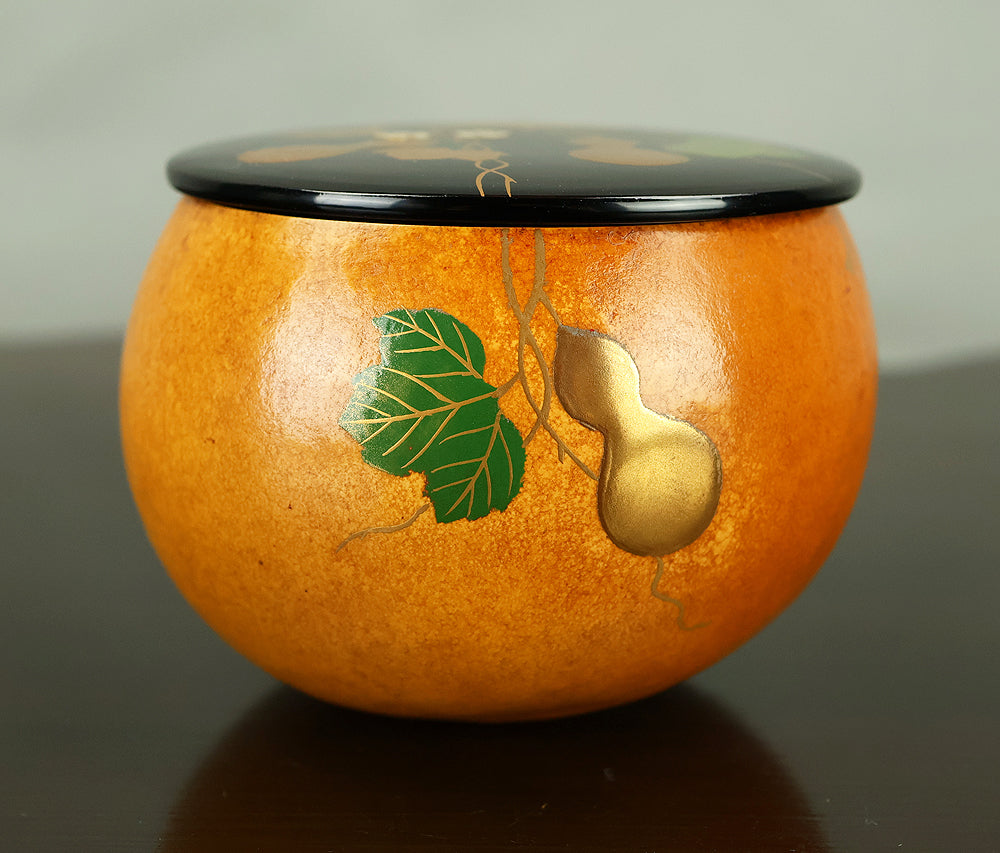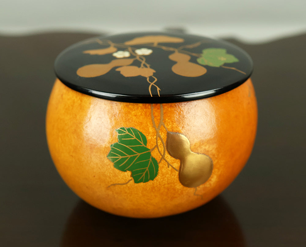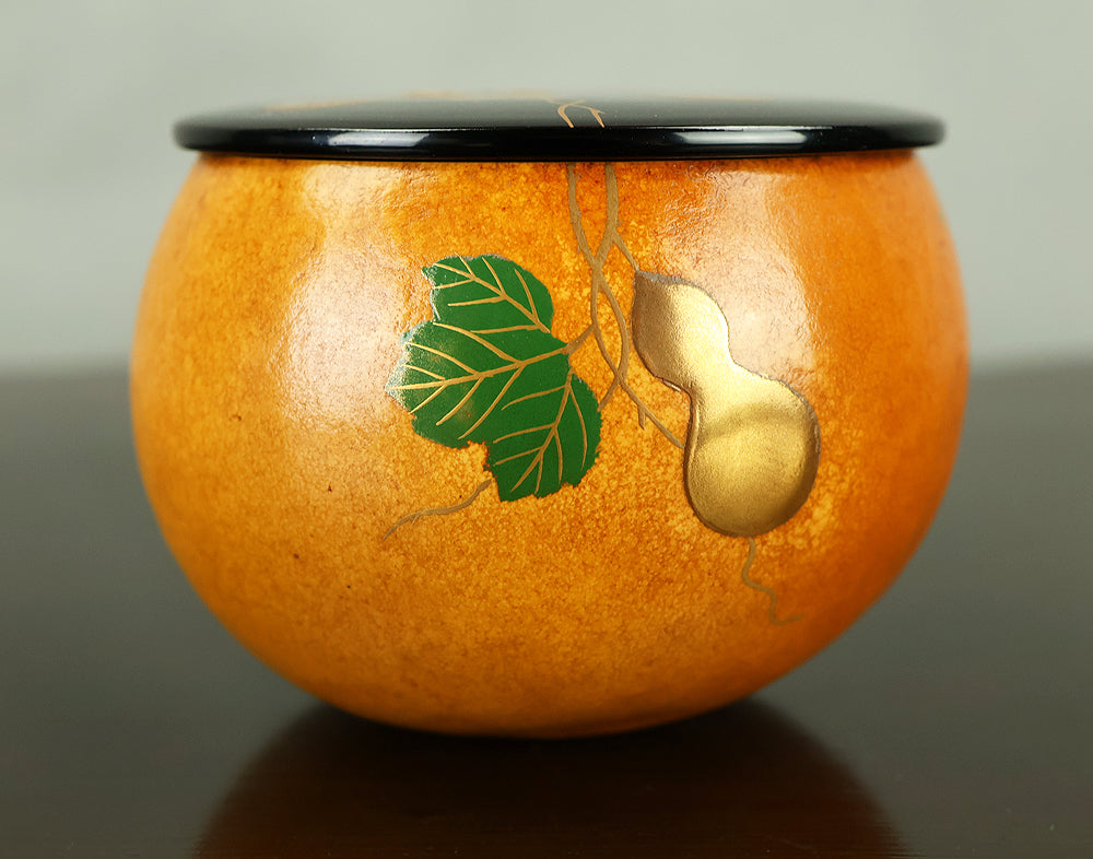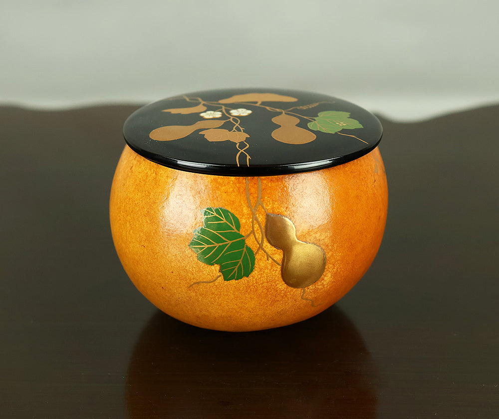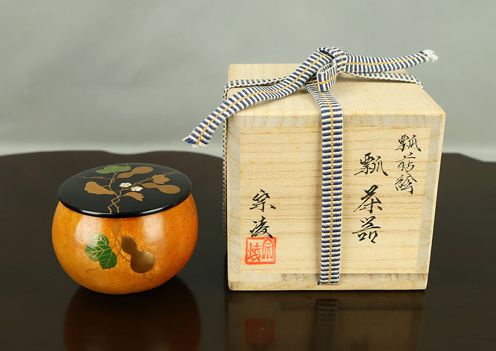 This refined natsume tea caddy is decorated with an elegant gourd (hyōtan) motif, rendered in makie gold lacquer against a warm, softly textured ground. The rounded form is harmoniously proportioned, and the design flows naturally around the surface, combining gold gourds with delicately detailed leaves and vines. The contrast between the lustrous black lacquered lid and the richly toned body enhances the visual depth, while the makie work displays controlled precision and subtle variation, allowing the motif to appear both decorative and symbolic. Gourds have long been associated in Japanese culture with good fortune, protection, and continuity, making this piece particularly well suited for use in the tea ceremony, where auspicious imagery and quiet refinement are valued. The work is by Tanaka Sōryō, a respected maker of tea ceremony utensils, and is accompanied by its original tomobako, bearing an inscription that attests to the piece’s authenticity. Measuring approximately 7.2 cm in height and 5.4 cm in diameter, this natsume combines practical function with refined aesthetics, offering a graceful presence suitable for both use and display within the context of chanoyu.
