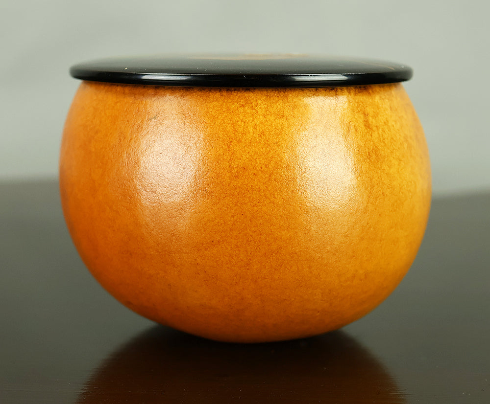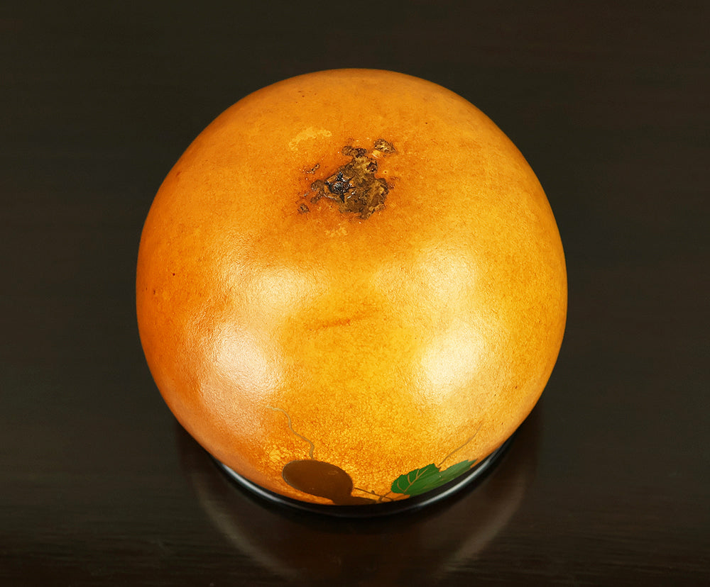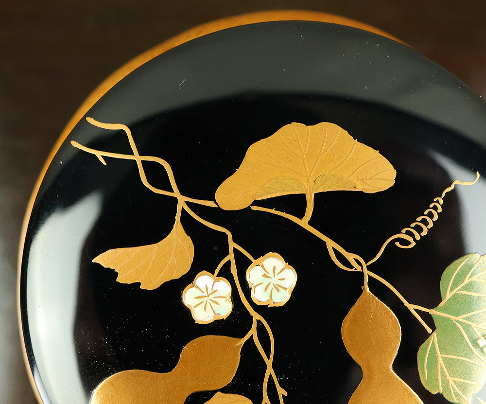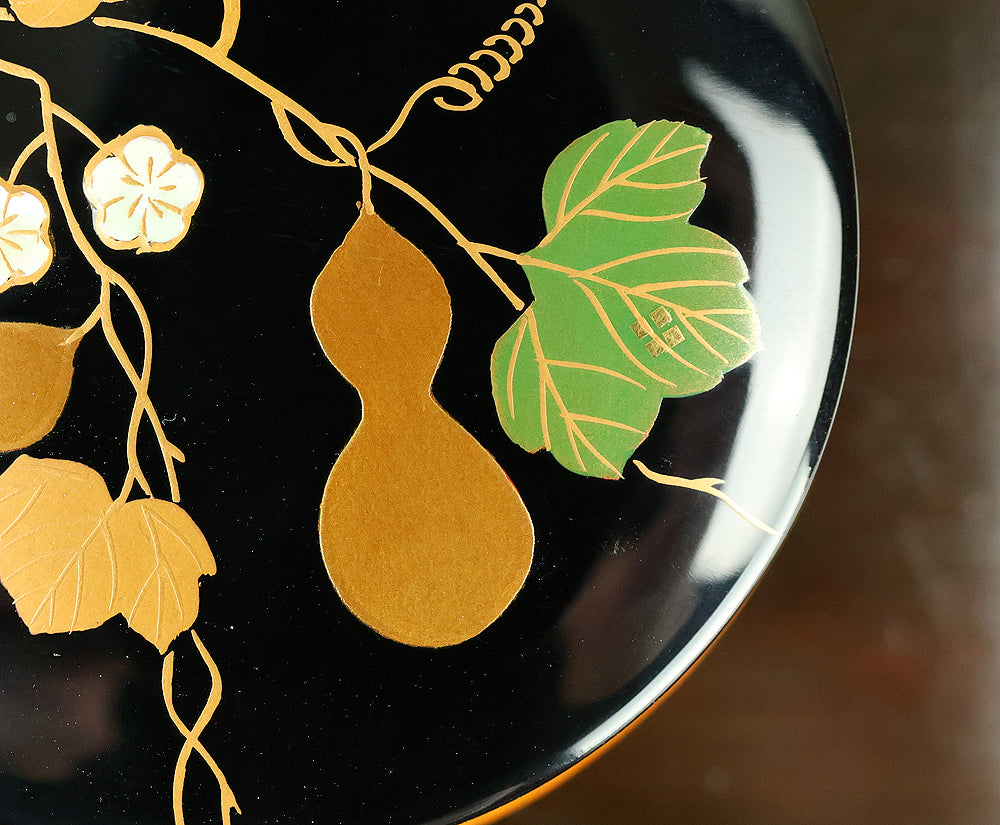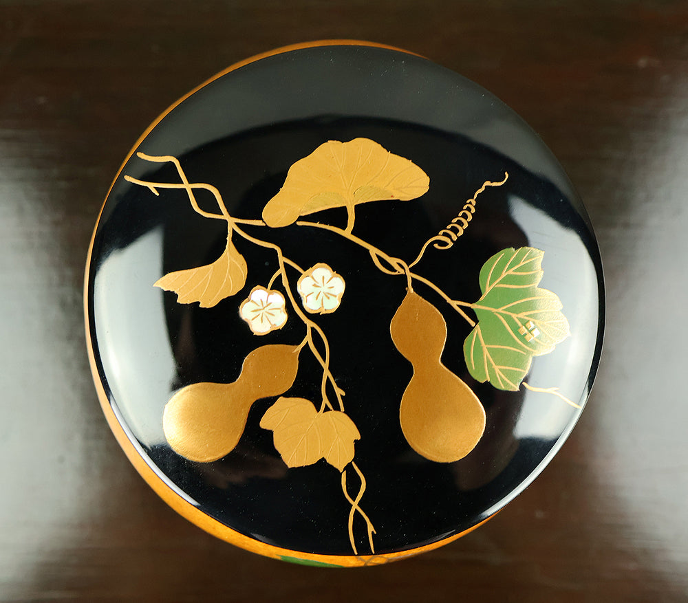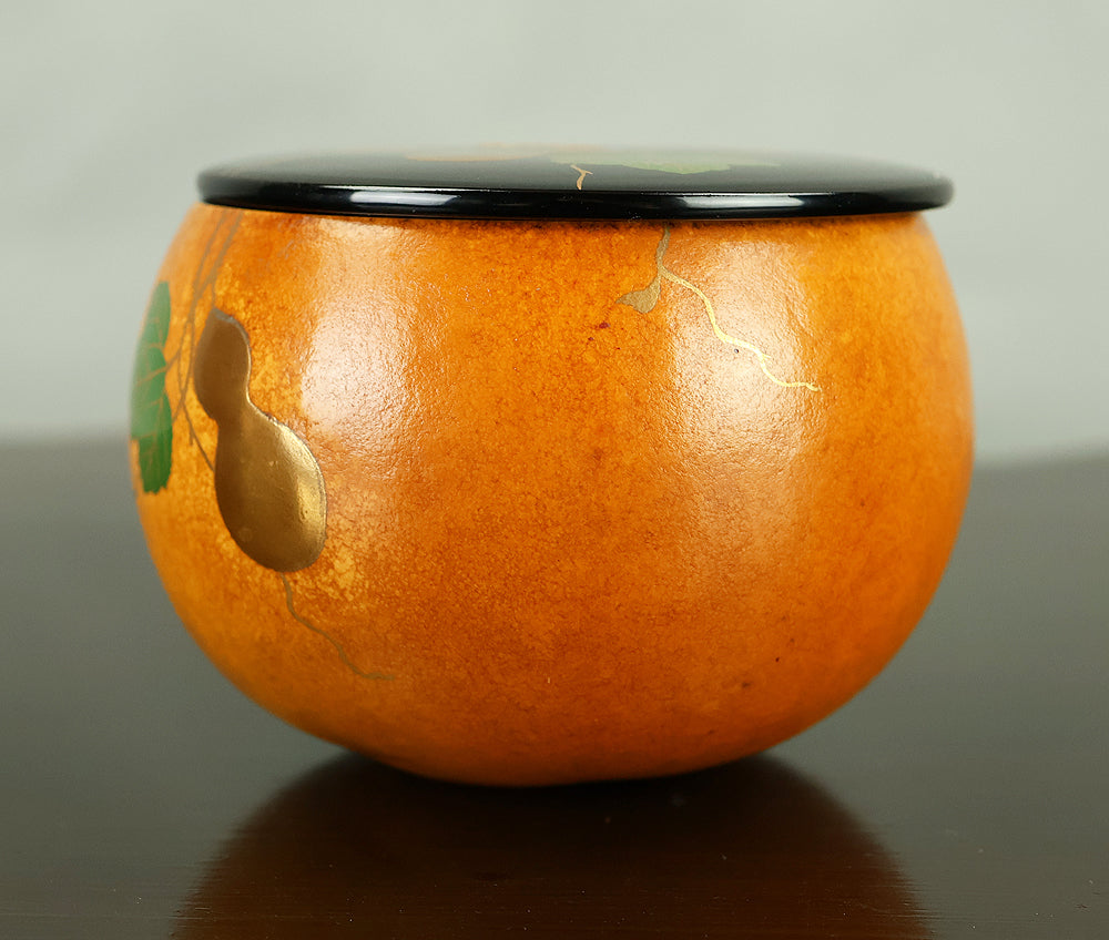 This refined natsume tea caddy is decorated with an elegant gourd (hyōtan) motif, rendered in makie gold lacquer against a warm, softly textured ground. The rounded form is harmoniously proportioned, and the design flows naturally around the surface, combining gold gourds with delicately detailed leaves and vines. The contrast between the lustrous black lacquered lid and the richly toned body enhances the visual depth, while the makie work displays controlled precision and subtle variation, allowing the motif to appear both decorative and symbolic. Gourds have long been associated in Japanese culture with good fortune, protection, and continuity, making this piece particularly well suited for use in the tea ceremony, where auspicious imagery and quiet refinement are valued. The work is by Tanaka Sōryō, a respected maker of tea ceremony utensils, and is accompanied by its original tomobako, bearing an inscription that attests to the piece’s authenticity. Measuring approximately 7.2 cm in height and 5.4 cm in diameter, this natsume combines practical function with refined aesthetics, offering a graceful presence suitable for both use and display within the context of chanoyu.