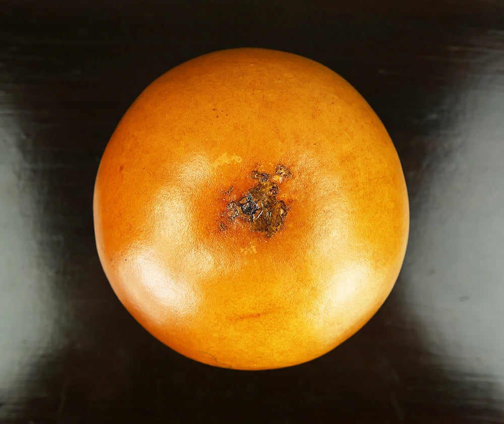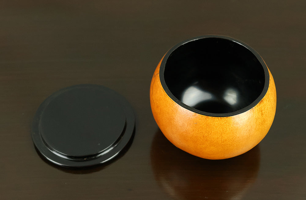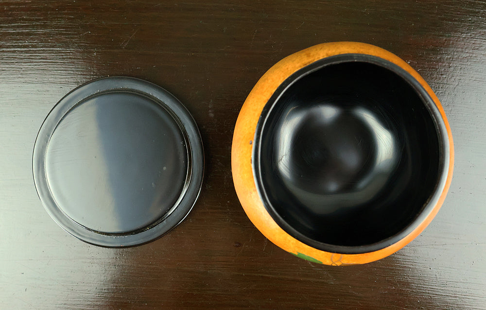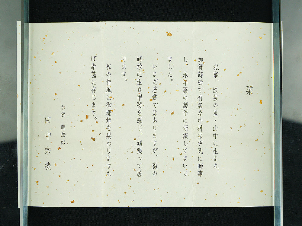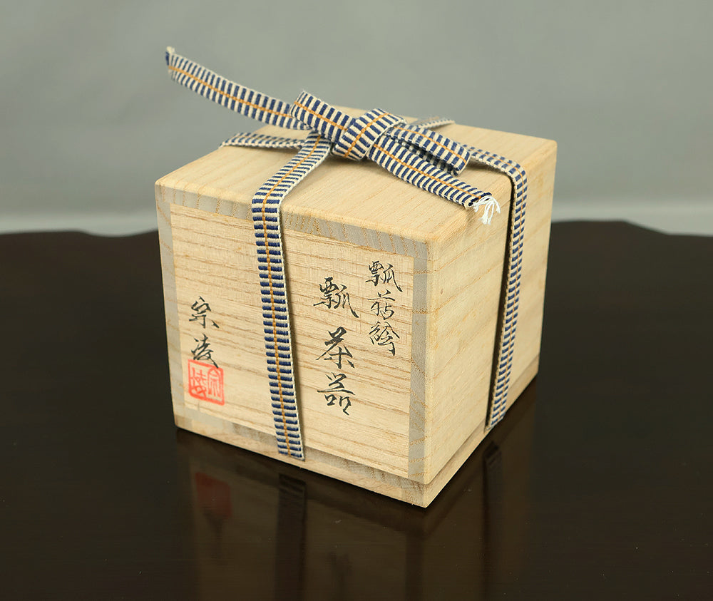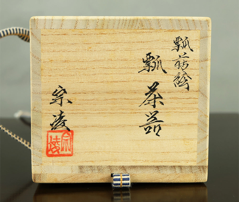 This refined natsume tea caddy is decorated with an elegant gourd (hyōtan) motif, rendered in makie gold lacquer against a warm, softly textured ground. The rounded form is harmoniously proportioned, and the design flows naturally around the surface, combining gold gourds with delicately detailed leaves and vines. The contrast between the lustrous black lacquered lid and the richly toned body enhances the visual depth, while the makie work displays controlled precision and subtle variation, allowing the motif to appear both decorative and symbolic. Gourds have long been associated in Japanese culture with good fortune, protection, and continuity, making this piece particularly well suited for use in the tea ceremony, where auspicious imagery and quiet refinement are valued. The work is by Tanaka Sōryō, a respected maker of tea ceremony utensils, and is accompanied by its original tomobako, bearing an inscription that attests to the piece’s authenticity. Measuring approximately 7.2 cm in height and 5.4 cm in diameter, this natsume combines practical function with refined aesthetics, offering a graceful presence suitable for both use and display within the context of chanoyu.