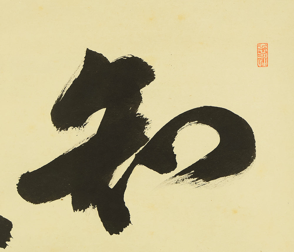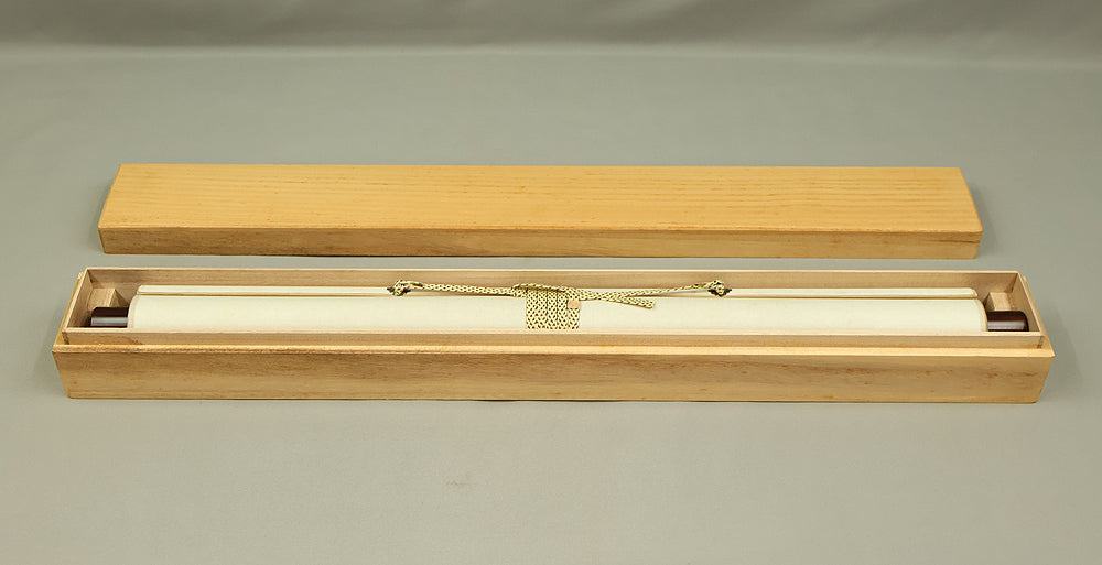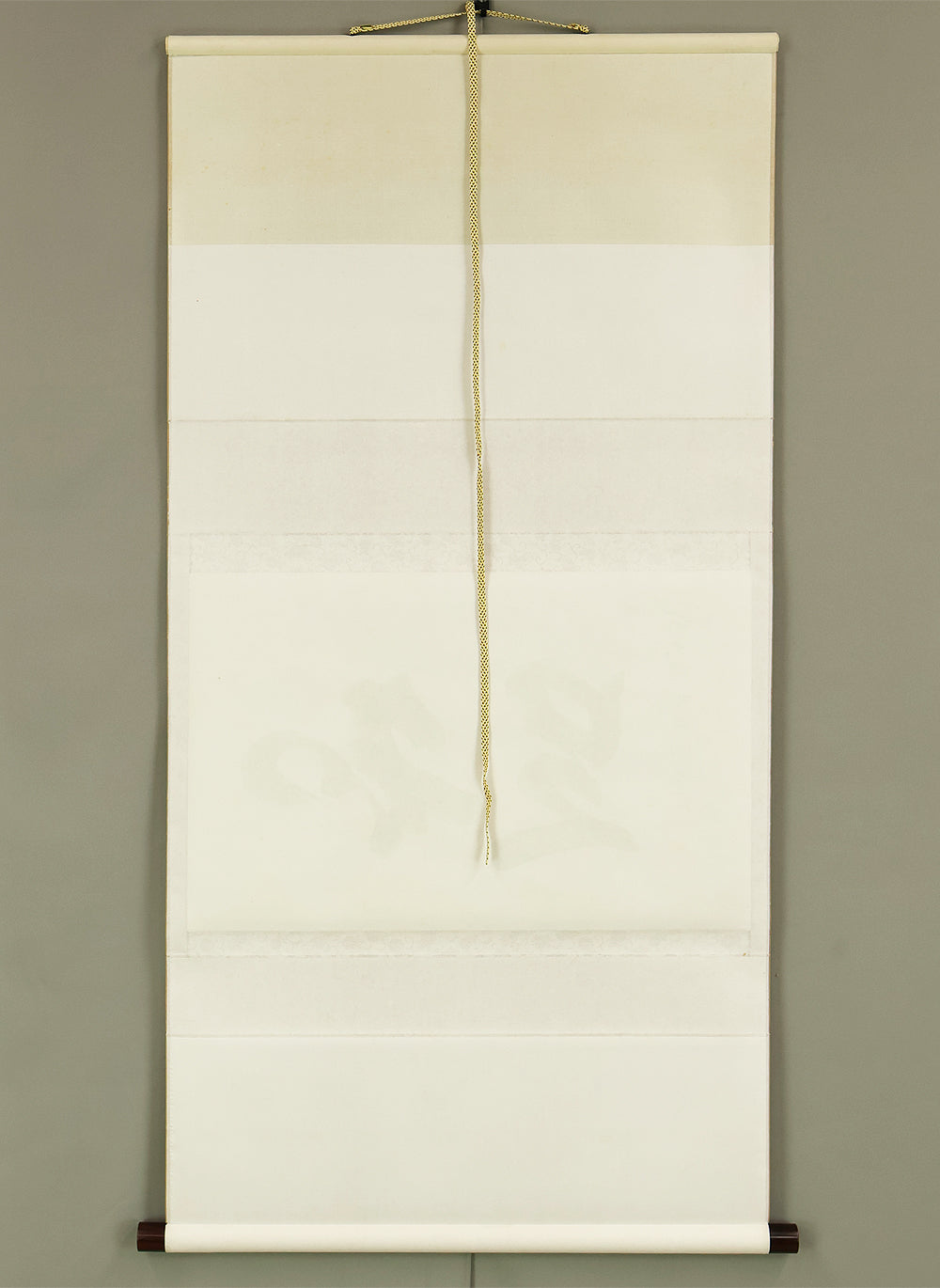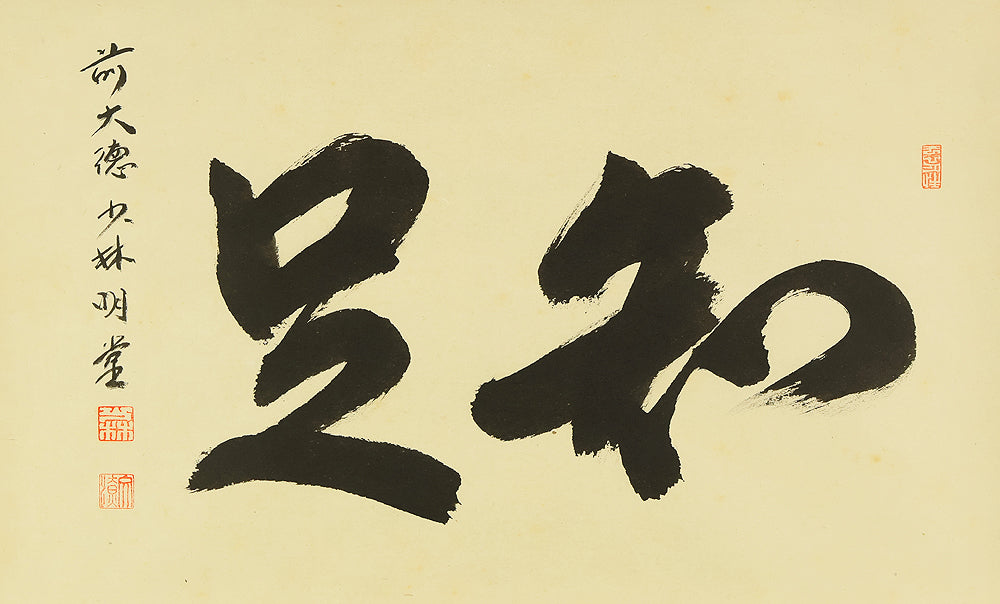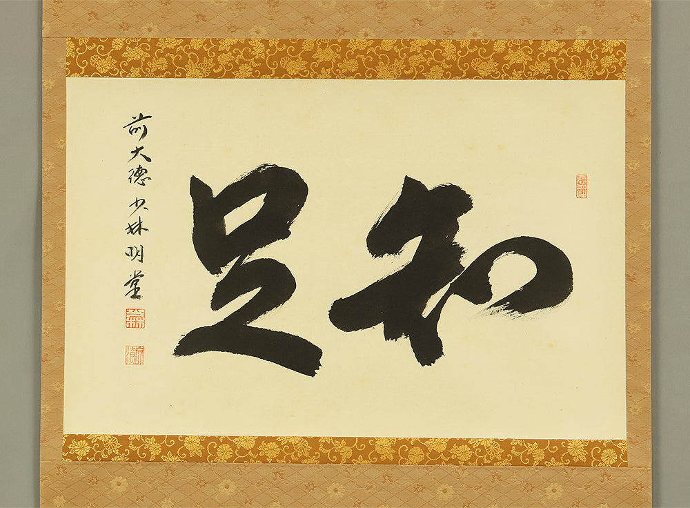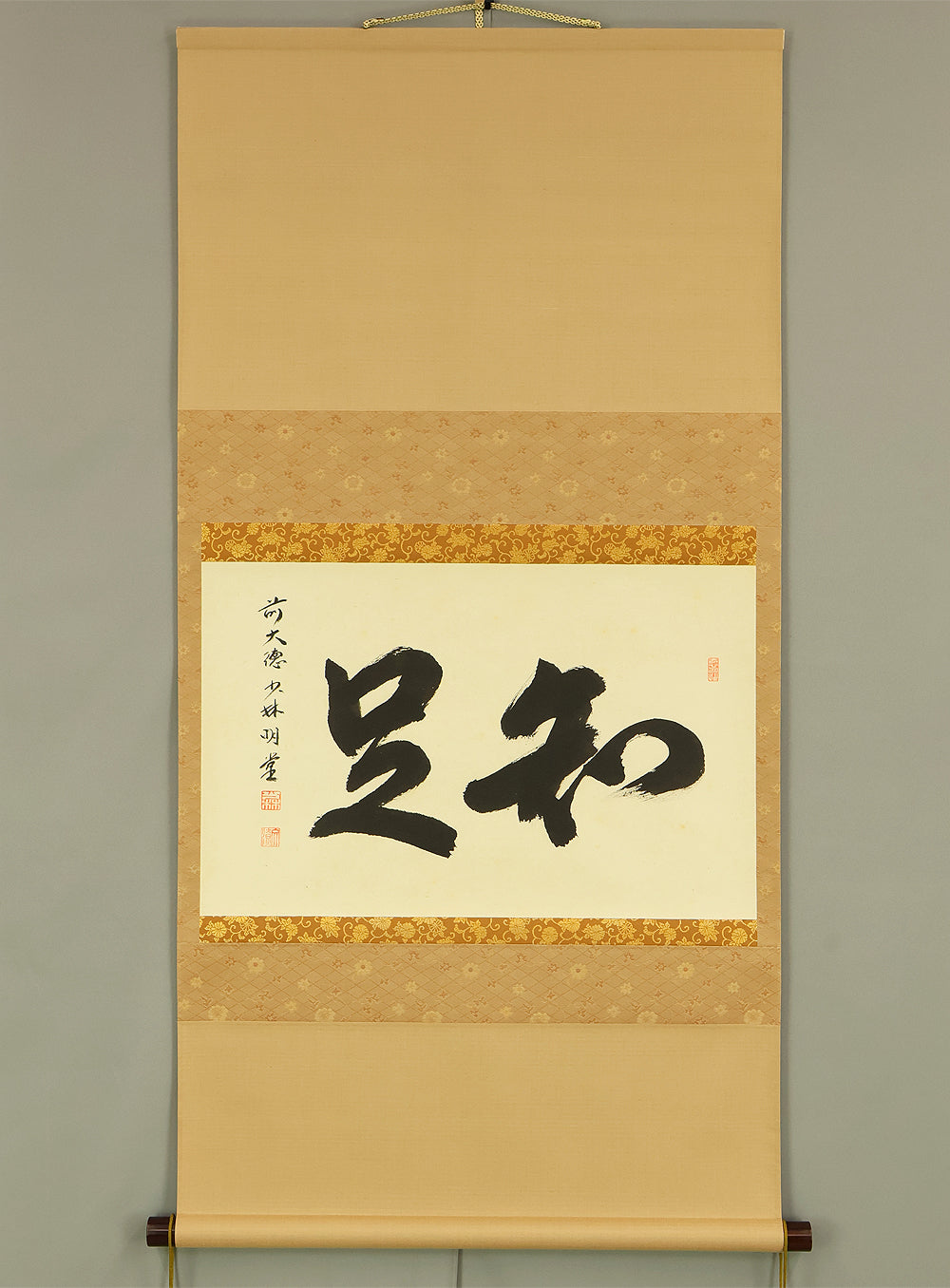 This hanging scroll features the Zen phrase “Chisoku” (知足)—“Knowing sufficiency”—expressed in bold calligraphy by Yokoi Myodo, a respected Zen master affiliated with Daitoku-ji, one of Kyoto’s most prominent Zen temples. The concept of chisoku reflects a core tenet of Zen philosophy: that true contentment arises not from desire, but from recognizing and appreciating what one already has. Rendered with confident brushwork and spiritual clarity, the character embodies both aesthetic strength and contemplative depth. The scroll is mounted in traditional textile borders and comes with a wooden storage box, ensuring careful preservation. Ideal for tea ceremony settings or interior display, this piece offers a quiet yet powerful presence—an invitation to reflect on simplicity, gratitude, and the essence of Zen.