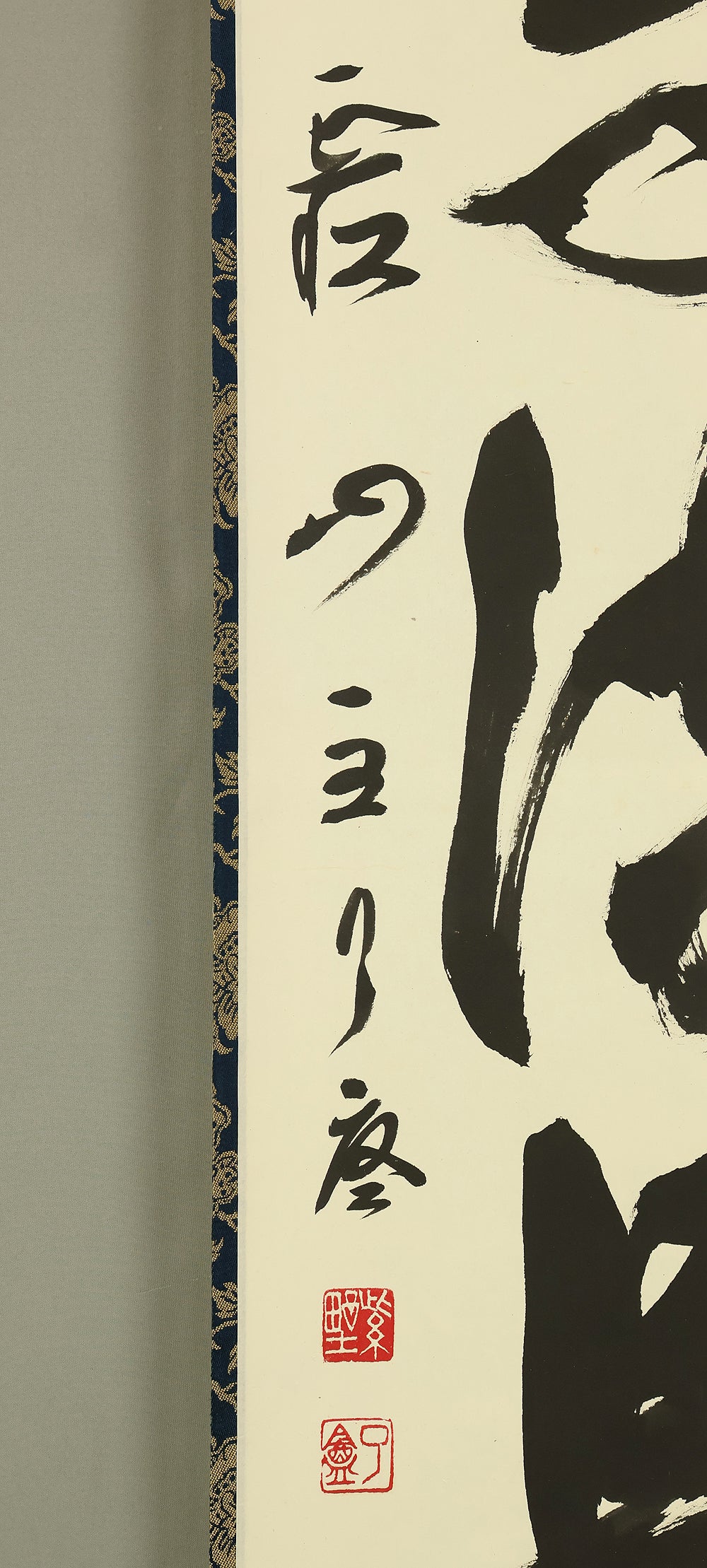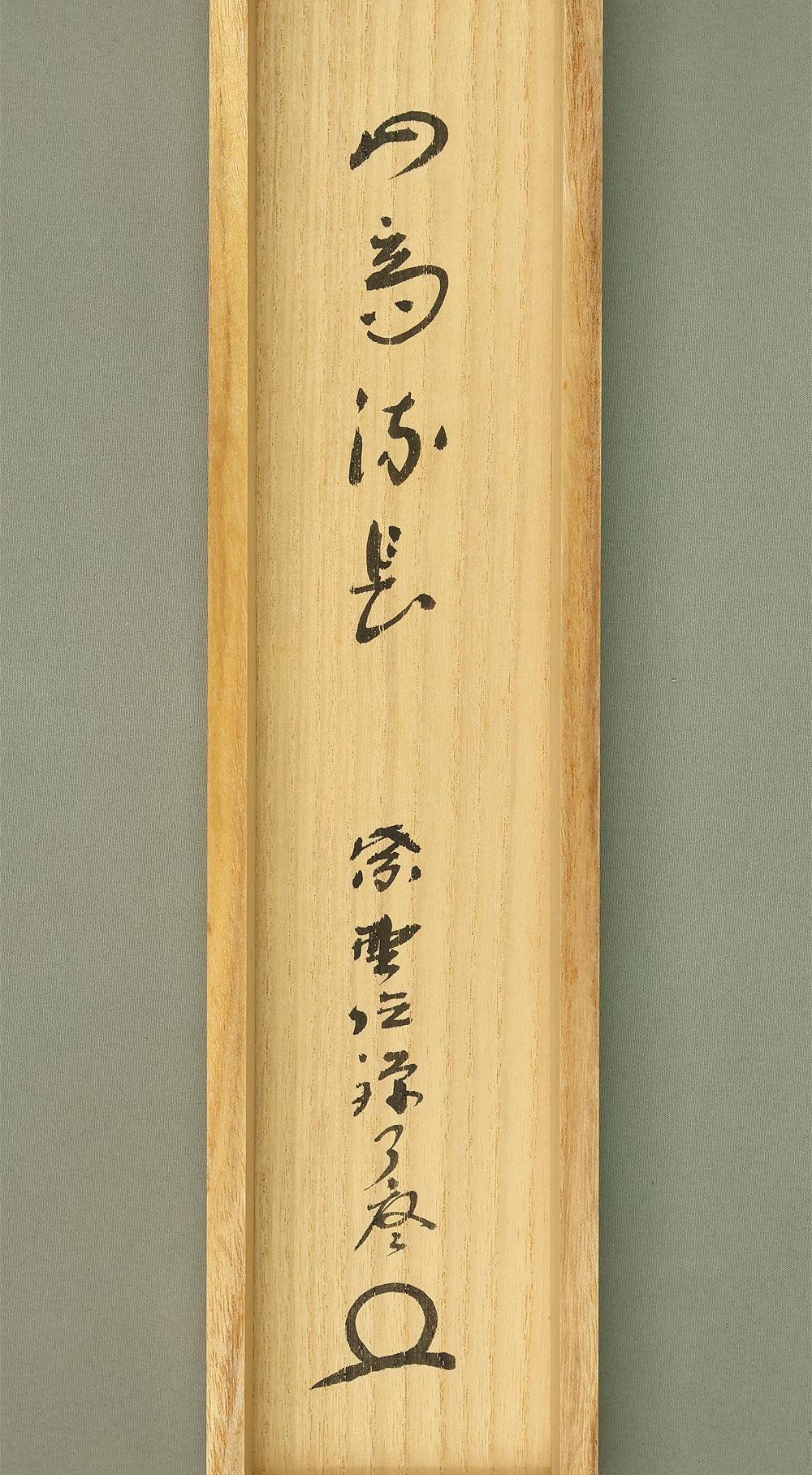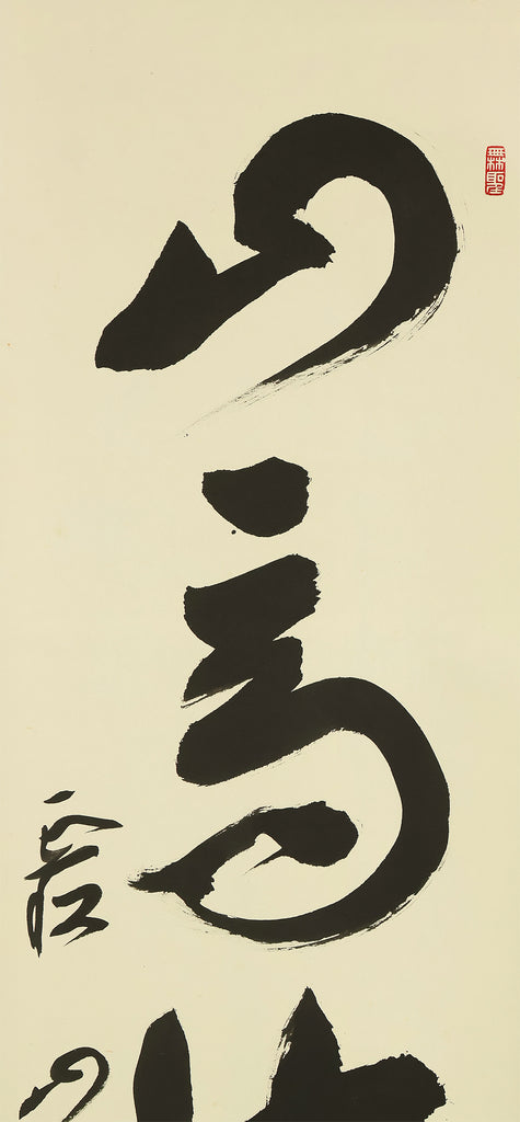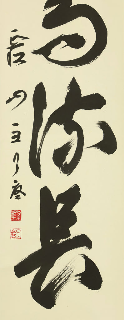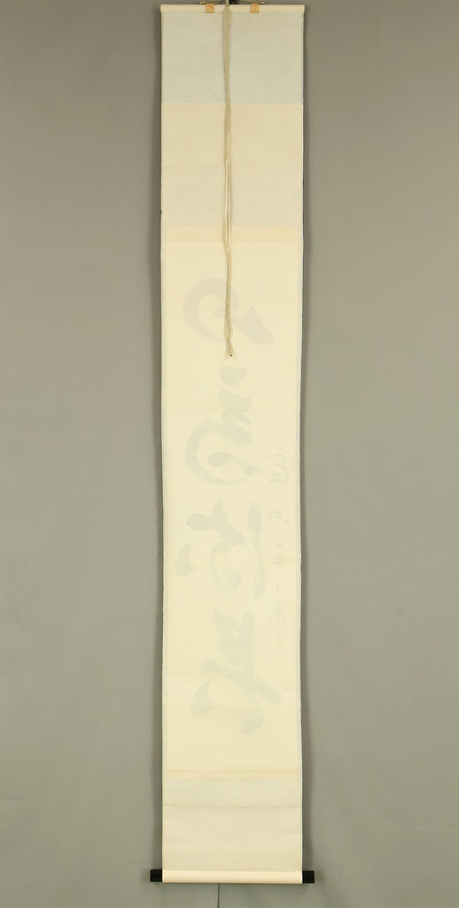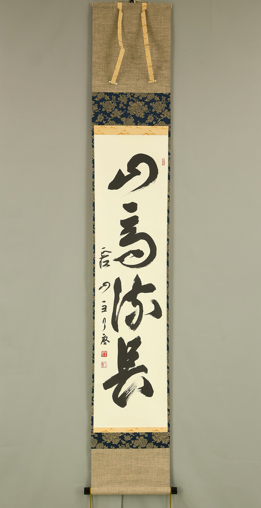 This Zen calligraphy by Tachibana Sogi, head priest of Tokuzen‑ji and known by the art name Ryoan, presents the phrase 山高流長 with a commanding yet unforced clarity. The tall, rising strokes evoke the presence of a sheer mountain ridge, while the sweeping lower movement suggests water flowing without end, creating a rhythm that feels both expansive and quietly disciplined. Sogi’s brushwork carries the steadiness of long training at Daitoku‑ji: each line lands with intention, neither rushed nor embellished, allowing the meaning of the phrase—enduring height, unbroken flow—to emerge through the movement of ink itself. His signature Ryoan and the Murasakino seal anchor the composition with a calm authority, while the deep indigo brocade mounting frames the calligraphy in a way that heightens its sense of spaciousness. Accompanied by its original tomobako, the piece embodies a balance of strength and serenity that reflects the essence of Zen practice captured in a single moment of brush and breath.