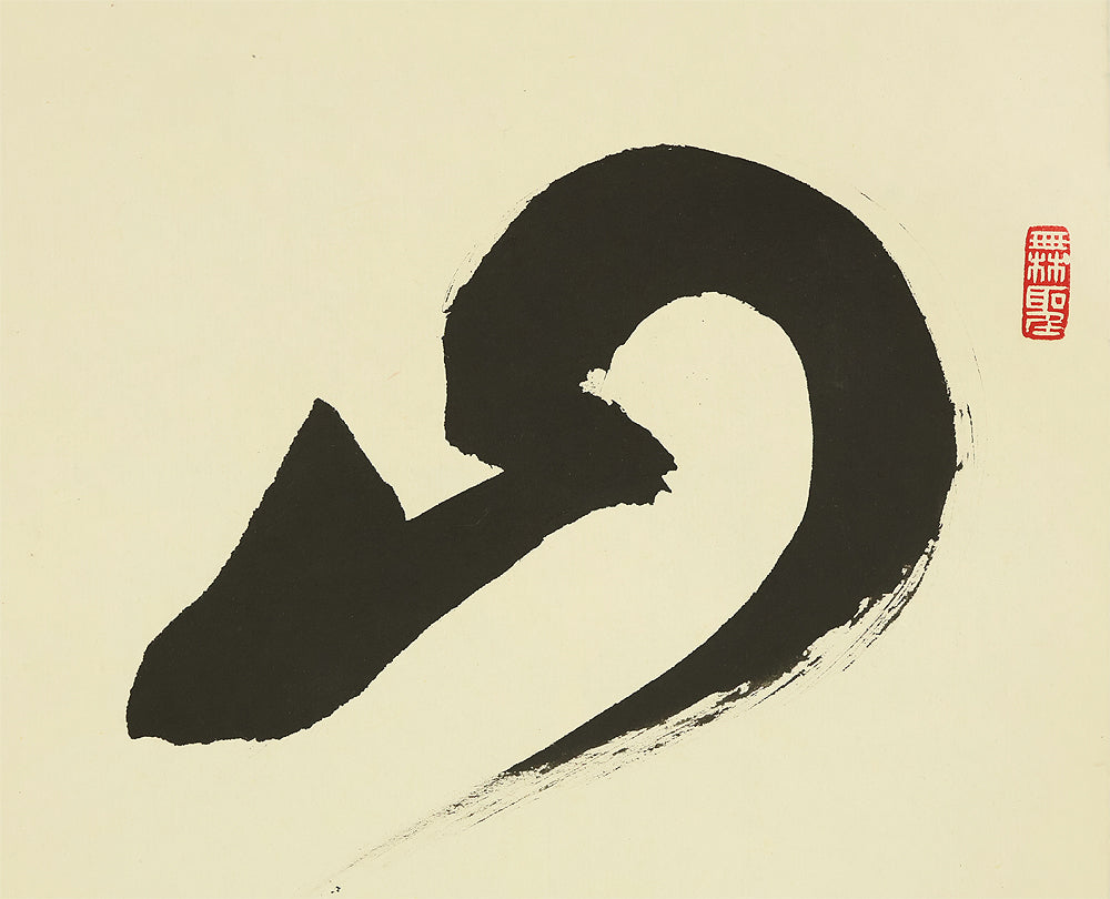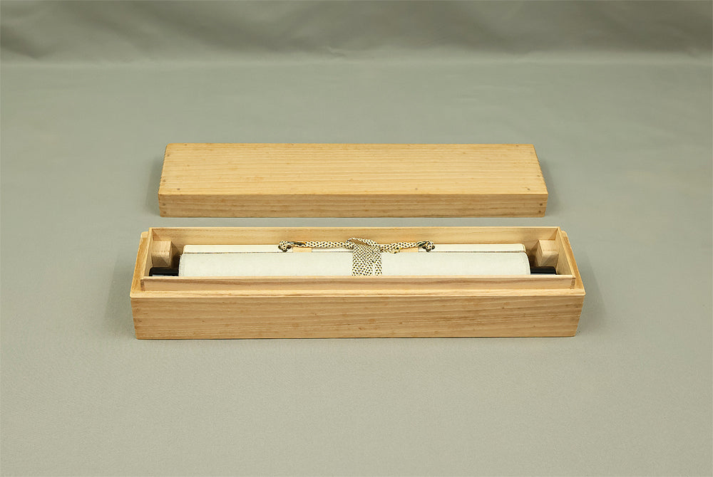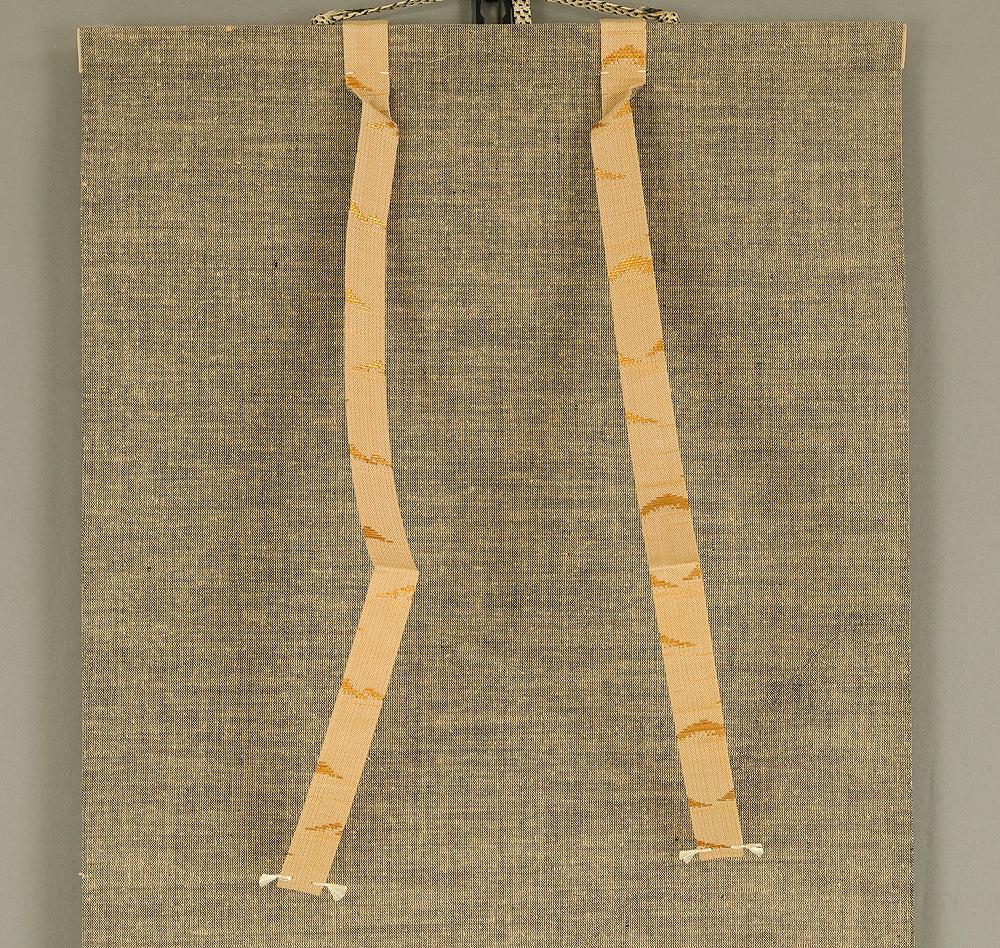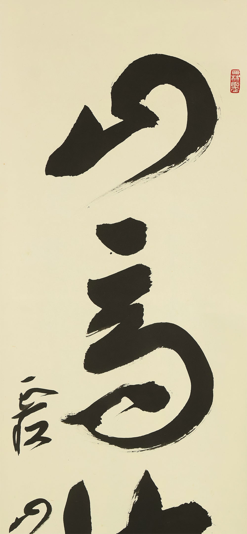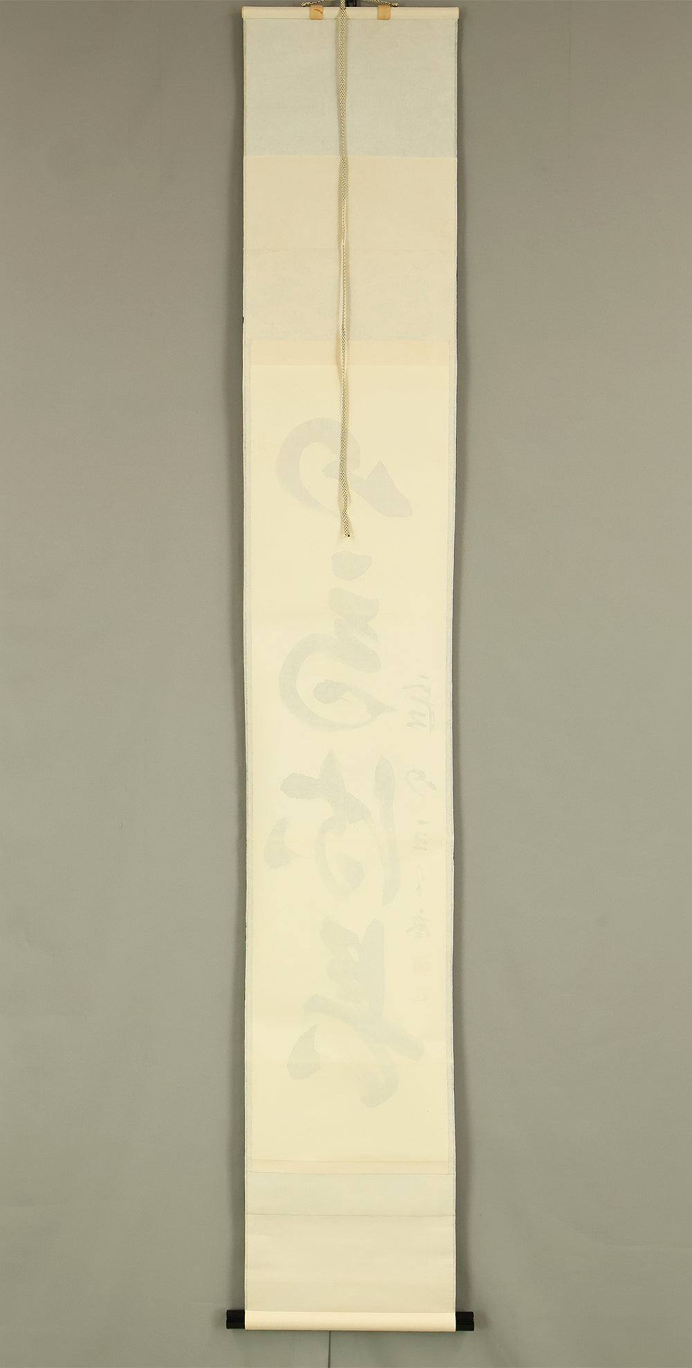 This Zen calligraphy by Tachibana Sogi, head priest of Tokuzen‑ji and known by the art name Ryoan, presents the phrase 山高流長 with a commanding yet unforced clarity. The tall, rising strokes evoke the presence of a sheer mountain ridge, while the sweeping lower movement suggests water flowing without end, creating a rhythm that feels both expansive and quietly disciplined. Sogi’s brushwork carries the steadiness of long training at Daitoku‑ji: each line lands with intention, neither rushed nor embellished, allowing the meaning of the phrase—enduring height, unbroken flow—to emerge through the movement of ink itself. His signature Ryoan and the Murasakino seal anchor the composition with a calm authority, while the deep indigo brocade mounting frames the calligraphy in a way that heightens its sense of spaciousness. Accompanied by its original tomobako, the piece embodies a balance of strength and serenity that reflects the essence of Zen practice captured in a single moment of brush and breath.