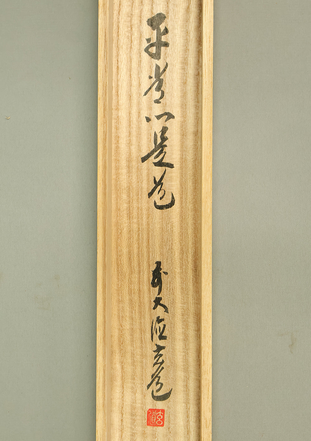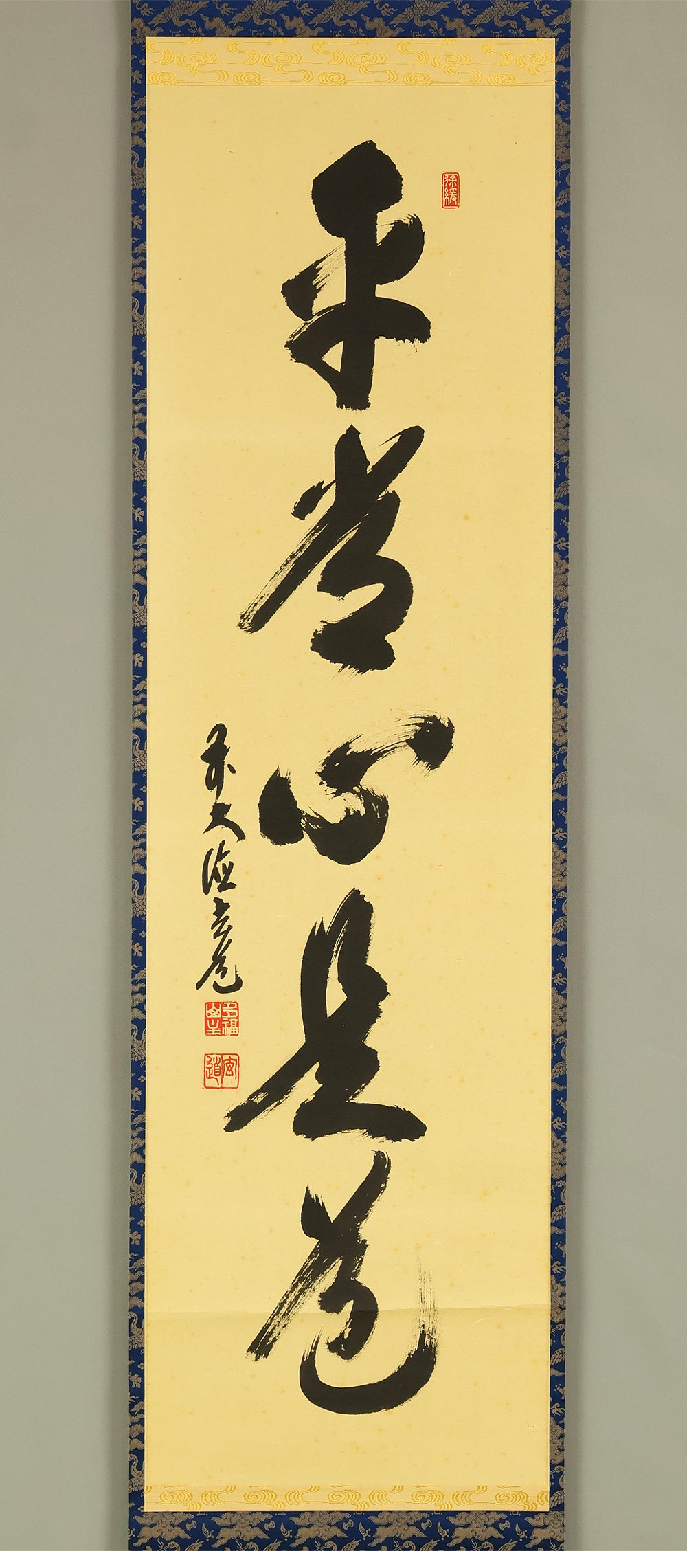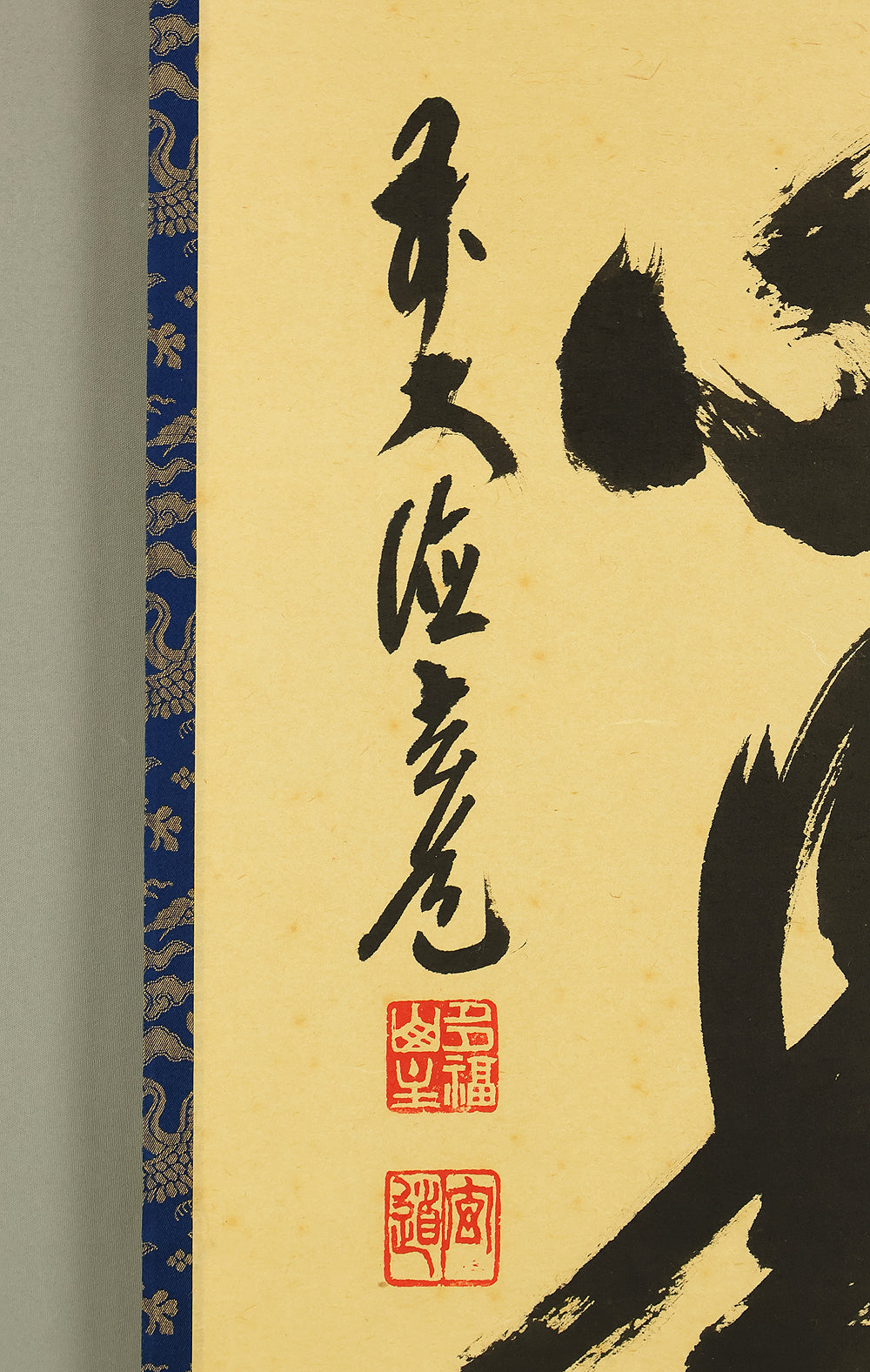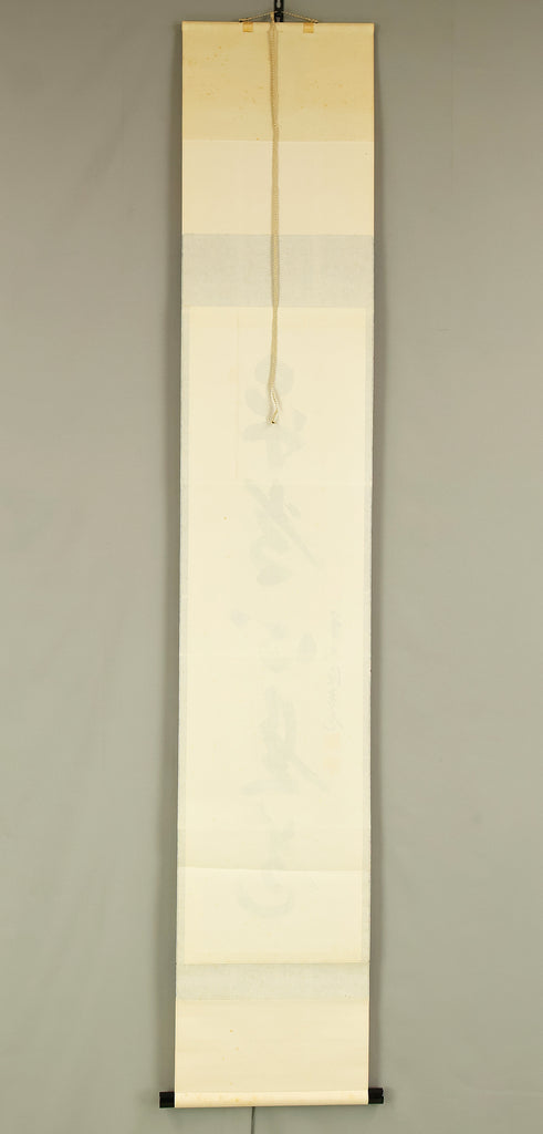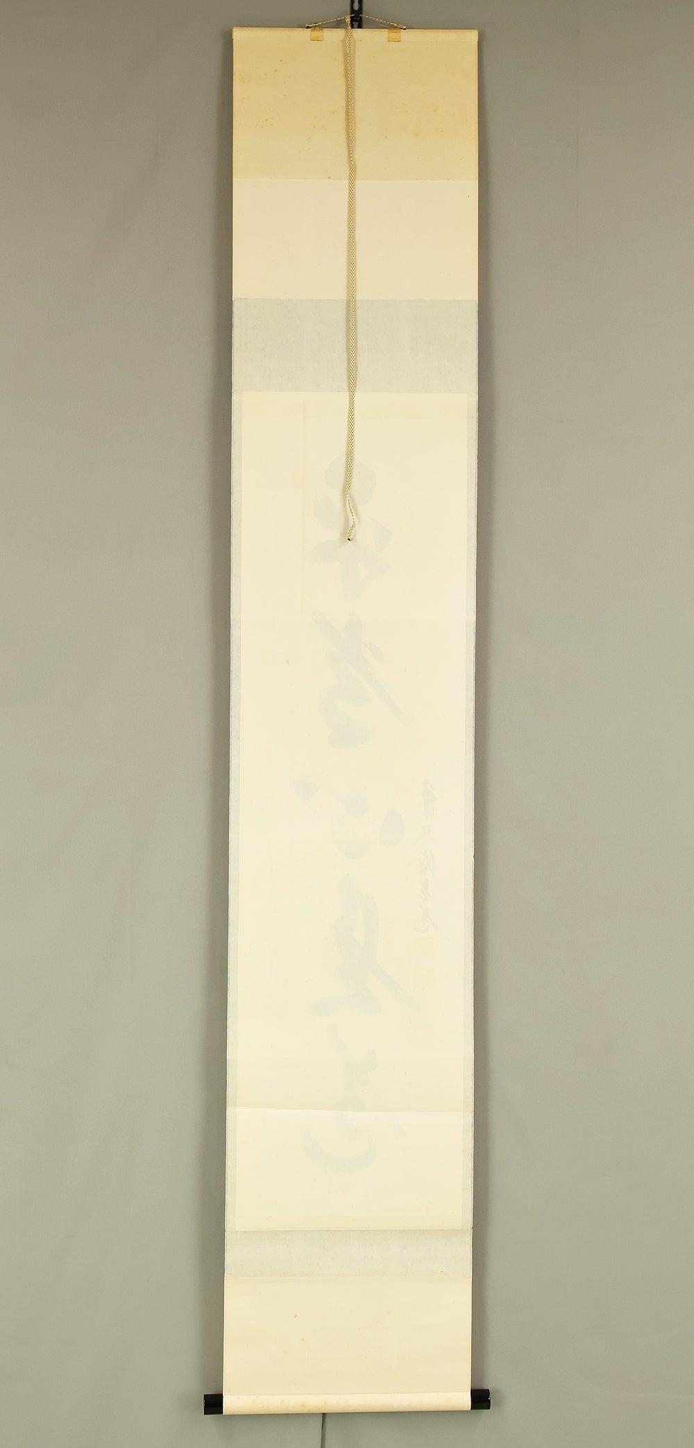 This hanging scroll features the powerful Zen phrase “Byojoshin Koredo” (平常心是道)—“Ordinary mind is the Way”—rendered in bold calligraphy by Suga Gendō (b. 1919), a respected figure associated with Daitoku-ji, one of Kyoto’s most prominent Zen temples. The phrase, drawn from classical Chan/Zen teachings, expresses the idea that enlightenment is found not in extremes, but in the calm clarity of everyday awareness. The brushwork is expressive and confident, with dynamic strokes that reflect both spiritual depth and artistic mastery. The scroll is mounted in traditional textile borders and comes with its original wooden box (tomobako) bearing the artist’s inscription and seal. Please note: there is a visible crease in the lower section of the scroll, affecting the character 道 (“Way”). Despite this imperfection, the piece retains its contemplative presence and remains a compelling example of modern Zen calligraphy. This work will appeal to collectors of Japanese Buddhist art, calligraphy, and those drawn to the aesthetics of quiet strength and philosophical simplicity.