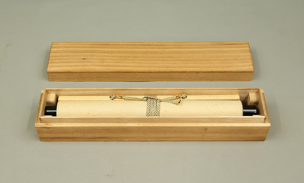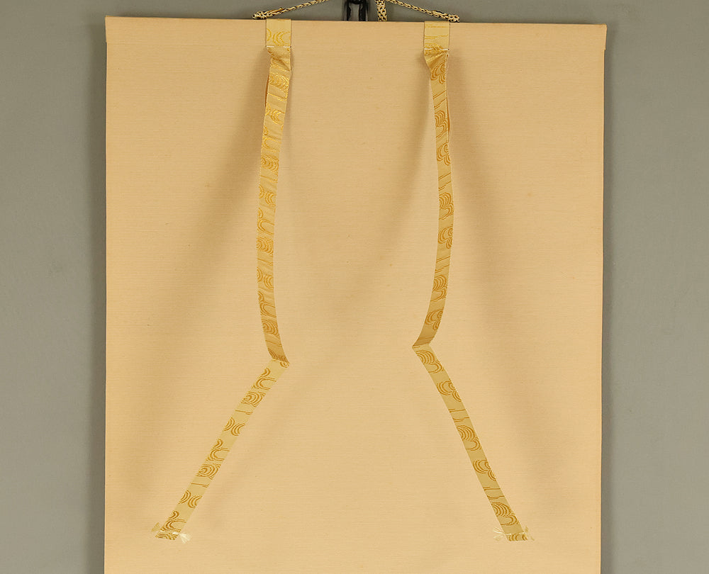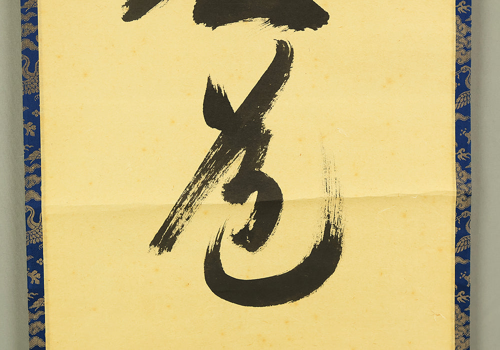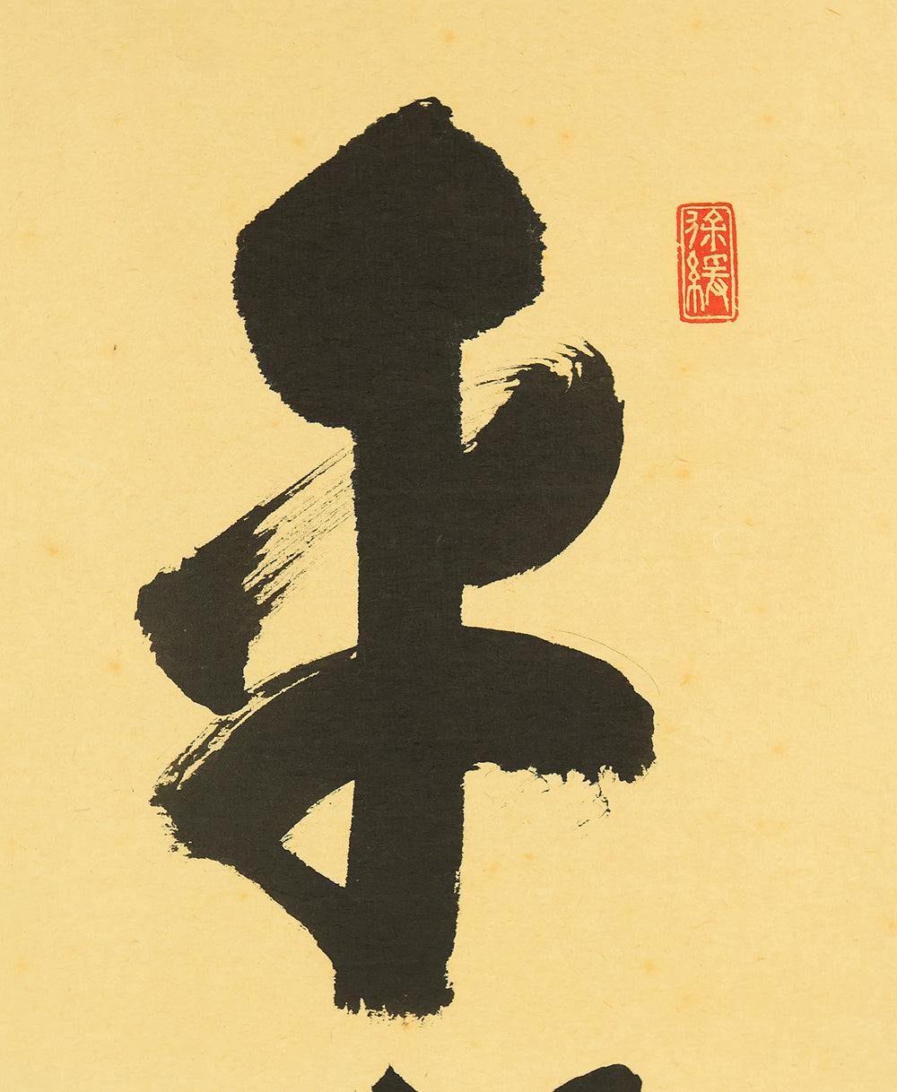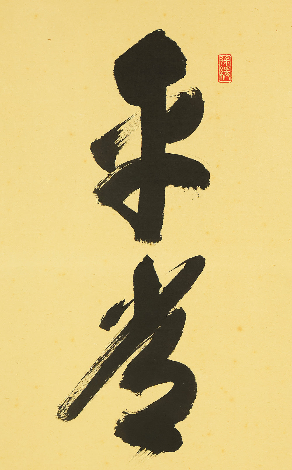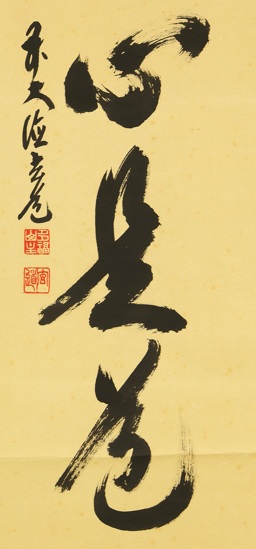 This hanging scroll features the powerful Zen phrase “Byojoshin Koredo” (平常心是道)—“Ordinary mind is the Way”—rendered in bold calligraphy by Suga Gendō (b. 1919), a respected figure associated with Daitoku-ji, one of Kyoto’s most prominent Zen temples. The phrase, drawn from classical Chan/Zen teachings, expresses the idea that enlightenment is found not in extremes, but in the calm clarity of everyday awareness. The brushwork is expressive and confident, with dynamic strokes that reflect both spiritual depth and artistic mastery. The scroll is mounted in traditional textile borders and comes with its original wooden box (tomobako) bearing the artist’s inscription and seal. Please note: there is a visible crease in the lower section of the scroll, affecting the character 道 (“Way”). Despite this imperfection, the piece retains its contemplative presence and remains a compelling example of modern Zen calligraphy. This work will appeal to collectors of Japanese Buddhist art, calligraphy, and those drawn to the aesthetics of quiet strength and philosophical simplicity.