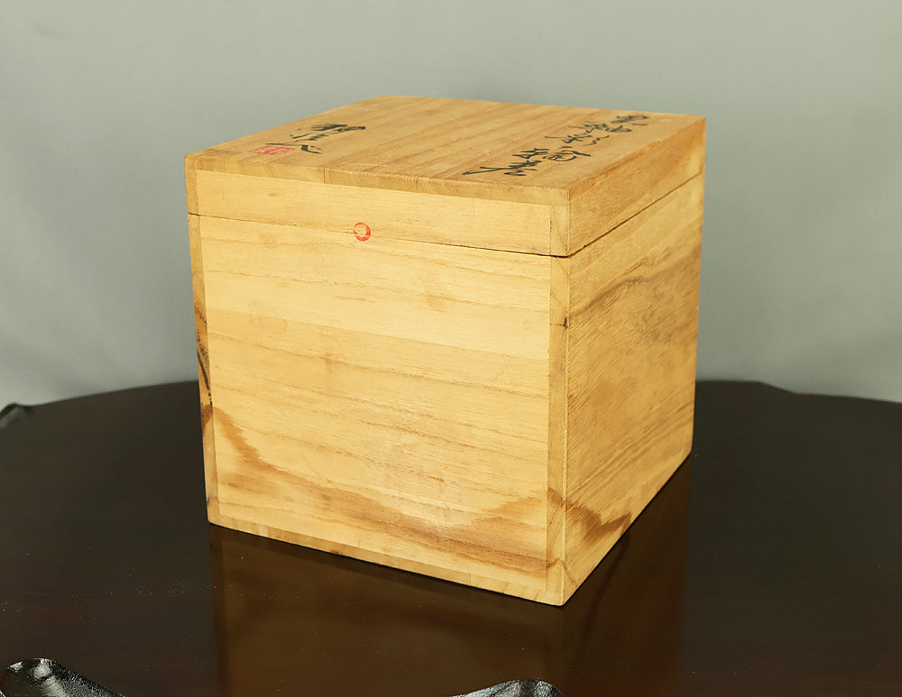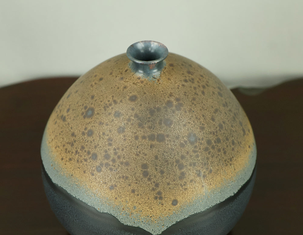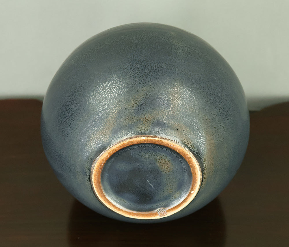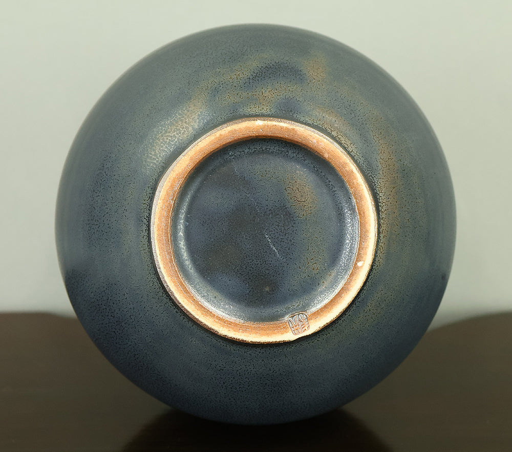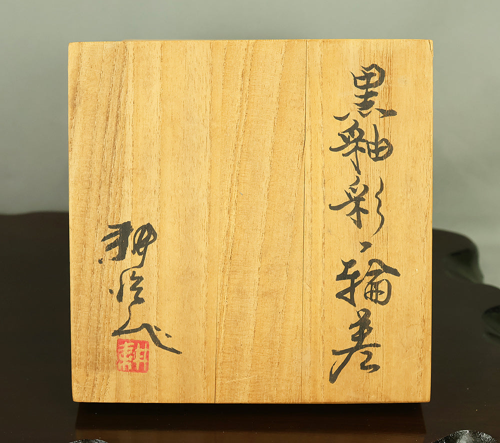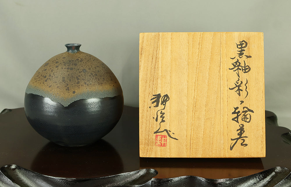 Created by Arata Koji (1938–2022), a distinguished ceramic artist originally from Hokkaido who later established his kiln in Ibaraki, this Kasama ware single‑flower vase showcases his refined command of black‑glaze expression. The rounded form and controlled transitions of tone give the piece a quiet presence, while the surface reveals subtle shifts in texture and color that reflect Arata’s sensitivity to kiln atmosphere and material response. Known for receiving major honors—including the Gold Prize at the Daiichi Art Exhibition in 1976 and the Minister of Education Award for Excellence at the 6th Japan Ceramic Art Exhibition—Arata developed a style that balances contemporary sensibility with the earthy character of Kasama clay. The vase is accompanied by its original tomobako, inscribed by the artist, underscoring its authenticity and the care traditionally given to works of this caliber.