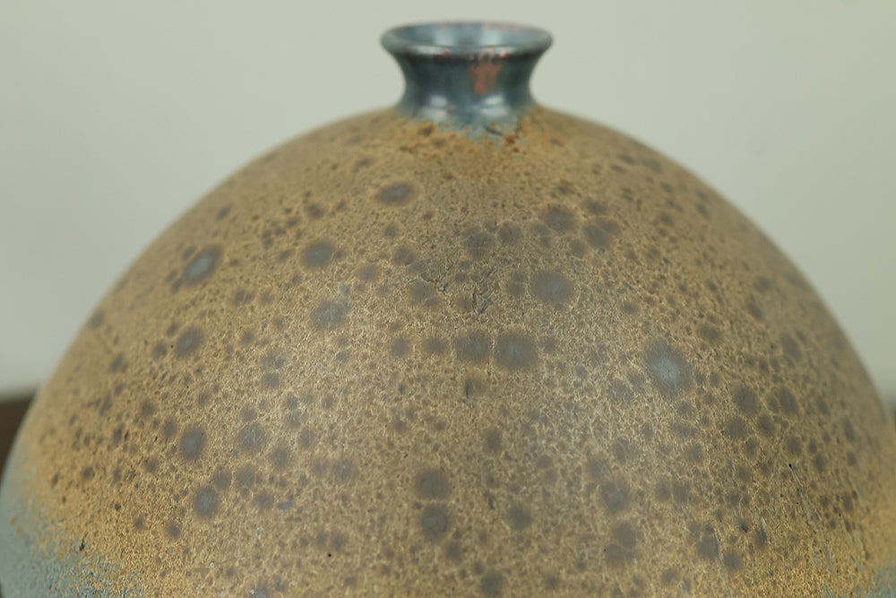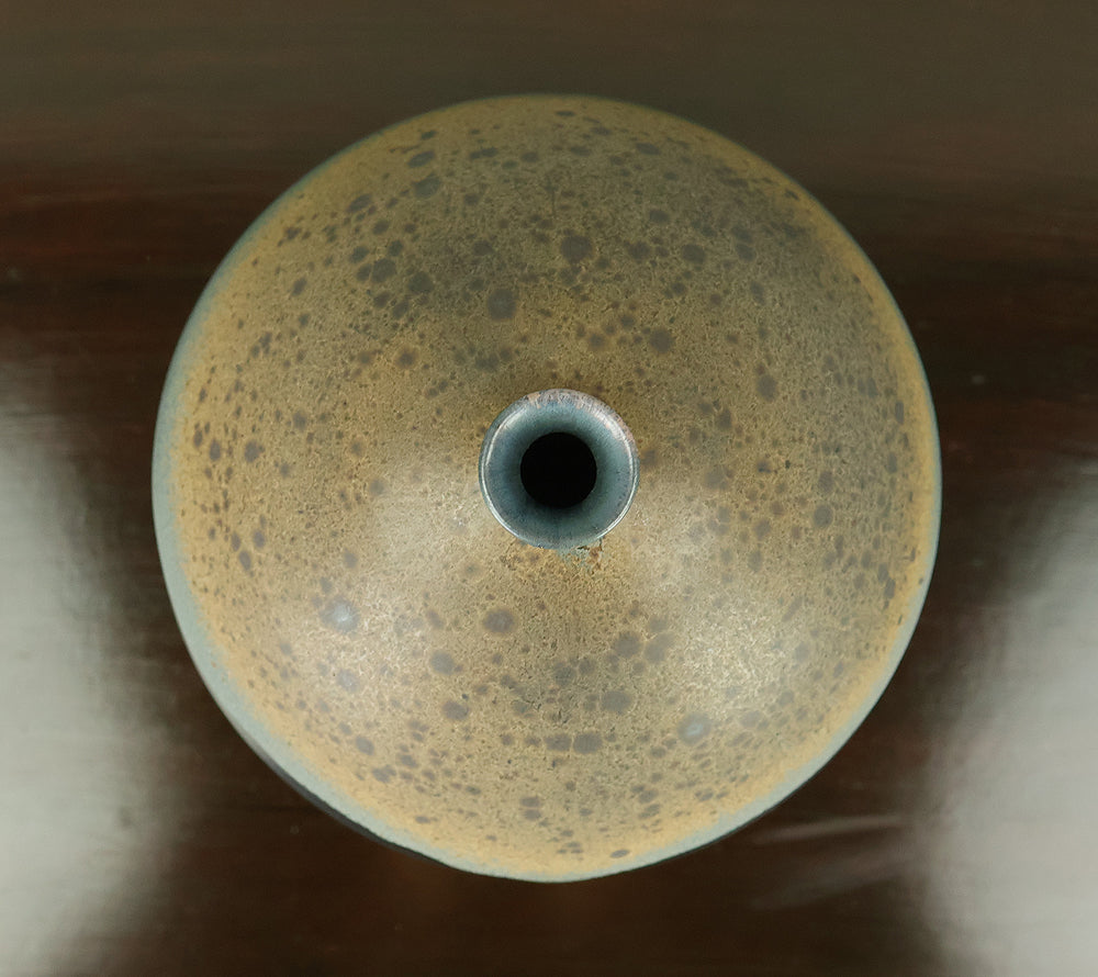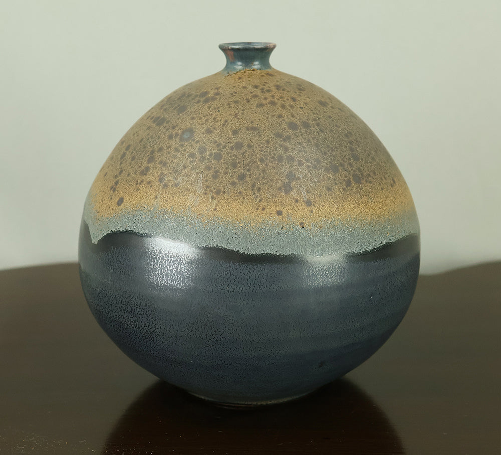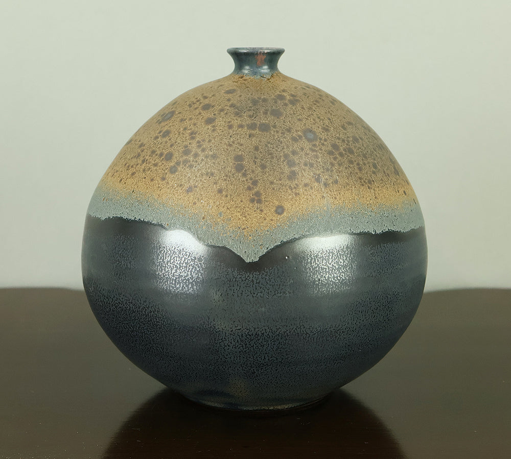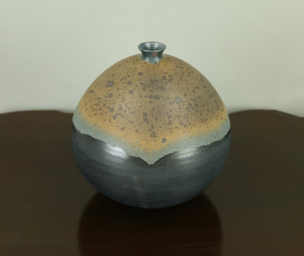 Created by Arata Koji (1938–2022), a distinguished ceramic artist originally from Hokkaido who later established his kiln in Ibaraki, this Kasama ware single‑flower vase showcases his refined command of black‑glaze expression. The rounded form and controlled transitions of tone give the piece a quiet presence, while the surface reveals subtle shifts in texture and color that reflect Arata’s sensitivity to kiln atmosphere and material response. Known for receiving major honors—including the Gold Prize at the Daiichi Art Exhibition in 1976 and the Minister of Education Award for Excellence at the 6th Japan Ceramic Art Exhibition—Arata developed a style that balances contemporary sensibility with the earthy character of Kasama clay. The vase is accompanied by its original tomobako, inscribed by the artist, underscoring its authenticity and the care traditionally given to works of this caliber.