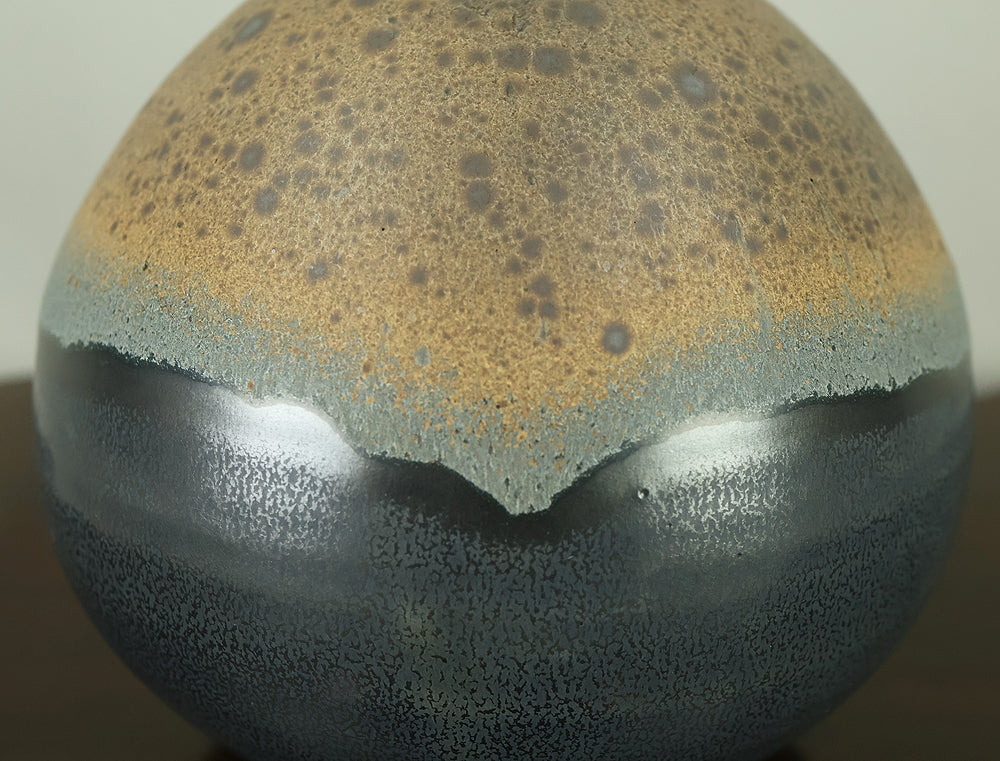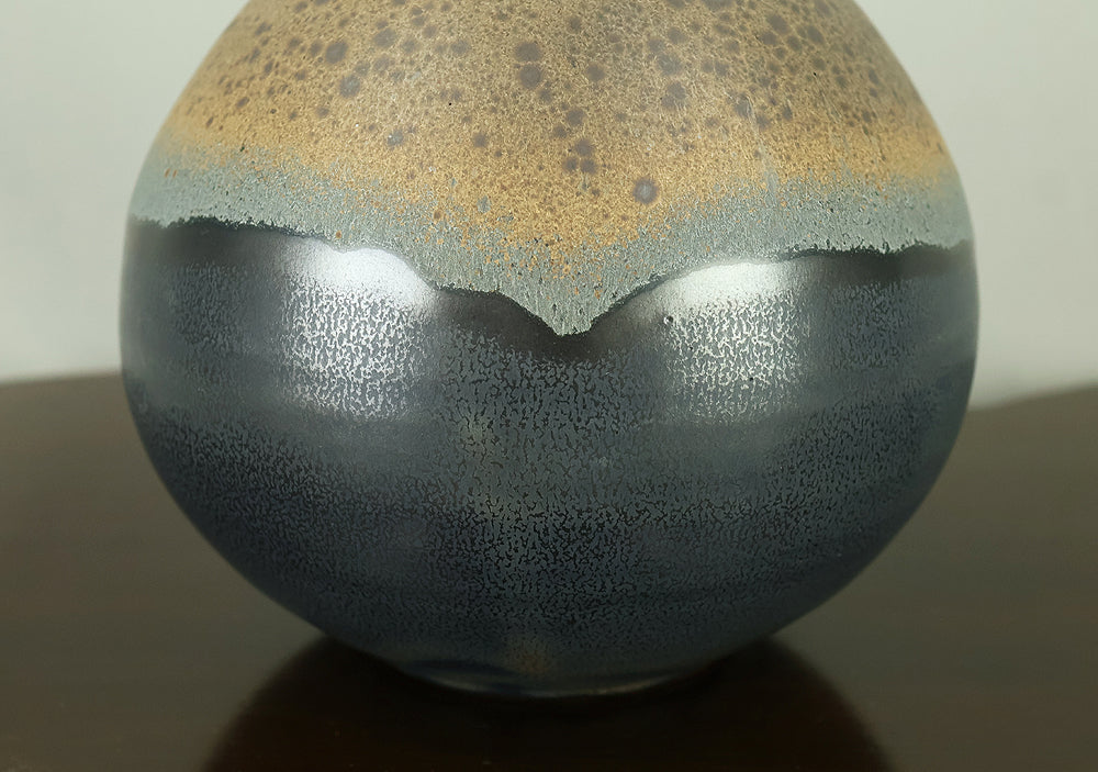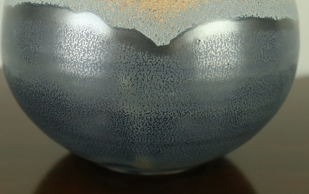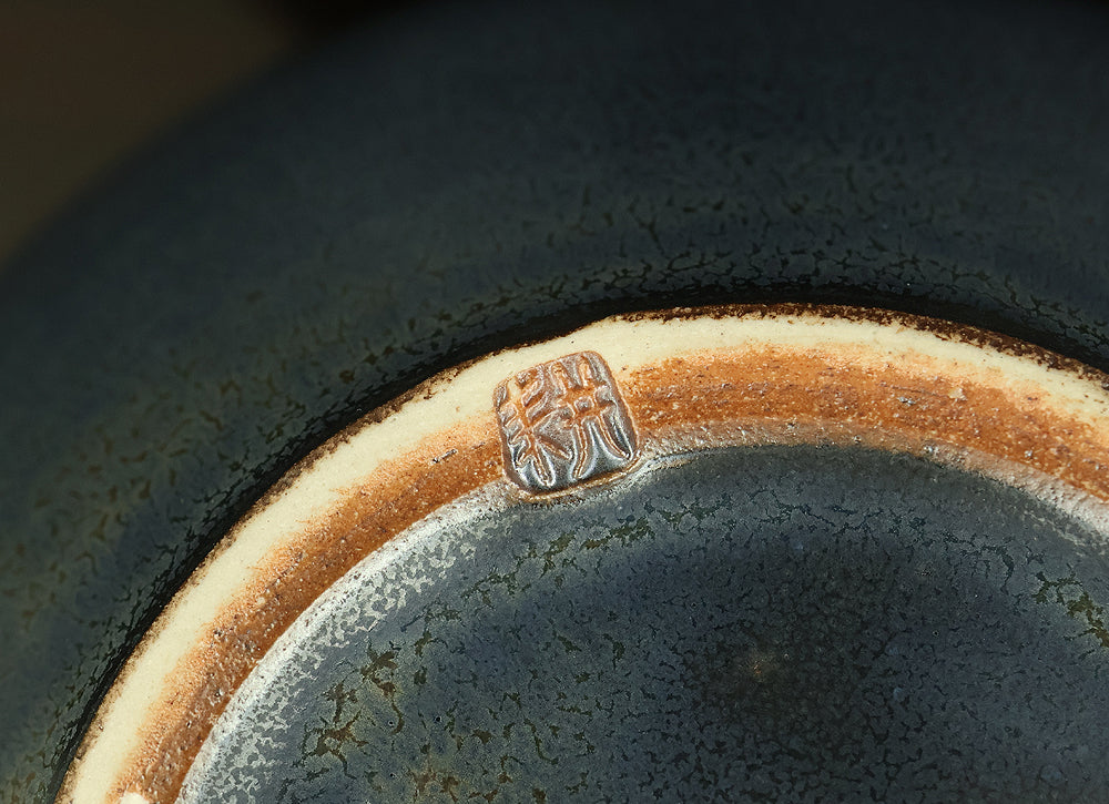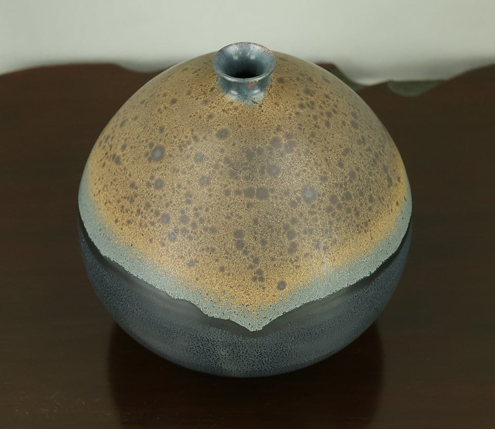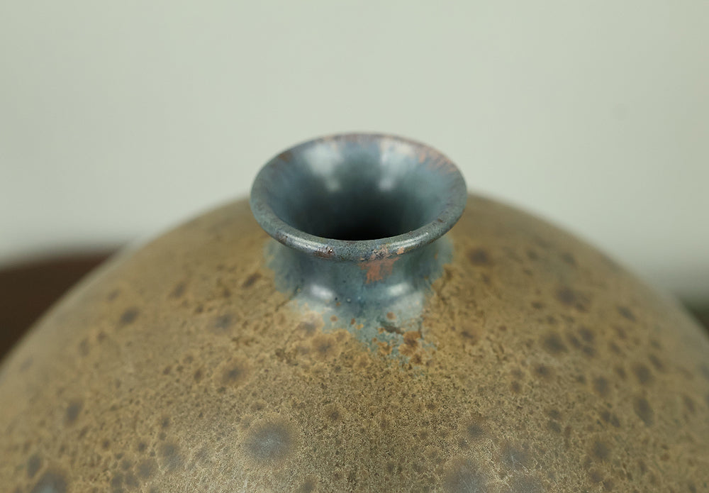 Created by Arata Koji (1938–2022), a distinguished ceramic artist originally from Hokkaido who later established his kiln in Ibaraki, this Kasama ware single‑flower vase showcases his refined command of black‑glaze expression. The rounded form and controlled transitions of tone give the piece a quiet presence, while the surface reveals subtle shifts in texture and color that reflect Arata’s sensitivity to kiln atmosphere and material response. Known for receiving major honors—including the Gold Prize at the Daiichi Art Exhibition in 1976 and the Minister of Education Award for Excellence at the 6th Japan Ceramic Art Exhibition—Arata developed a style that balances contemporary sensibility with the earthy character of Kasama clay. The vase is accompanied by its original tomobako, inscribed by the artist, underscoring its authenticity and the care traditionally given to works of this caliber.