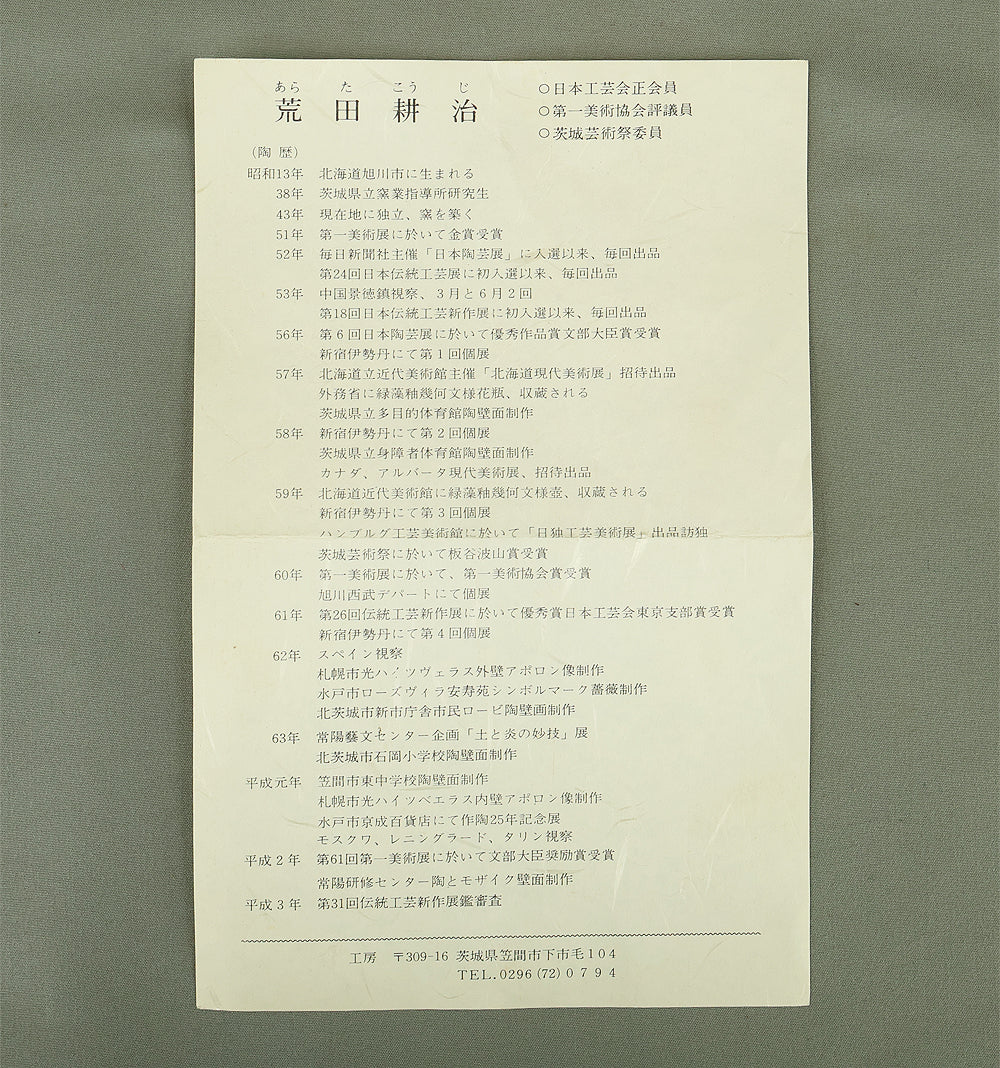 A ceramic artist originally from Hokkaido. He relocated to Ibaraki Prefecture and built his kiln there. He has received numerous awards, including the Gold Prize at the Daiichi Art Exhibition in 1976 and the Minister of Education Award for Excellence at the 6th Japan Ceramic Art Exhibition in 1981.