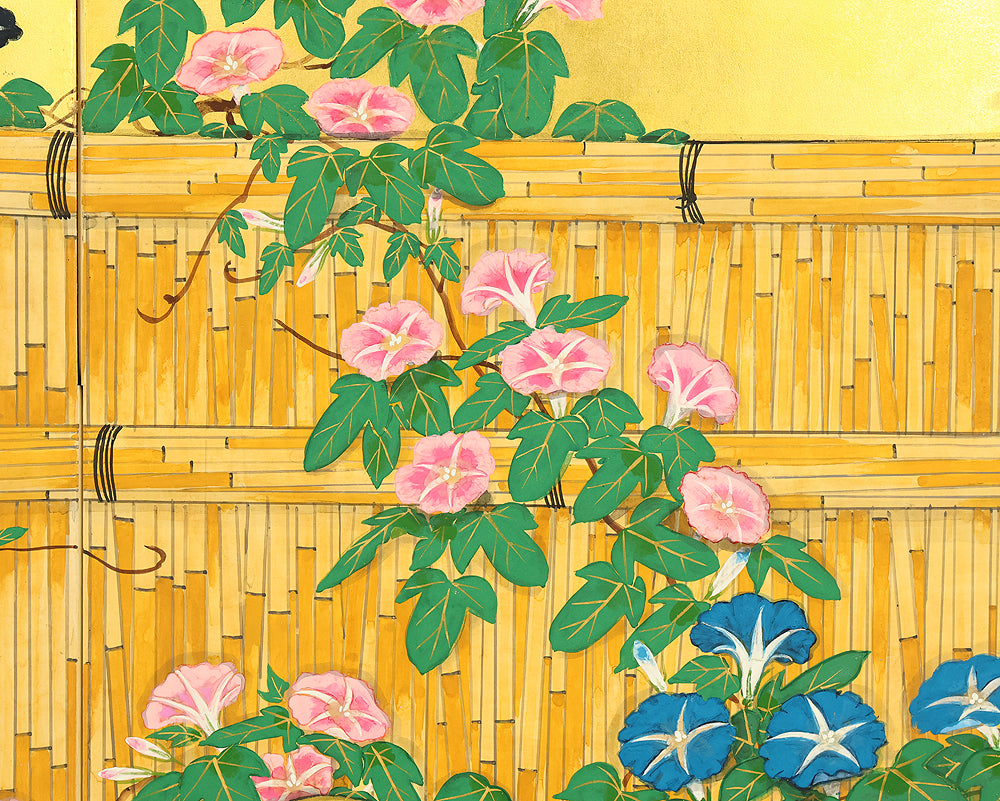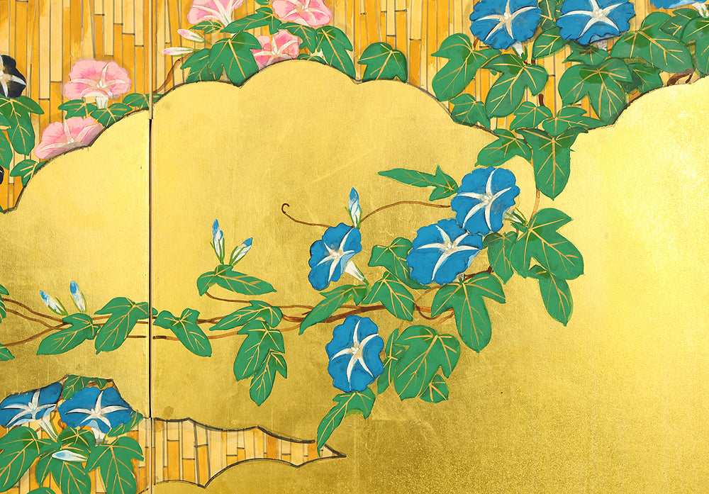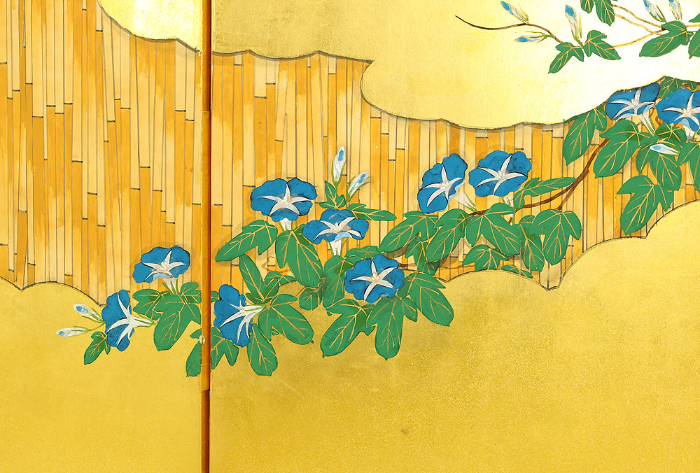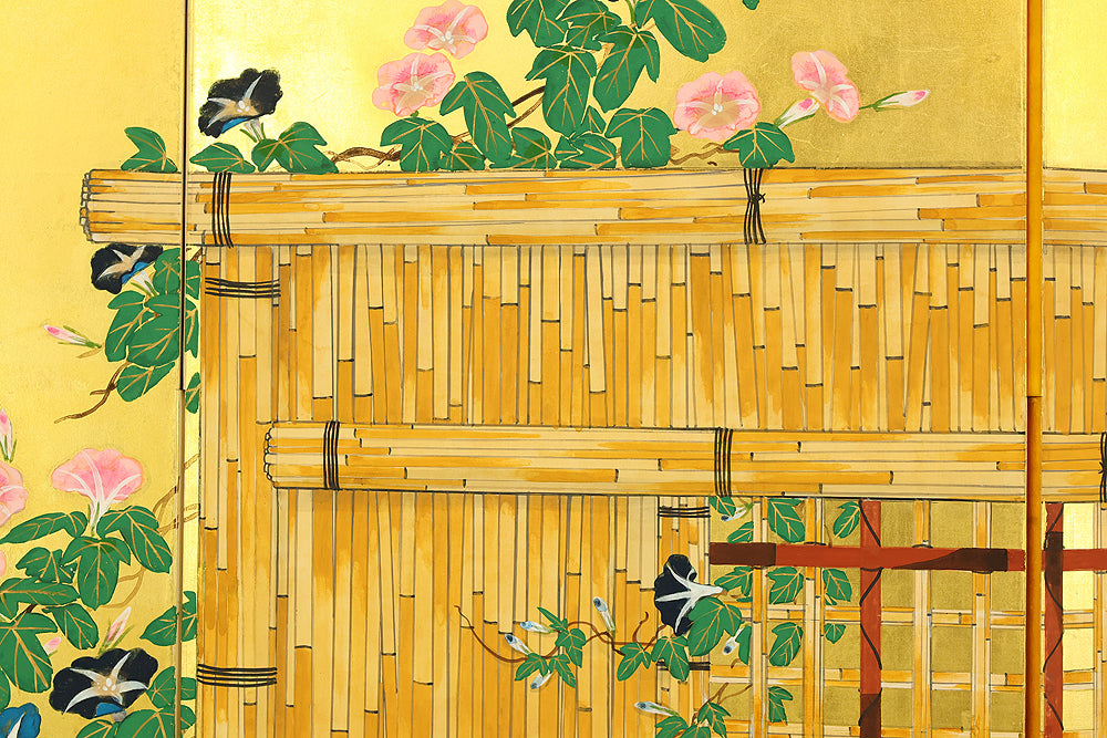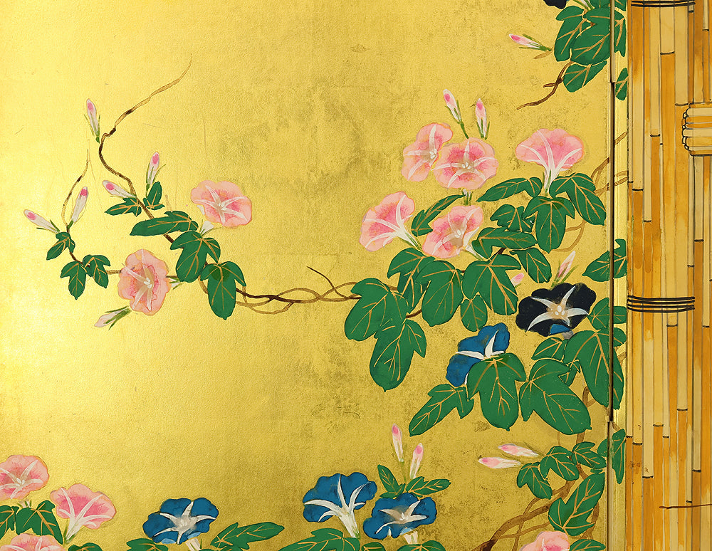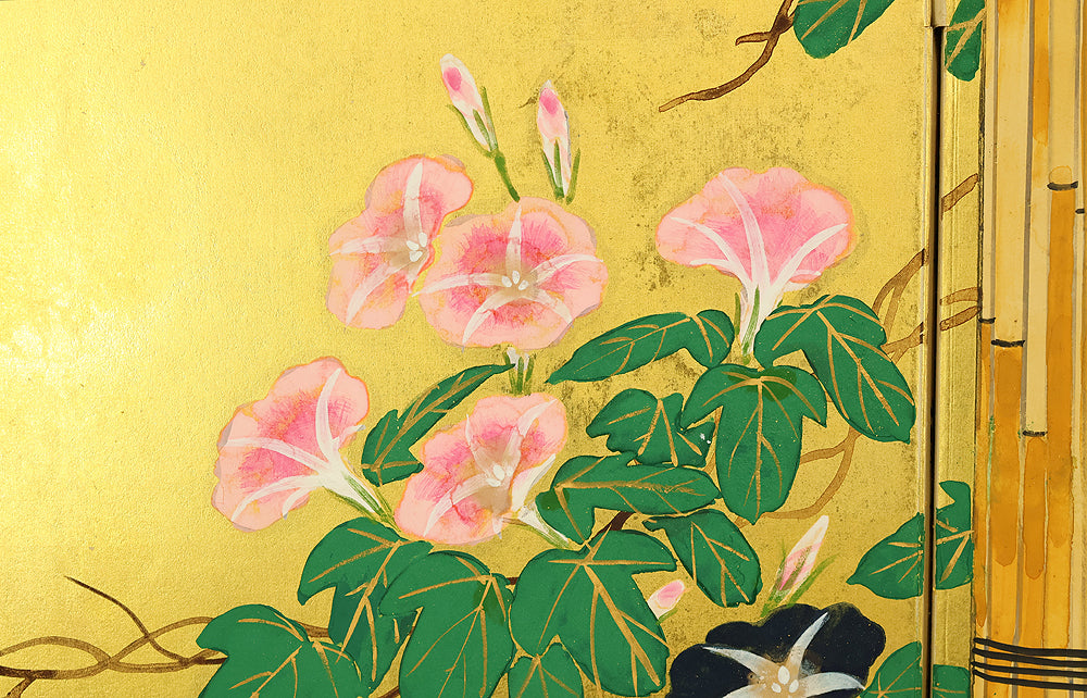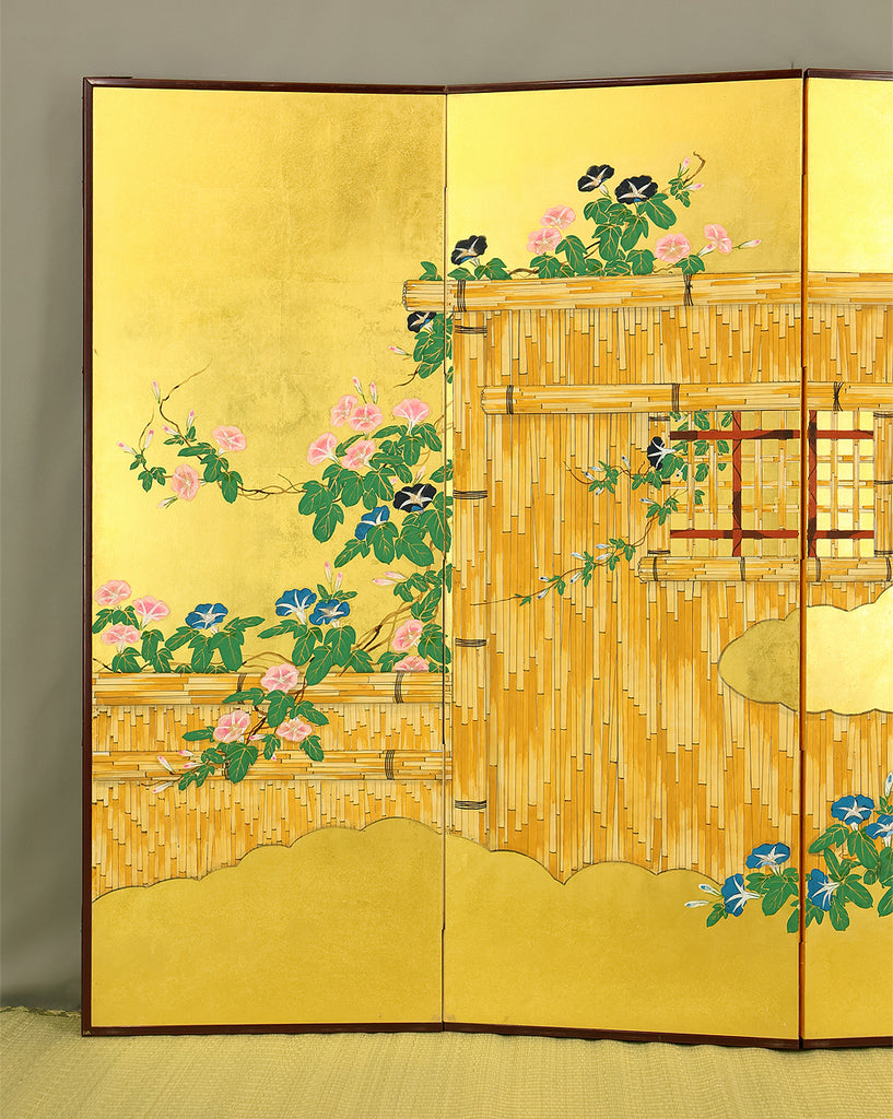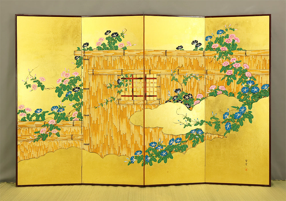 翠芳 Suiho Gold Leaf Morning Glories Blooming on Wall Byobu Four Panels Folding Screens Room Dividers VA961