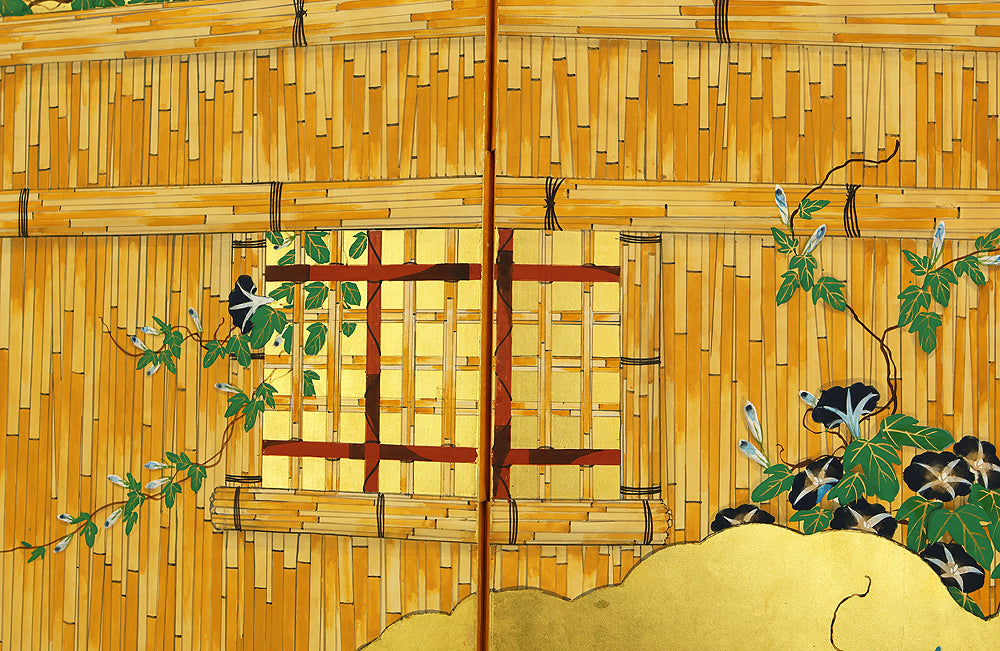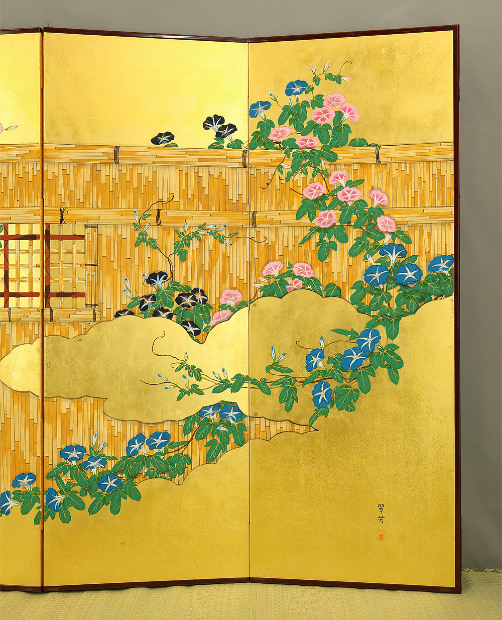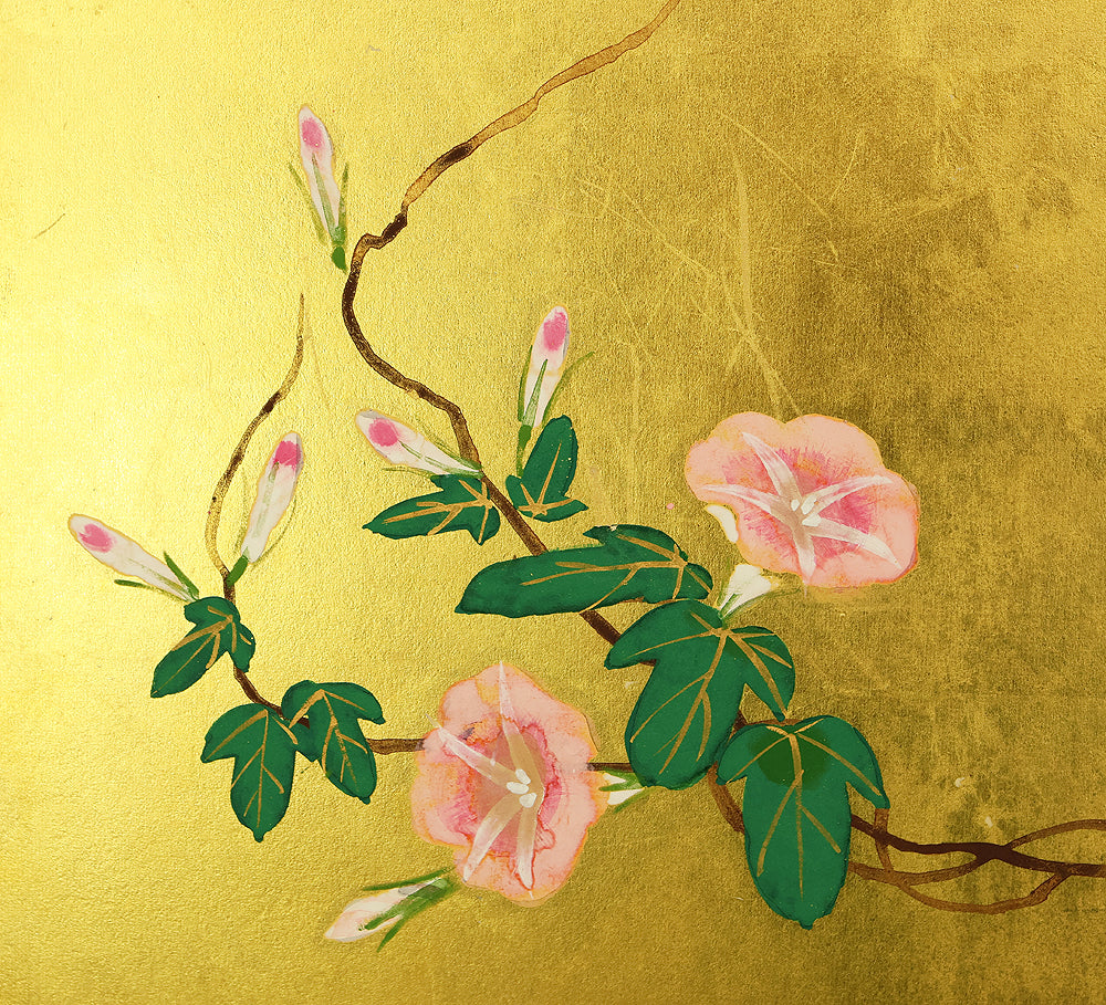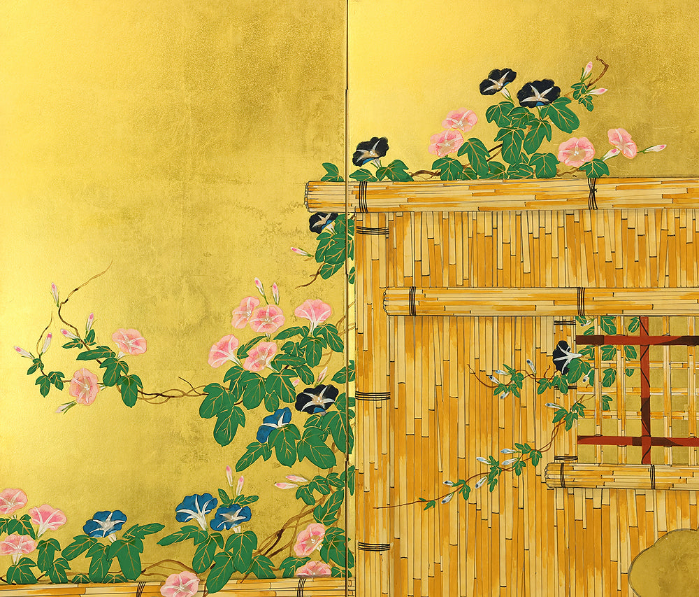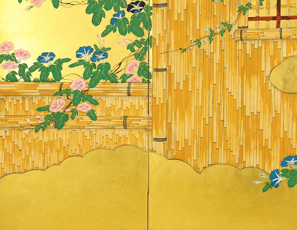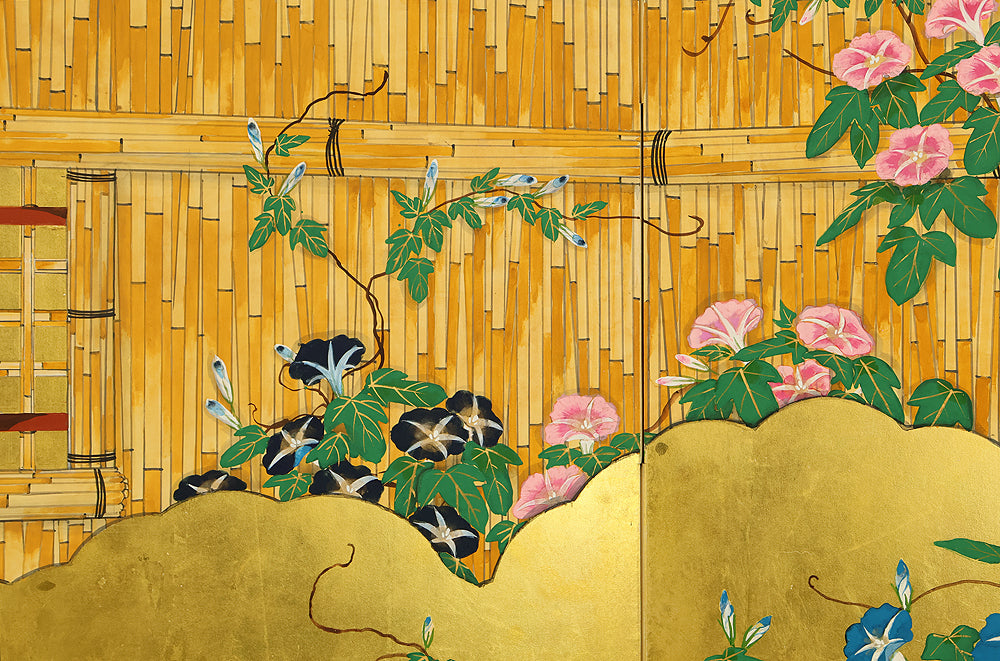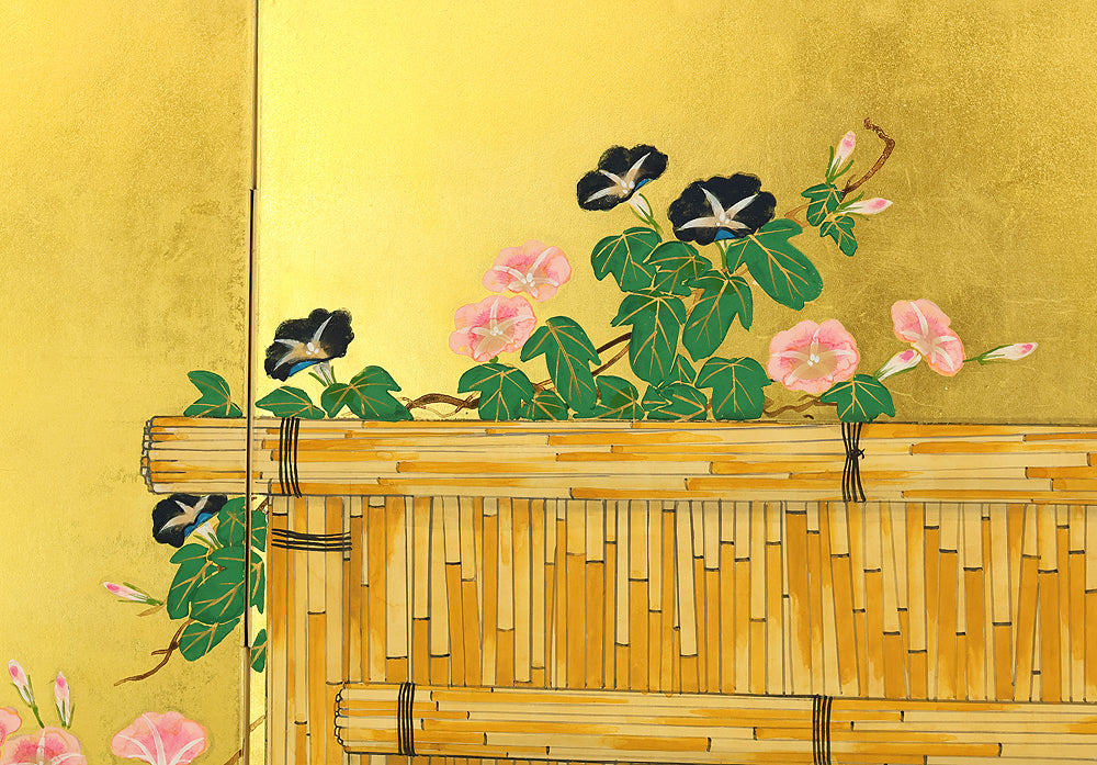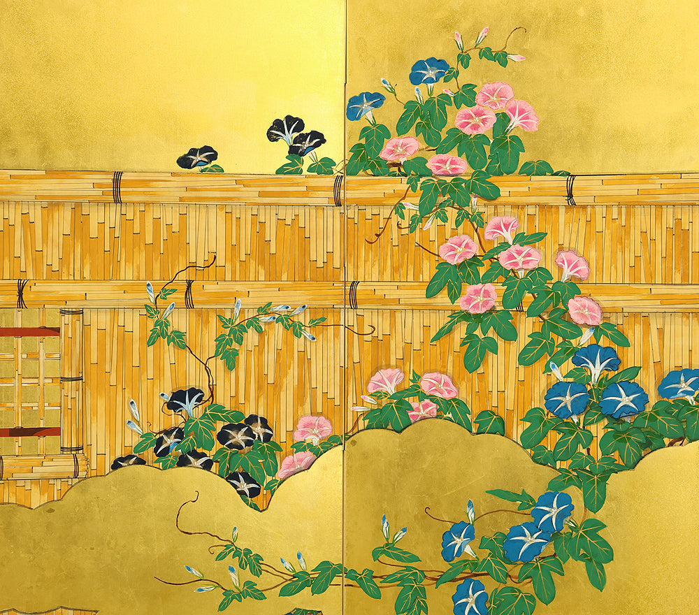 翠芳 Suiho Gold Leaf Morning Glories Blooming on Wall Byobu Four Panels Folding Screens Room Dividers VA961