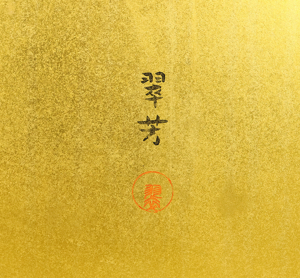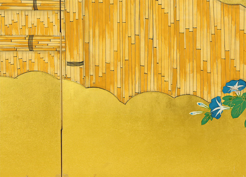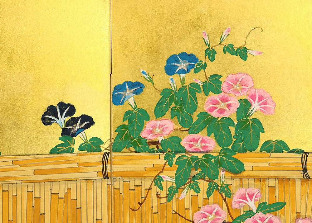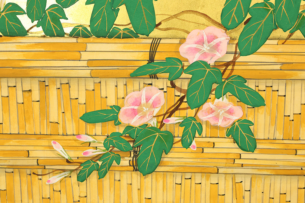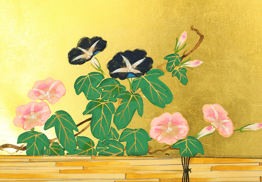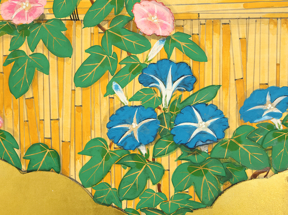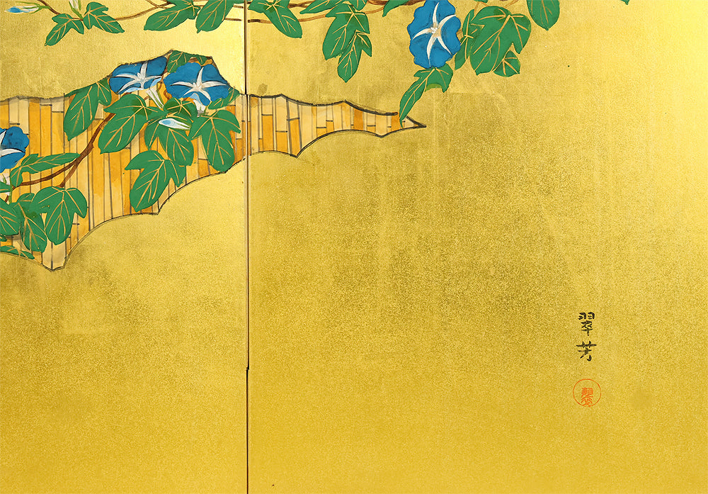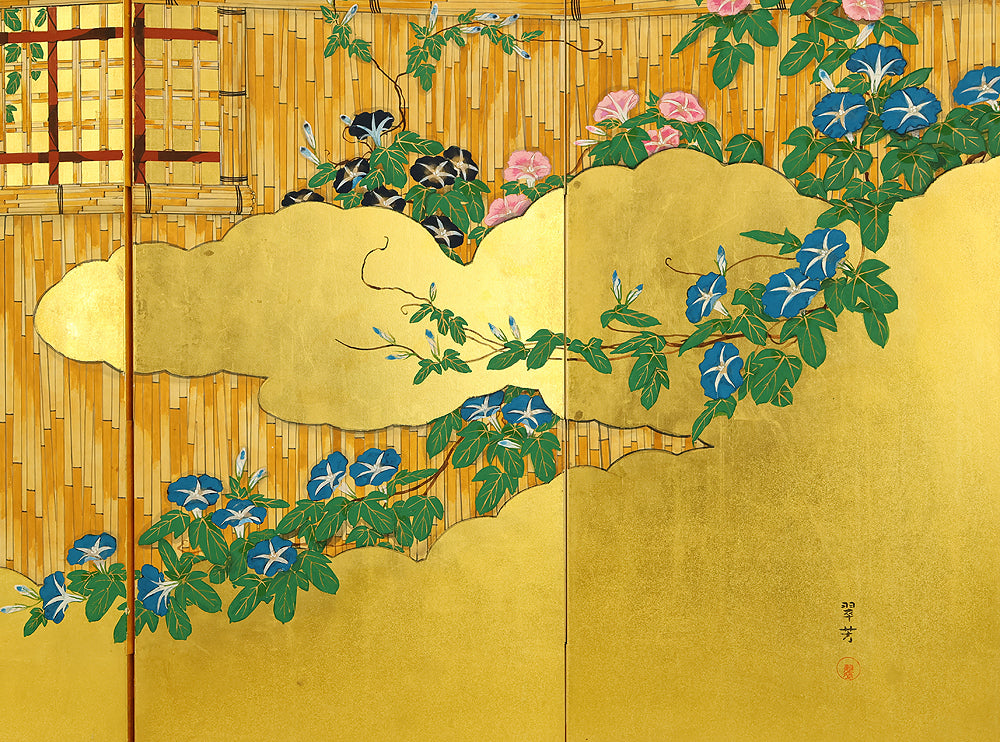 Set against a luminous gold ground, this four‑panel byōbu signed “Suiho” presents morning glories climbing in elegant arcs across a bamboo fence, their blossoms unfolding in vivid tones that animate the entire surface. The interplay of metallic sheen and saturated color gives the flowers a striking presence, while the rhythmic arrangement of vines and leaves creates a sense of gentle movement across the panels. Suiho’s brushwork balances decorative refinement with natural vitality, allowing each bloom to feel fresh and distinct without overwhelming the harmony of the whole. The accompanying seal “Sui” affirms the authorship. A beautifully crafted screen that captures the seasonal charm and graceful ornamentation characteristic of Japanese floral painting on gold leaf.