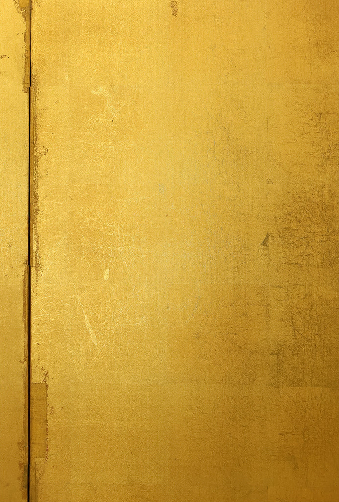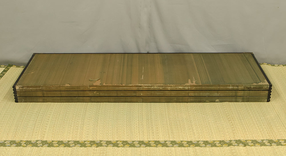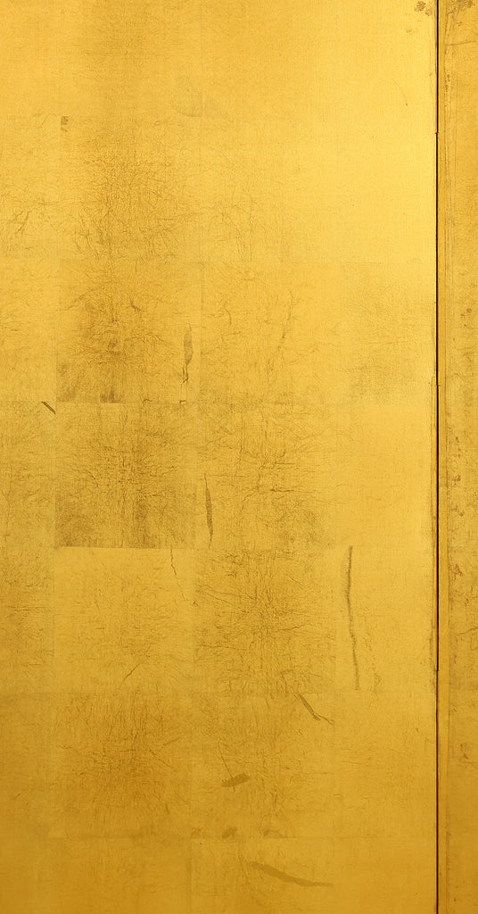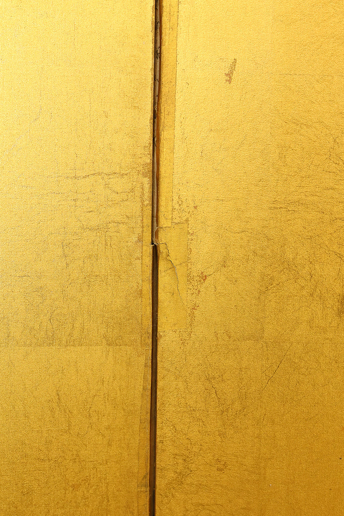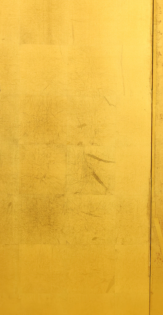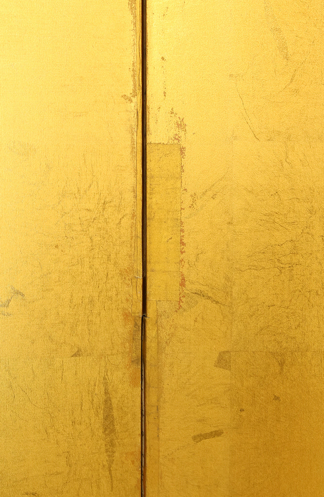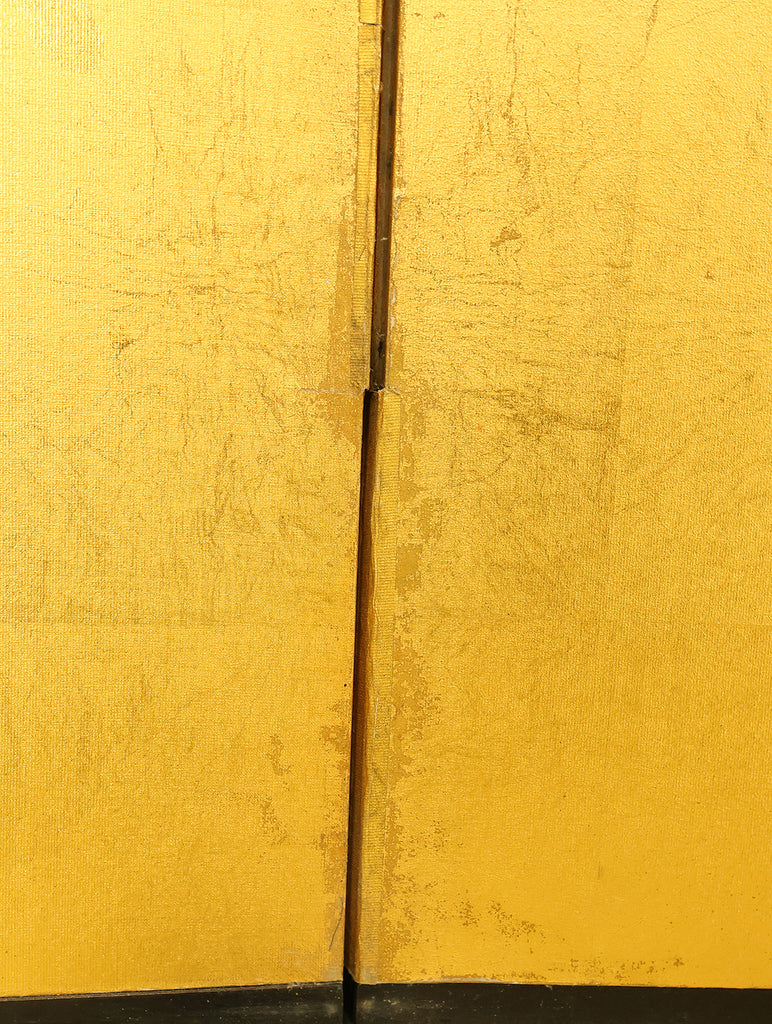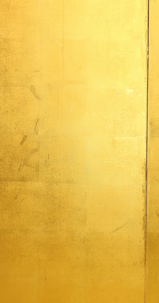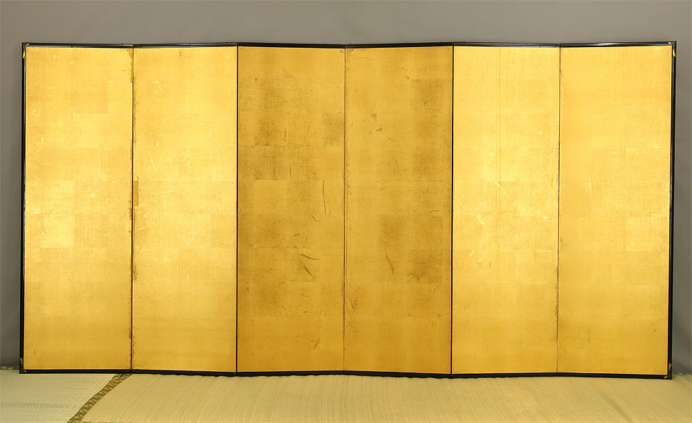 An impressive six-panel Japanese folding screen (byōbu) richly finished with genuine gold leaf applied through traditional foil stamping techniques, presenting a luminous surface that has developed a deep, dignified patina over time. The gold leaf panels display clearly visible leaf joints and subtle variations in tone, characteristics consistent with authentic honkin (pure gold leaf) screens crafted in the early 20th century, most plausibly from the late Taishō to early Shōwa period. The surface shows natural aging, gentle wear, and soft tonal transitions that only decades of presence can create, lending the screen a quiet authority and historical depth impossible to replicate in later decorative works. Accompanied by its original wooden storage box, itself bearing signs of long use and careful preservation, this screen speaks to a life spent within refined Japanese interiors, where light, space, and material were thoughtfully harmonized. When placed within a modern living space, gallery, or reception area, the gold surface responds beautifully to changing light throughout the day, subtly warming the room and evoking a sense of continuity, protection, and enduring elegance. More than a decorative object, this byōbu stands as a rare surviving example of traditional gold leaf craftsmanship, offering both visual grandeur and the quiet reassurance of an authentic, time-honored work meant to be enjoyed for generations to come.