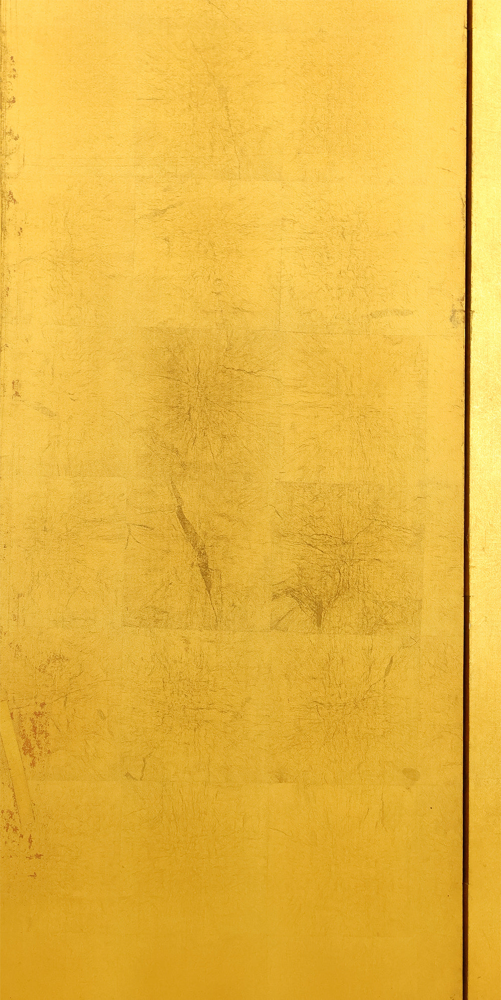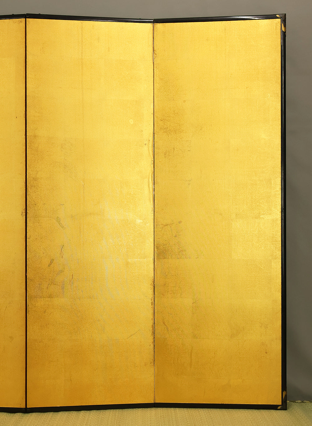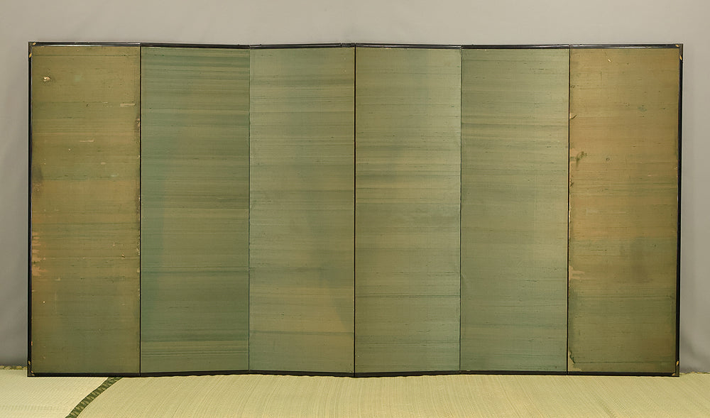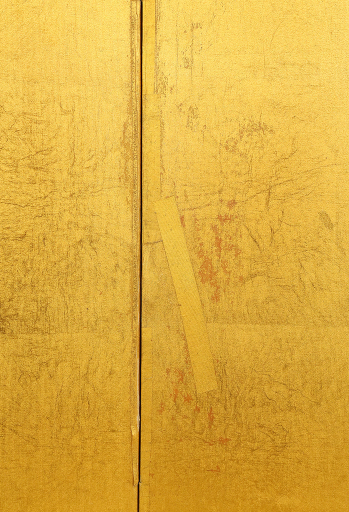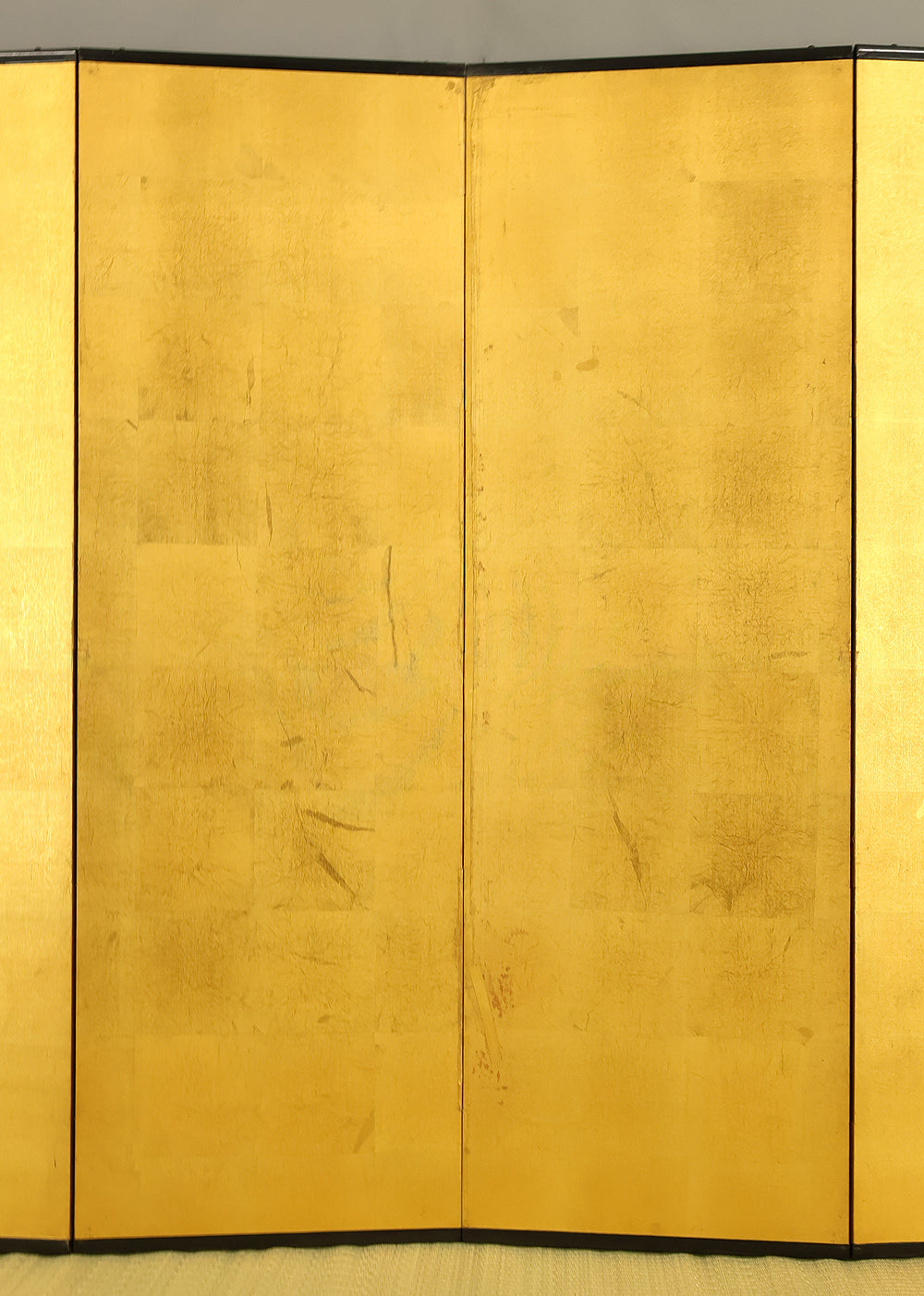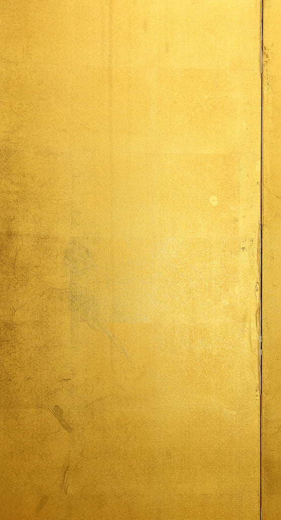 An impressive six-panel Japanese folding screen (byōbu) richly finished with genuine gold leaf applied through traditional foil stamping techniques, presenting a luminous surface that has developed a deep, dignified patina over time. The gold leaf panels display clearly visible leaf joints and subtle variations in tone, characteristics consistent with authentic honkin (pure gold leaf) screens crafted in the early 20th century, most plausibly from the late Taishō to early Shōwa period. The surface shows natural aging, gentle wear, and soft tonal transitions that only decades of presence can create, lending the screen a quiet authority and historical depth impossible to replicate in later decorative works. Accompanied by its original wooden storage box, itself bearing signs of long use and careful preservation, this screen speaks to a life spent within refined Japanese interiors, where light, space, and material were thoughtfully harmonized. When placed within a modern living space, gallery, or reception area, the gold surface responds beautifully to changing light throughout the day, subtly warming the room and evoking a sense of continuity, protection, and enduring elegance. More than a decorative object, this byōbu stands as a rare surviving example of traditional gold leaf craftsmanship, offering both visual grandeur and the quiet reassurance of an authentic, time-honored work meant to be enjoyed for generations to come.