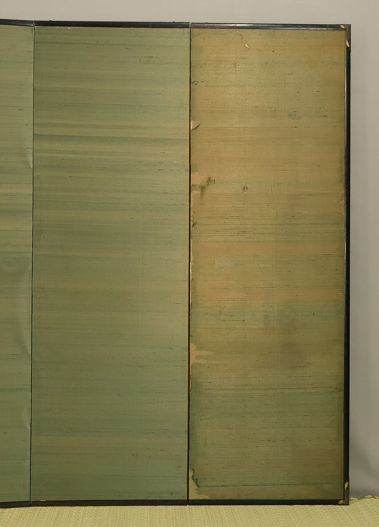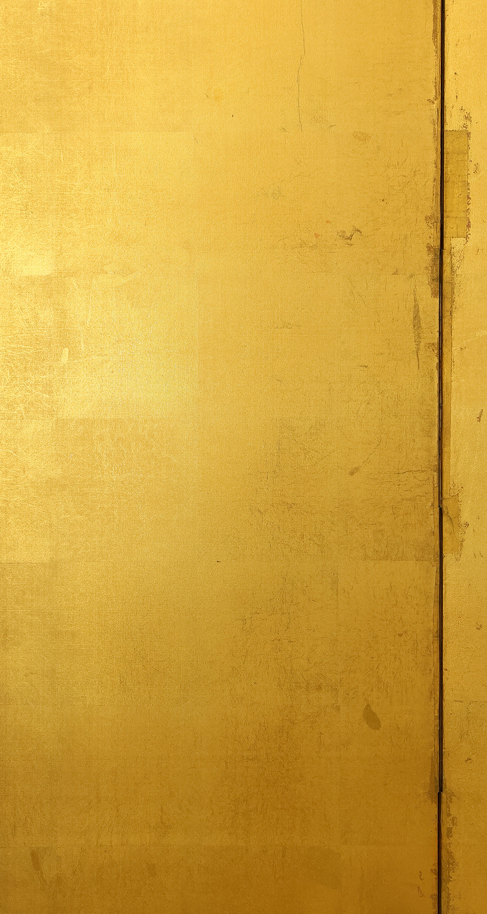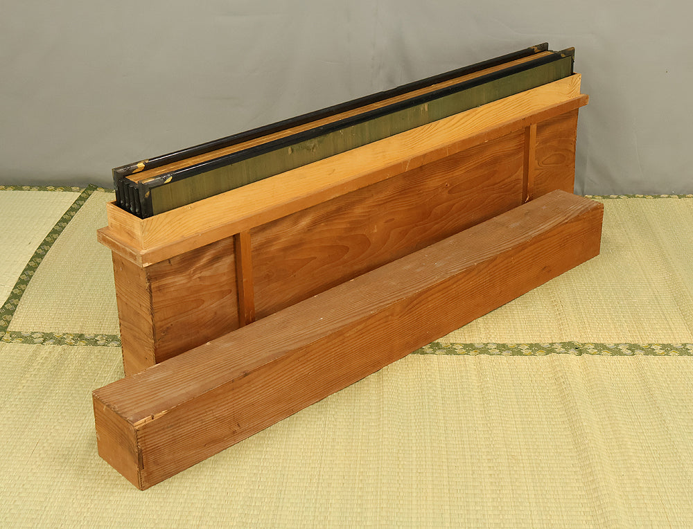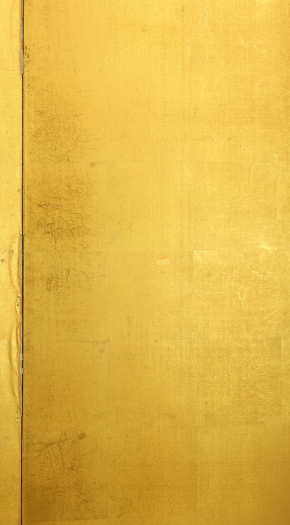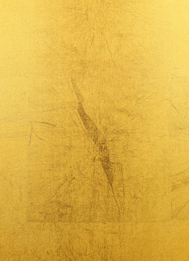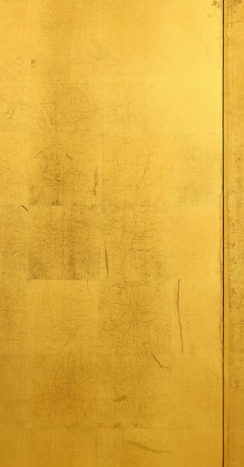 An impressive six-panel Japanese folding screen (byōbu) richly finished with genuine gold leaf applied through traditional foil stamping techniques, presenting a luminous surface that has developed a deep, dignified patina over time. The gold leaf panels display clearly visible leaf joints and subtle variations in tone, characteristics consistent with authentic honkin (pure gold leaf) screens crafted in the early 20th century, most plausibly from the late Taishō to early Shōwa period. The surface shows natural aging, gentle wear, and soft tonal transitions that only decades of presence can create, lending the screen a quiet authority and historical depth impossible to replicate in later decorative works. Accompanied by its original wooden storage box, itself bearing signs of long use and careful preservation, this screen speaks to a life spent within refined Japanese interiors, where light, space, and material were thoughtfully harmonized. When placed within a modern living space, gallery, or reception area, the gold surface responds beautifully to changing light throughout the day, subtly warming the room and evoking a sense of continuity, protection, and enduring elegance. More than a decorative object, this byōbu stands as a rare surviving example of traditional gold leaf craftsmanship, offering both visual grandeur and the quiet reassurance of an authentic, time-honored work meant to be enjoyed for generations to come.
