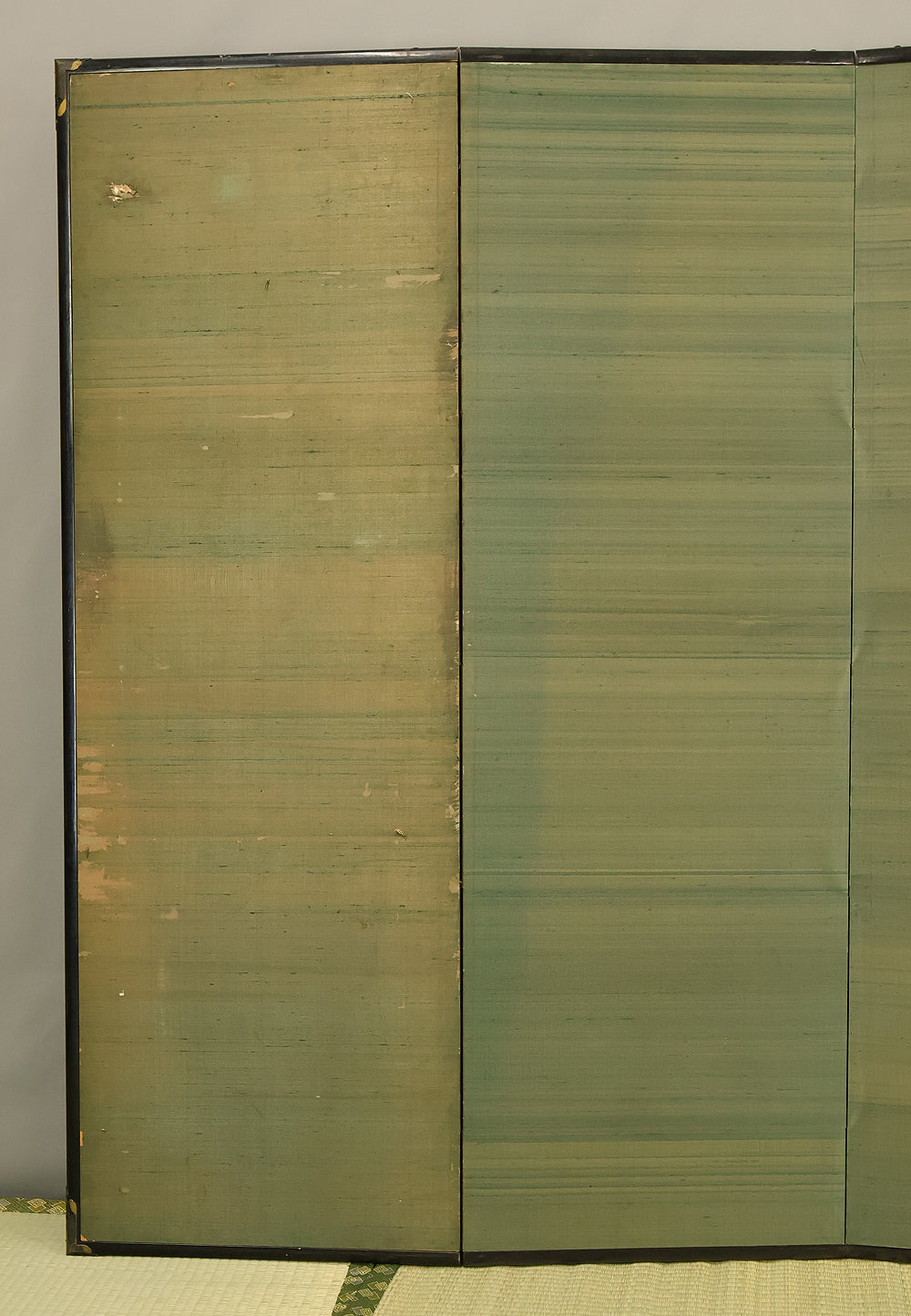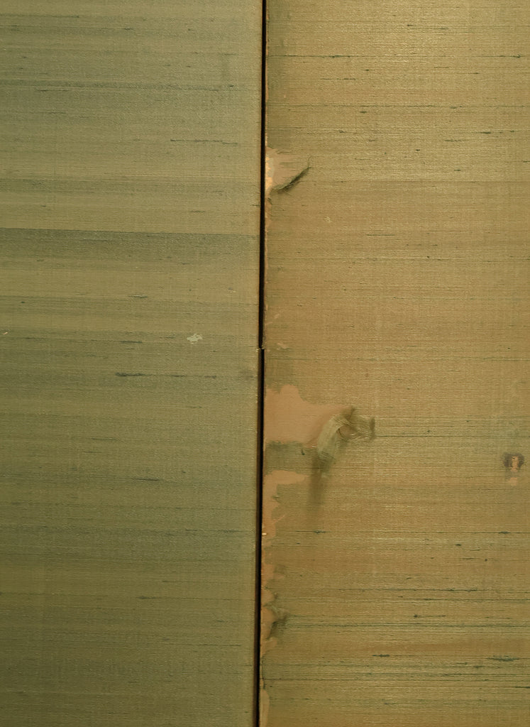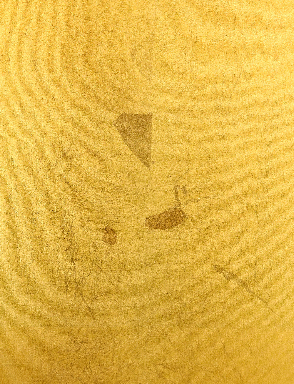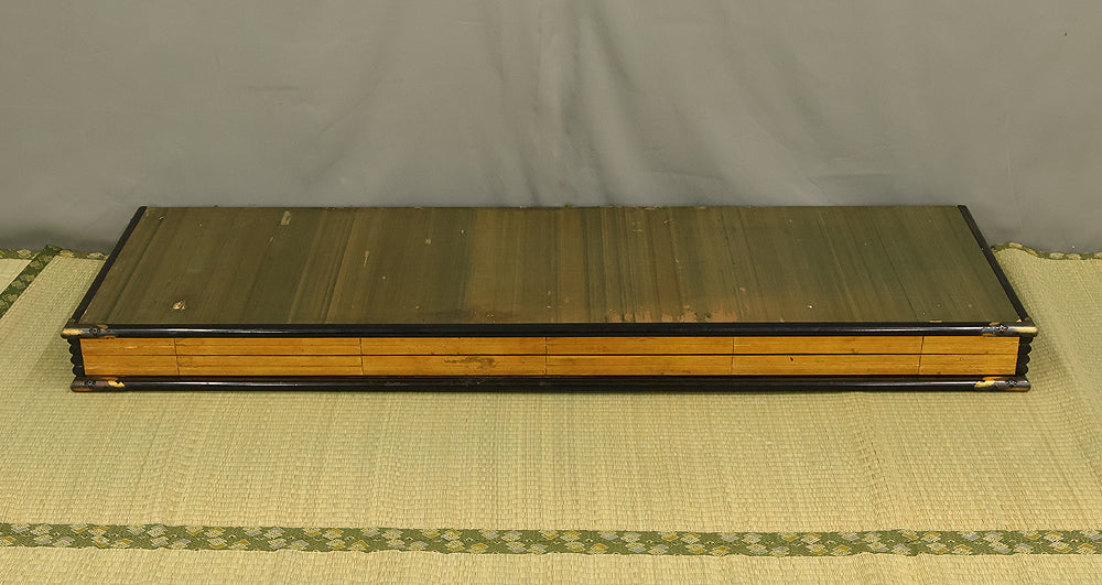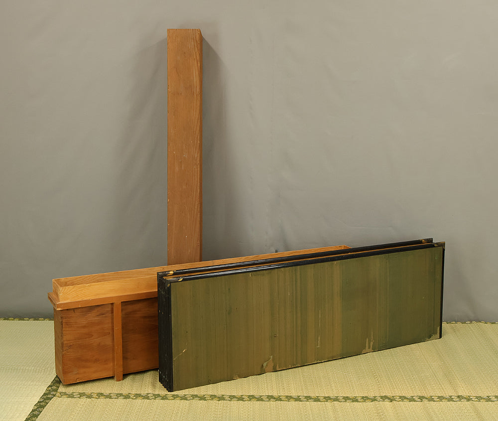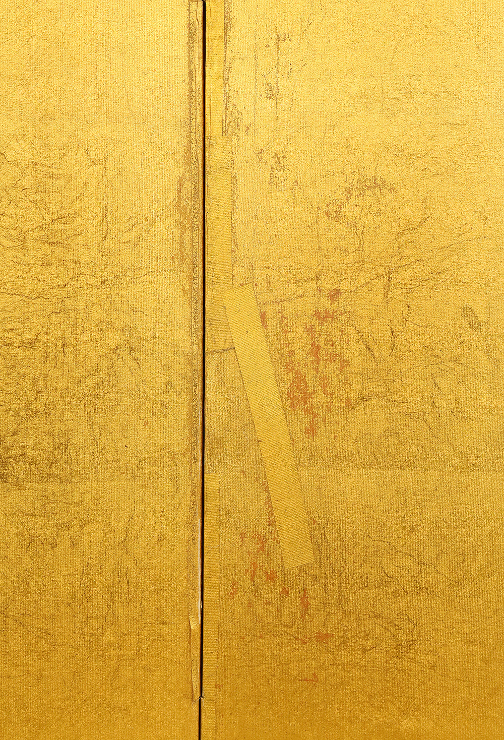 An impressive six-panel Japanese folding screen (byōbu) richly finished with genuine gold leaf applied through traditional foil stamping techniques, presenting a luminous surface that has developed a deep, dignified patina over time. The gold leaf panels display clearly visible leaf joints and subtle variations in tone, characteristics consistent with authentic honkin (pure gold leaf) screens crafted in the early 20th century, most plausibly from the late Taishō to early Shōwa period. The surface shows natural aging, gentle wear, and soft tonal transitions that only decades of presence can create, lending the screen a quiet authority and historical depth impossible to replicate in later decorative works. Accompanied by its original wooden storage box, itself bearing signs of long use and careful preservation, this screen speaks to a life spent within refined Japanese interiors, where light, space, and material were thoughtfully harmonized. When placed within a modern living space, gallery, or reception area, the gold surface responds beautifully to changing light throughout the day, subtly warming the room and evoking a sense of continuity, protection, and enduring elegance. More than a decorative object, this byōbu stands as a rare surviving example of traditional gold leaf craftsmanship, offering both visual grandeur and the quiet reassurance of an authentic, time-honored work meant to be enjoyed for generations to come.
