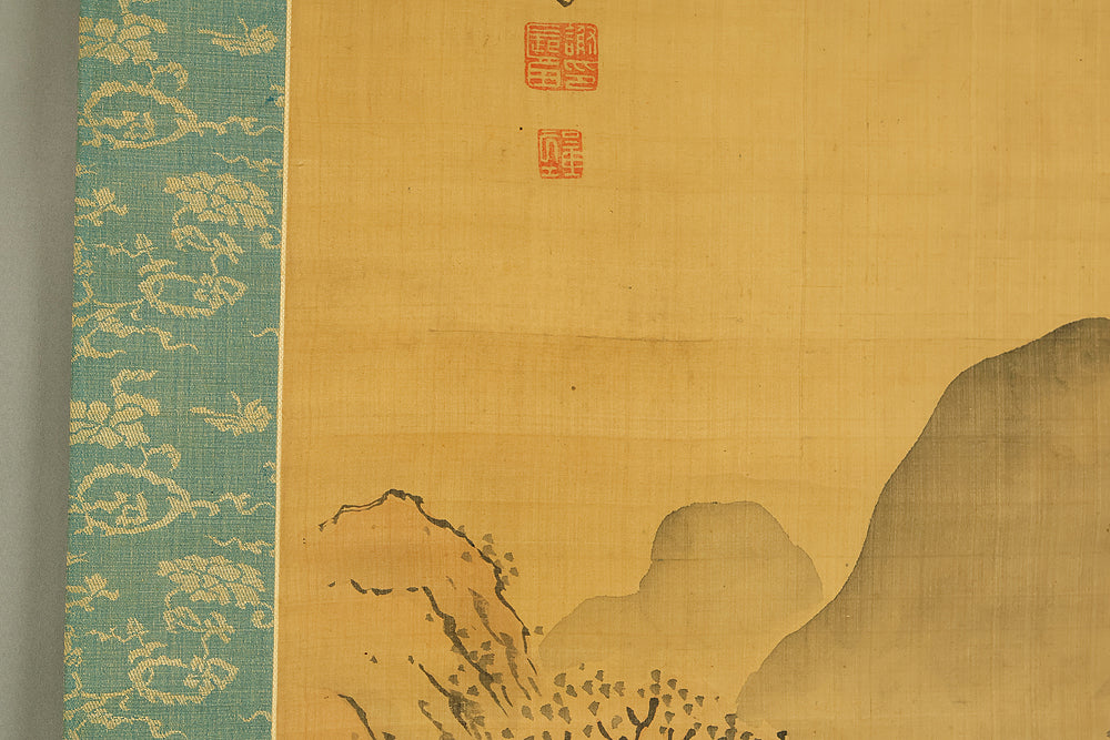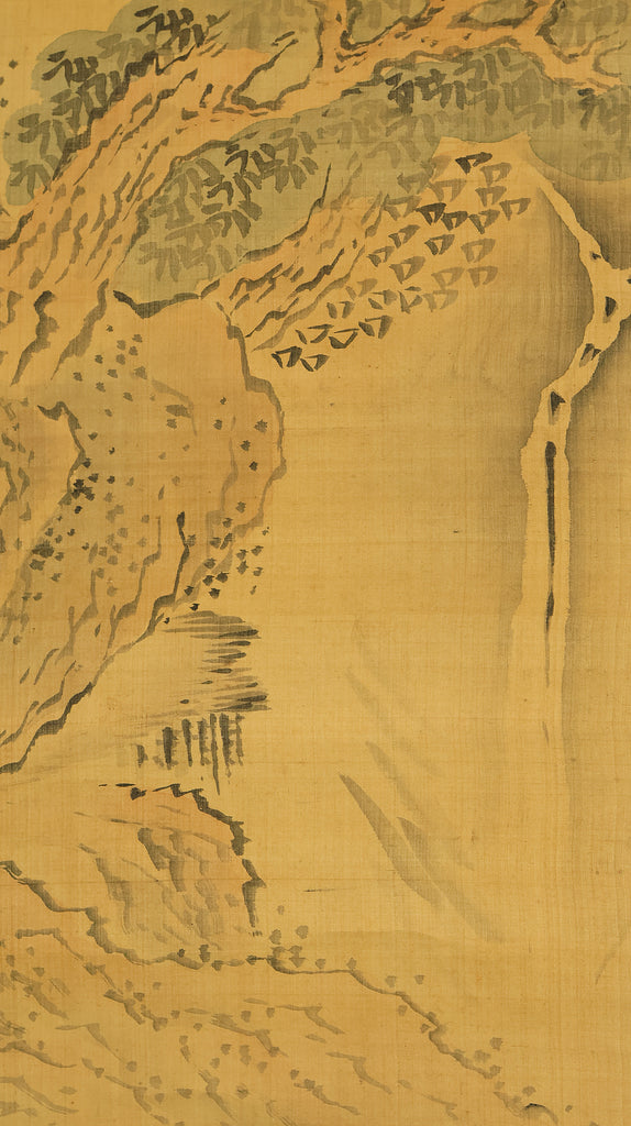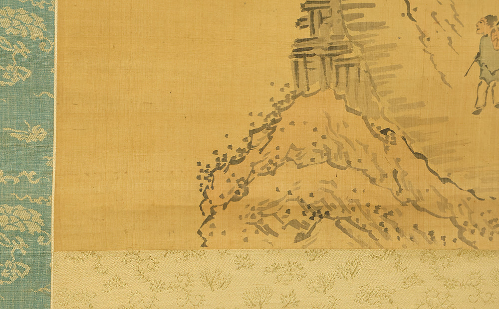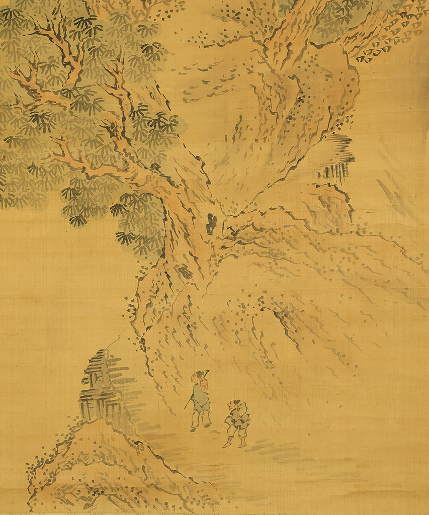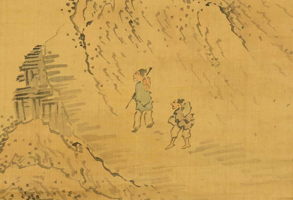 This poetic Japanese hanging scroll depicts travelers ascending a mountain path, rendered in delicate ink tones and subtle brushwork. The composition is by Yosa Buson (1716–1784), a master of Nanga (literati painting) and one of Japan’s greatest haiku poets. The figures—possibly a sage and attendant—evoke themes of spiritual journey, philosophical inquiry, and harmony with nature. Buson’s landscapes often feature paths, distant peaks, and solitary travelers, reflecting the contemplative ideals of Chinese literati painting and the poetic sensibility of Edo-period Japan. Buson’s art blends visual minimalism with narrative depth, using space and perspective to suggest impermanence, solitude, and the quiet dignity of rural life. His works are prized for their ability to evoke emotion through simplicity.