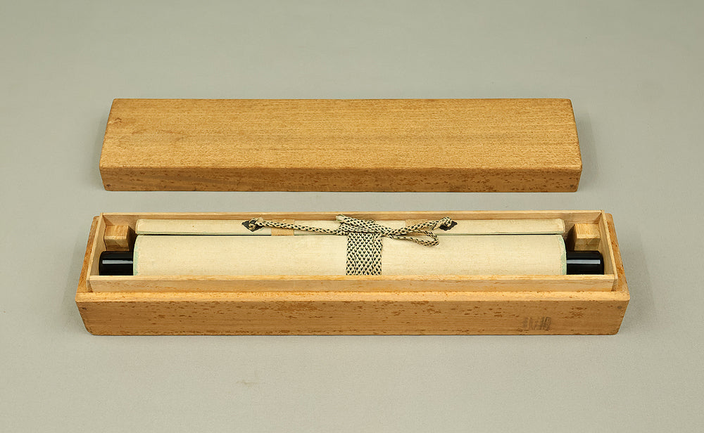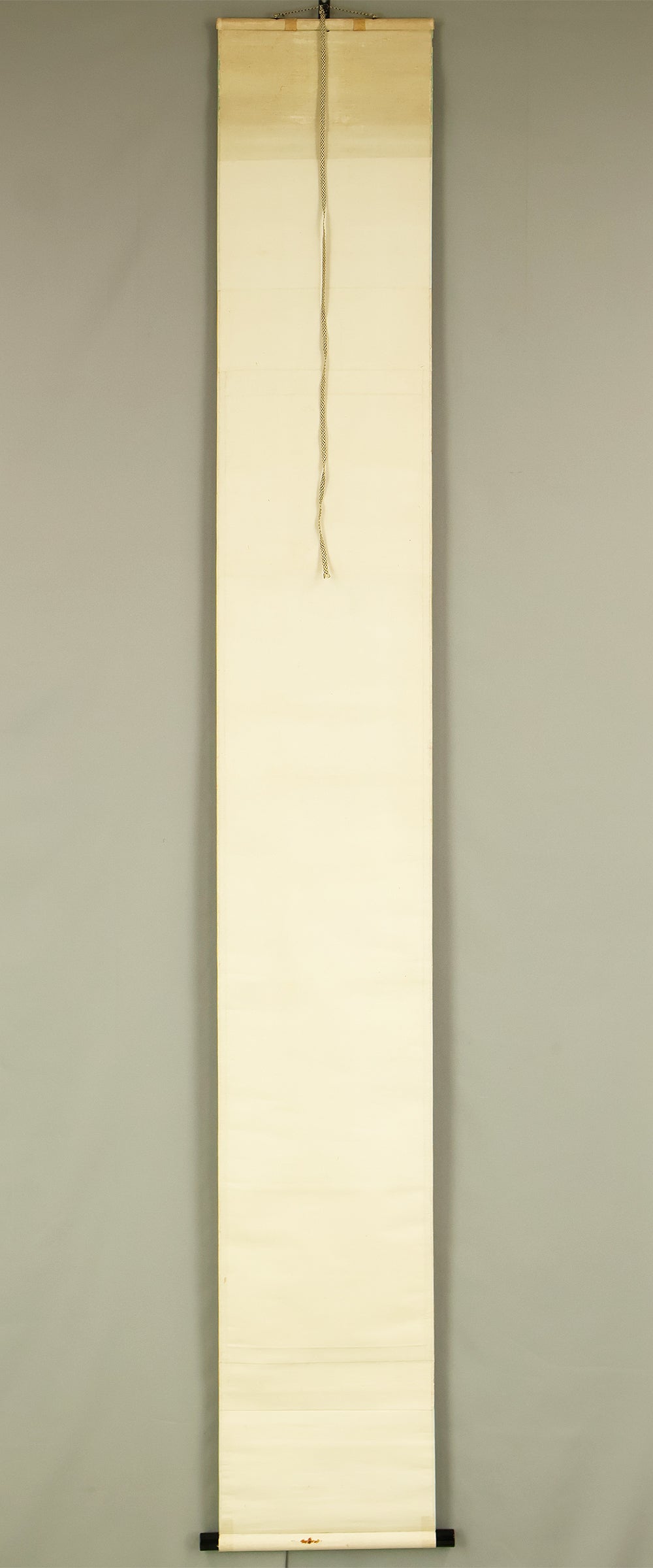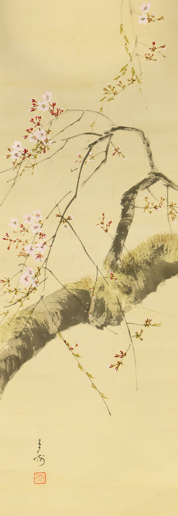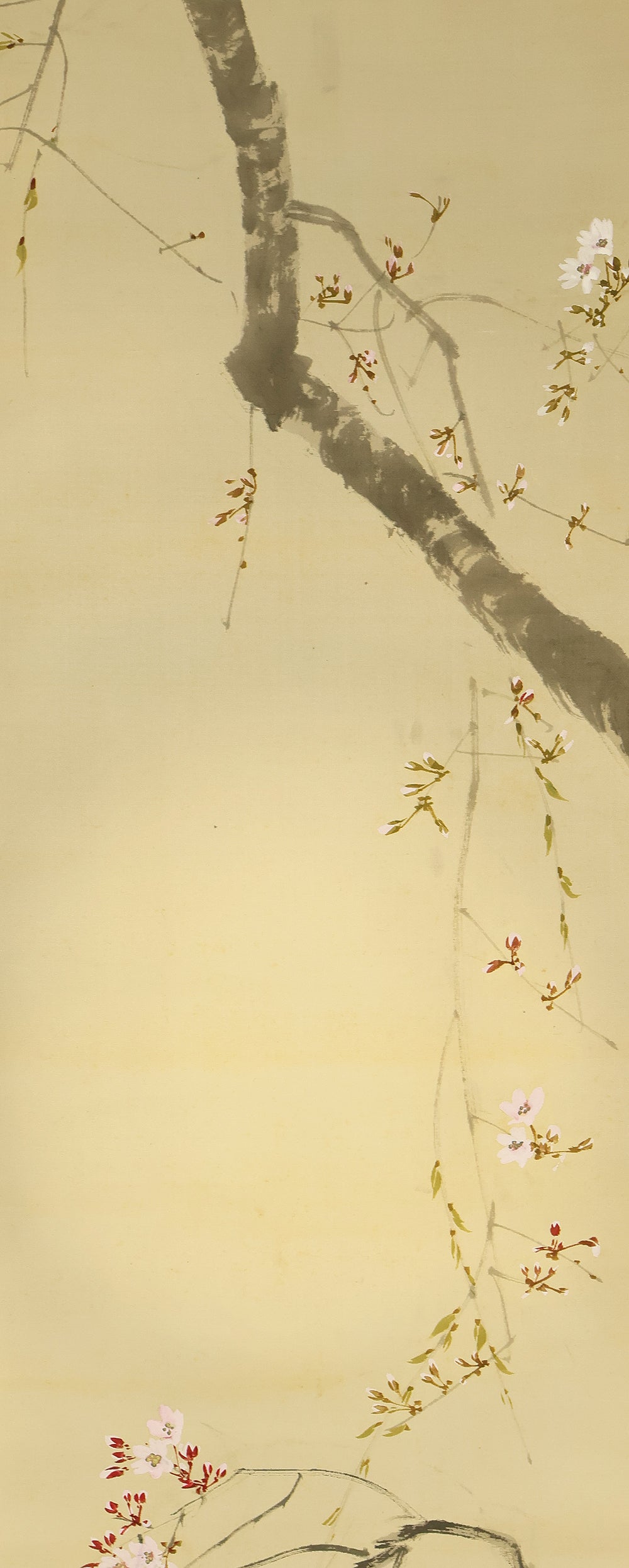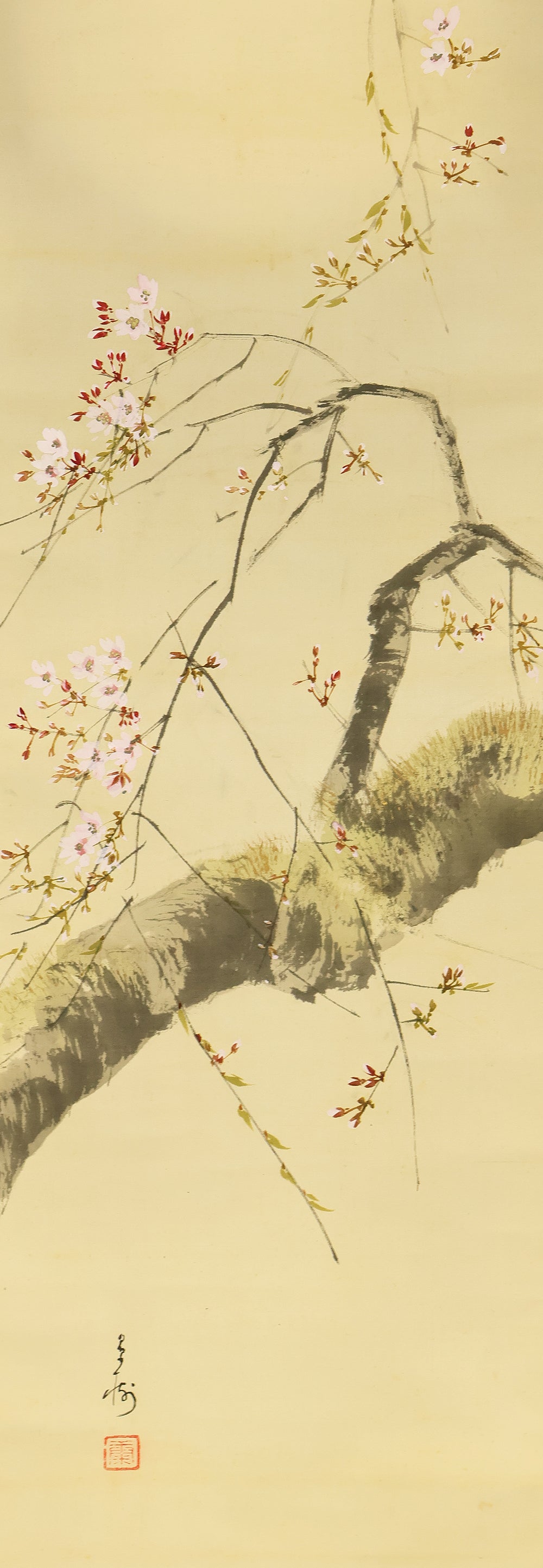 A lyrical and seasonally evocative hanging scroll by Imai Keiju (今井景樹), a Kyoto-based painter active in the early to mid-20th century. Known for his refined brushwork and poetic sensibility, Keiju specialized in nihonga compositions that celebrate the quiet beauty of nature. This work depicts a delicate scene of weeping cherry blossoms (shidare-zakura) beneath a hazy spring moon (oborozuki)—a motif deeply rooted in Japanese aesthetics and classical poetry. The soft petals and misty moonlight evoke themes of transience (mujō) and emotional subtlety, inviting quiet contemplation. Executed with gentle ink washes and restrained color, the painting reflects Keiju’s mastery of atmosphere and seasonal nuance. The scroll is housed in a wooden storage box, suitable for protection and presentation. A graceful and culturally resonant piece for collectors of nihonga, seasonal Japanese painting, and Kyoto school works.