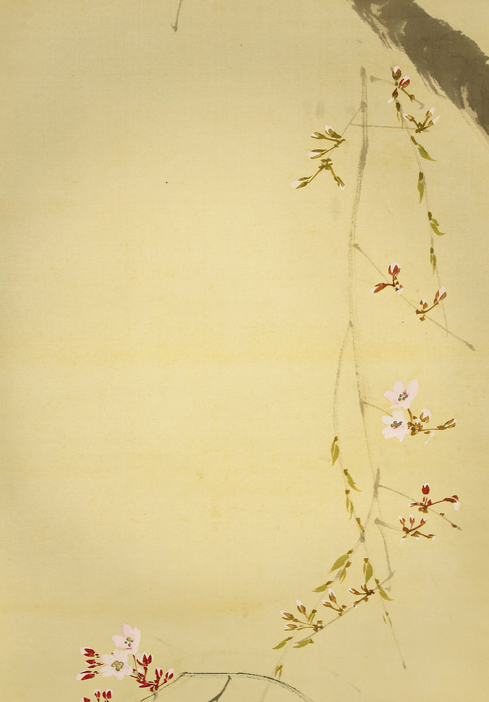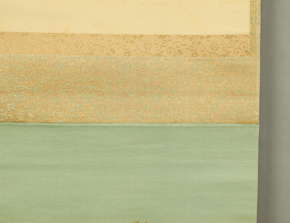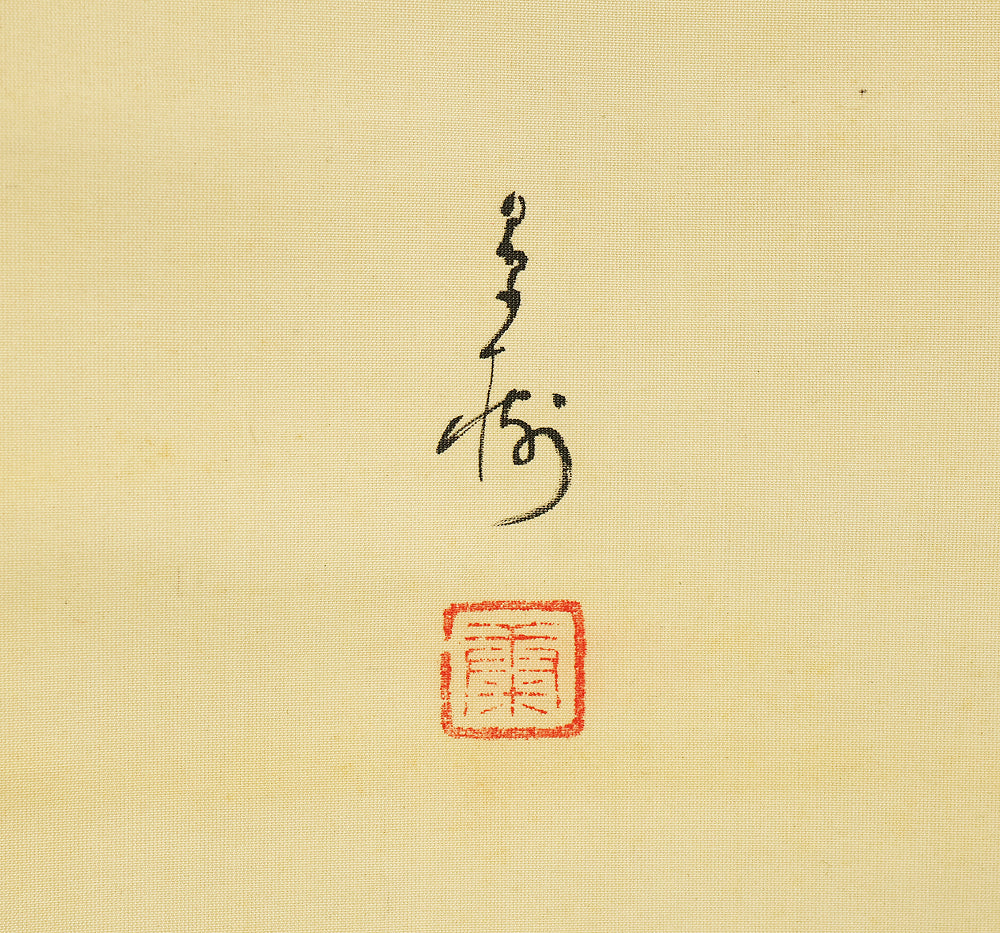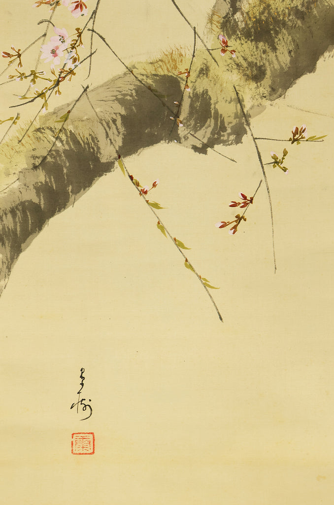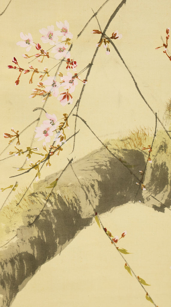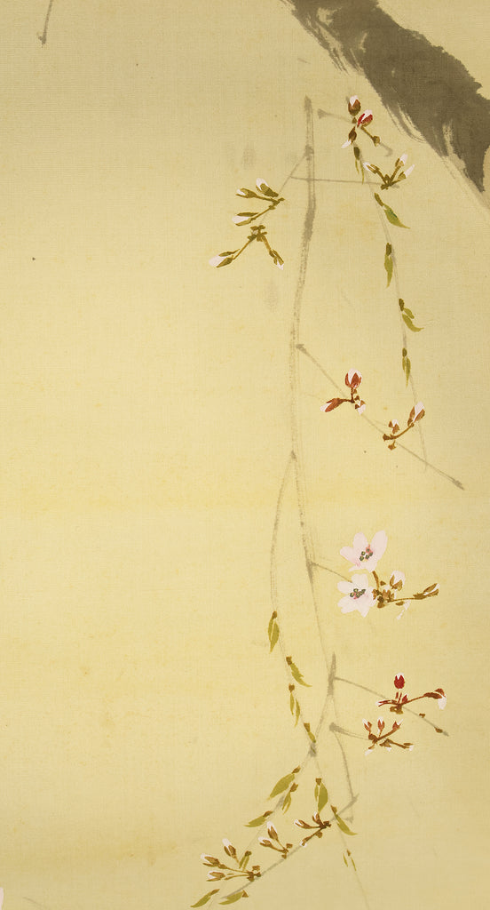 A lyrical and seasonally evocative hanging scroll by Imai Keiju (今井景樹), a Kyoto-based painter active in the early to mid-20th century. Known for his refined brushwork and poetic sensibility, Keiju specialized in nihonga compositions that celebrate the quiet beauty of nature. This work depicts a delicate scene of weeping cherry blossoms (shidare-zakura) beneath a hazy spring moon (oborozuki)—a motif deeply rooted in Japanese aesthetics and classical poetry. The soft petals and misty moonlight evoke themes of transience (mujō) and emotional subtlety, inviting quiet contemplation. Executed with gentle ink washes and restrained color, the painting reflects Keiju’s mastery of atmosphere and seasonal nuance. The scroll is housed in a wooden storage box, suitable for protection and presentation. A graceful and culturally resonant piece for collectors of nihonga, seasonal Japanese painting, and Kyoto school works.