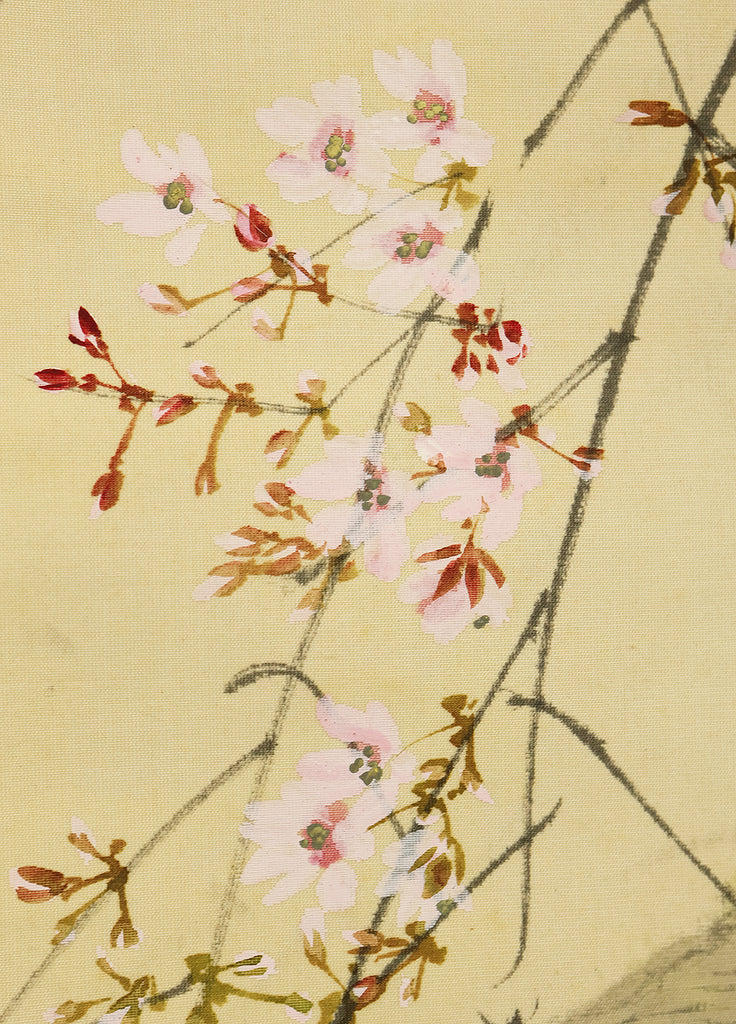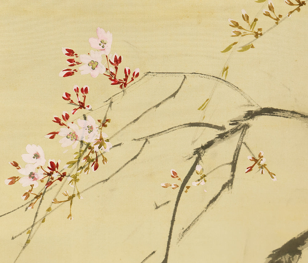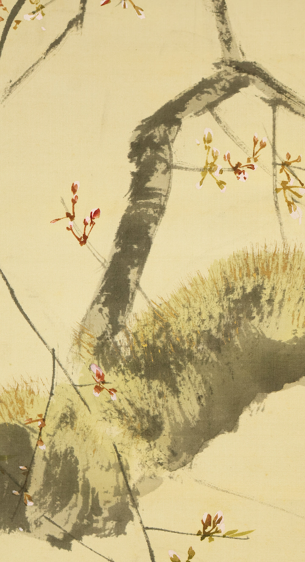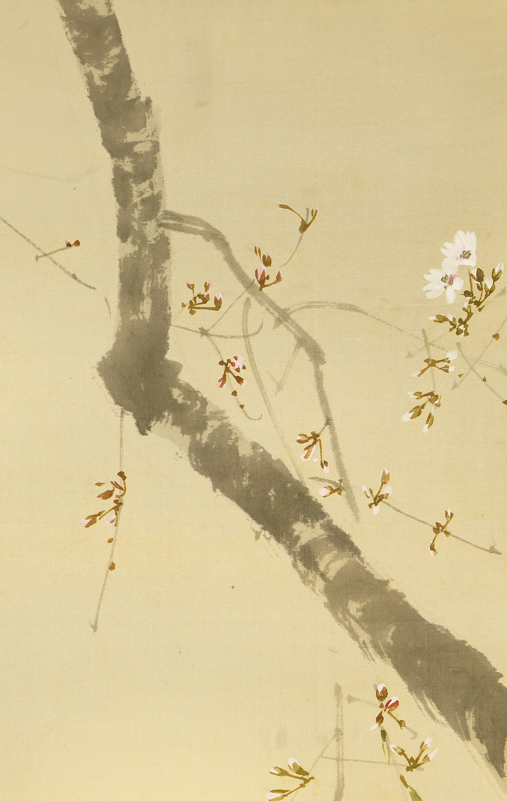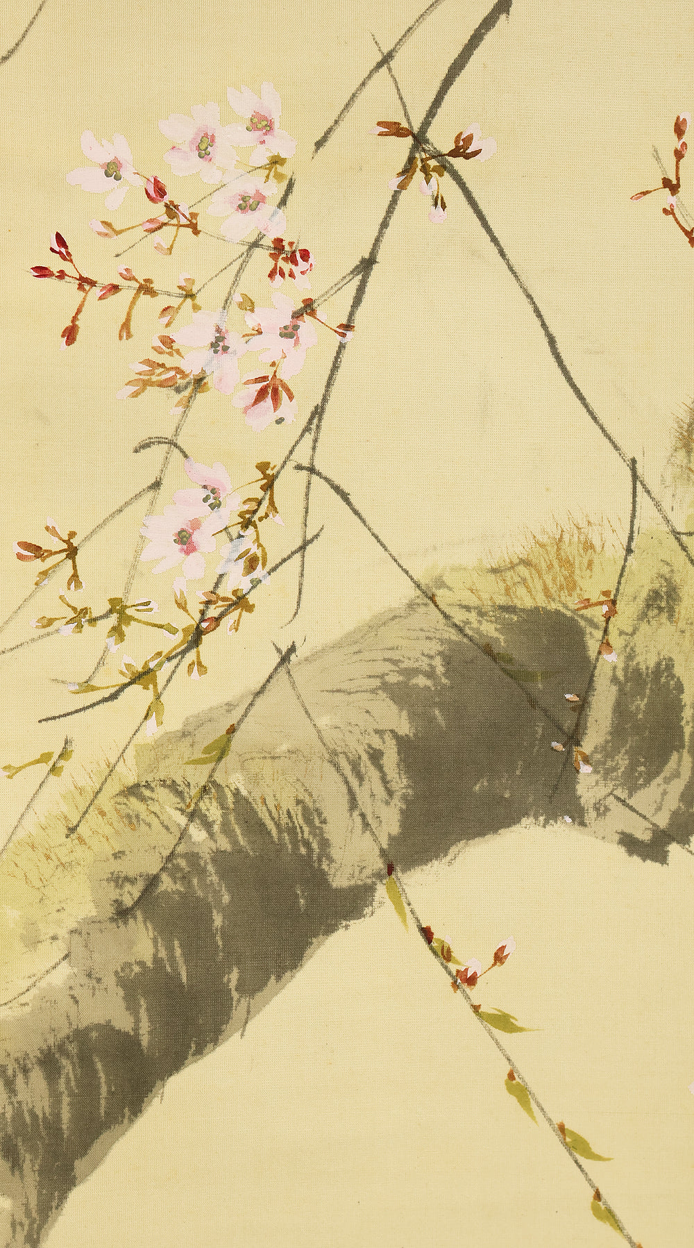 A lyrical and seasonally evocative hanging scroll by Imai Keiju (今井景樹), a Kyoto-based painter active in the early to mid-20th century. Known for his refined brushwork and poetic sensibility, Keiju specialized in nihonga compositions that celebrate the quiet beauty of nature. This work depicts a delicate scene of weeping cherry blossoms (shidare-zakura) beneath a hazy spring moon (oborozuki)—a motif deeply rooted in Japanese aesthetics and classical poetry. The soft petals and misty moonlight evoke themes of transience (mujō) and emotional subtlety, inviting quiet contemplation. Executed with gentle ink washes and restrained color, the painting reflects Keiju’s mastery of atmosphere and seasonal nuance. The scroll is housed in a wooden storage box, suitable for protection and presentation. A graceful and culturally resonant piece for collectors of nihonga, seasonal Japanese painting, and Kyoto school works.