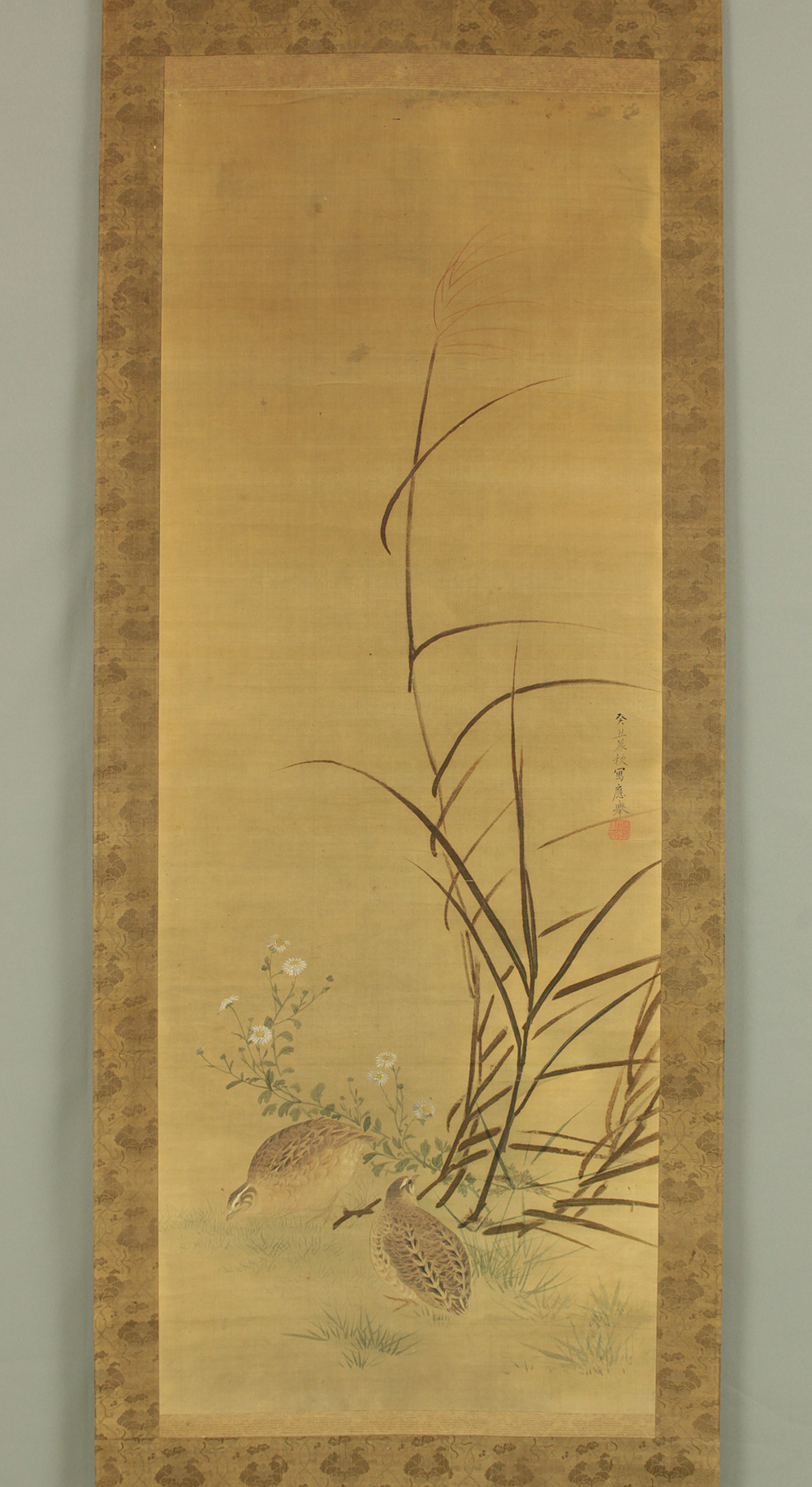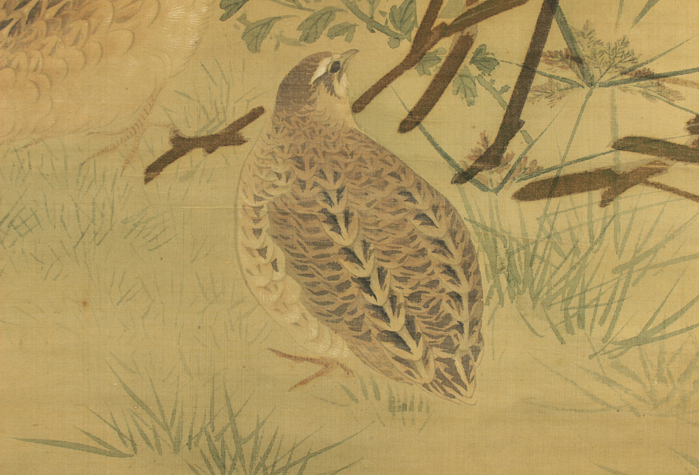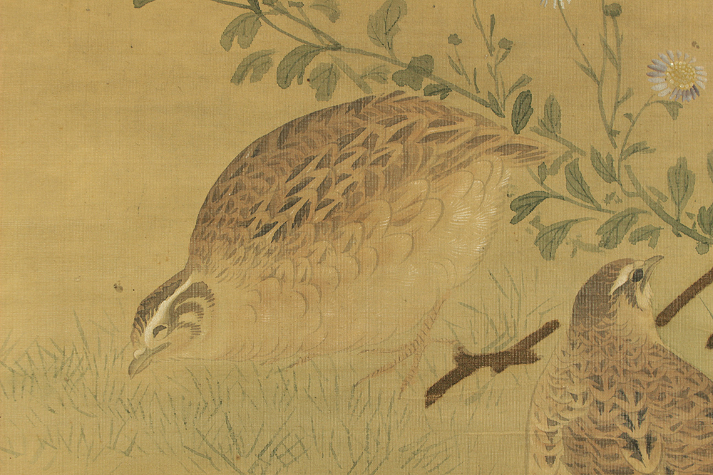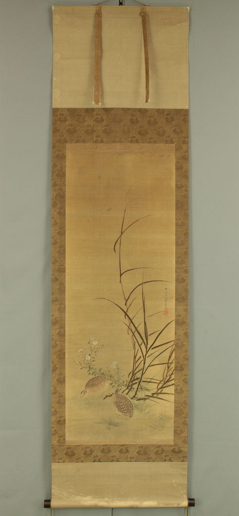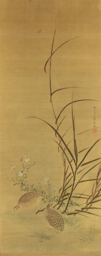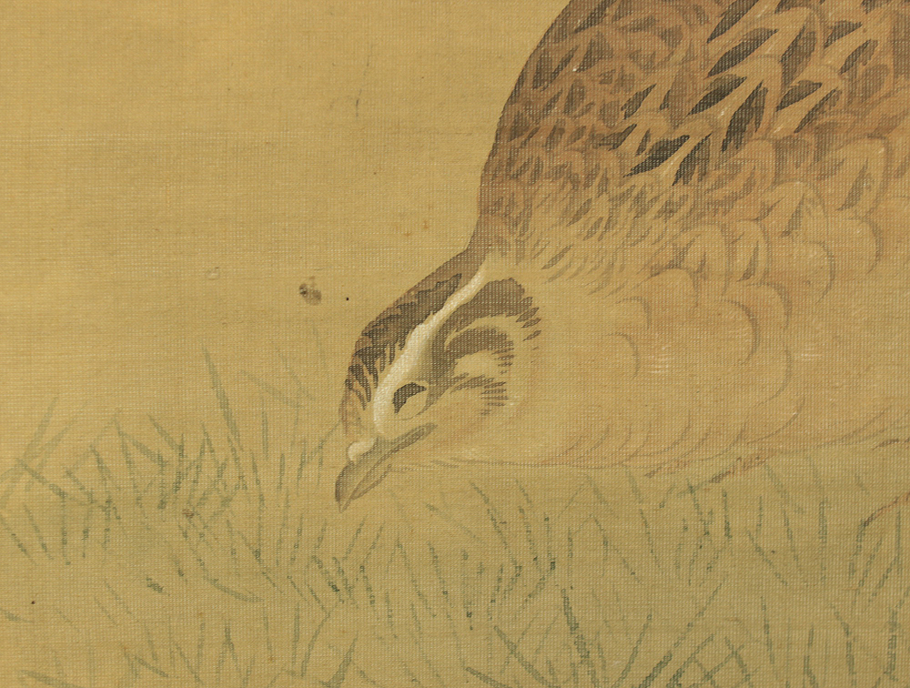 Attributed to 円山応挙 Maruyama Okyo (1733-1795) Japanese antique art kakejiku kakemono wall hanging scroll / Quail, Chrysanthemums and Silver Grass with Appraised Box RD483