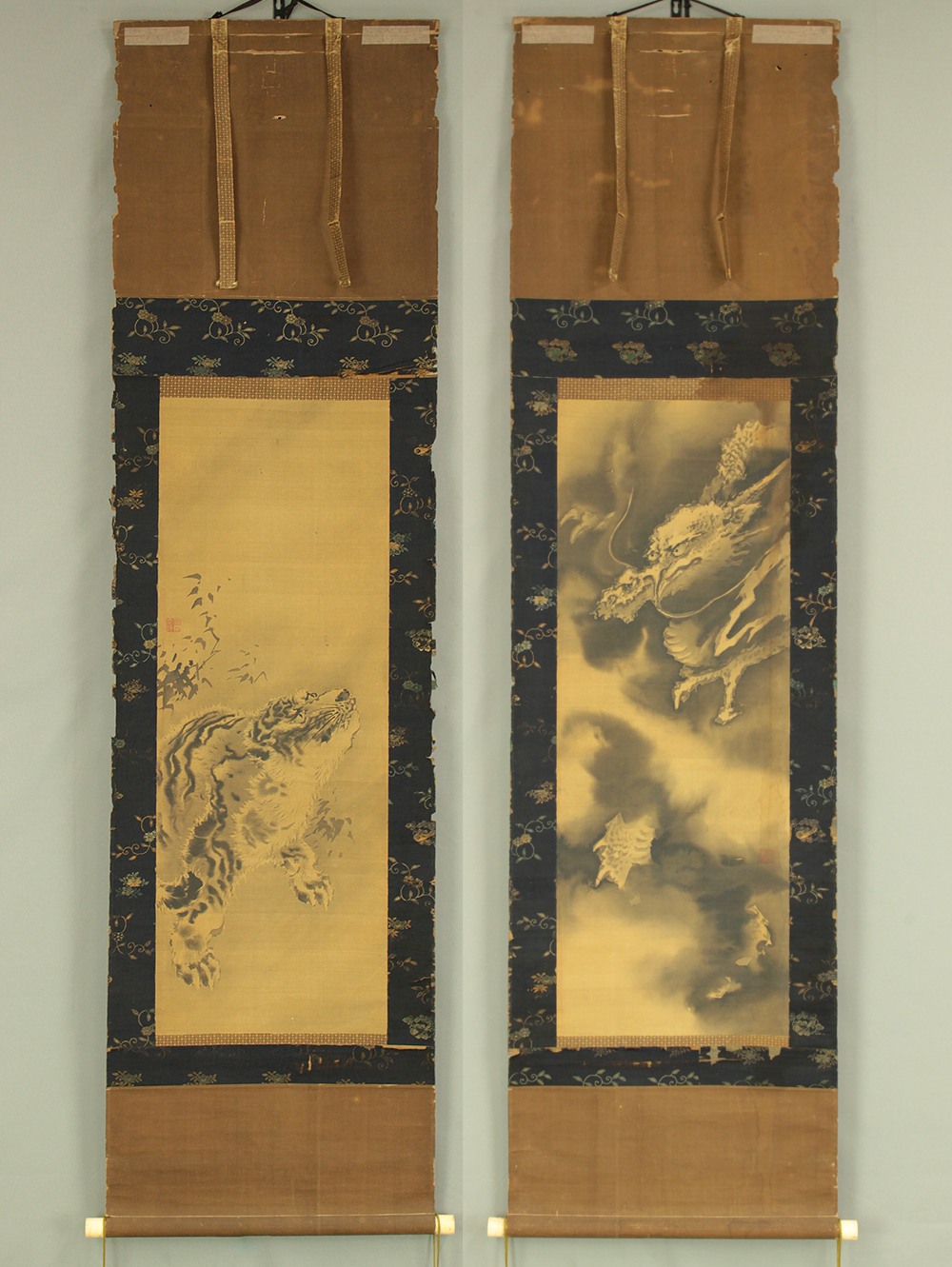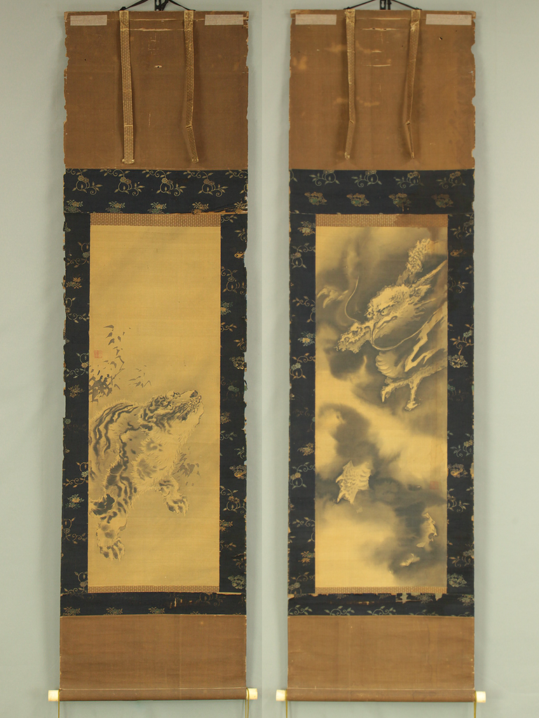 山口南嶺 Yamaguchi Nanrei Japanese antique art paired kakejiku kakemono wall hanging scrolls / Suiboku Ink Dragon and Tiger with Box RD508