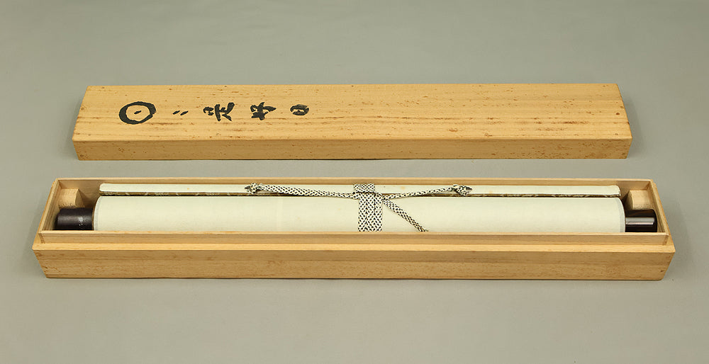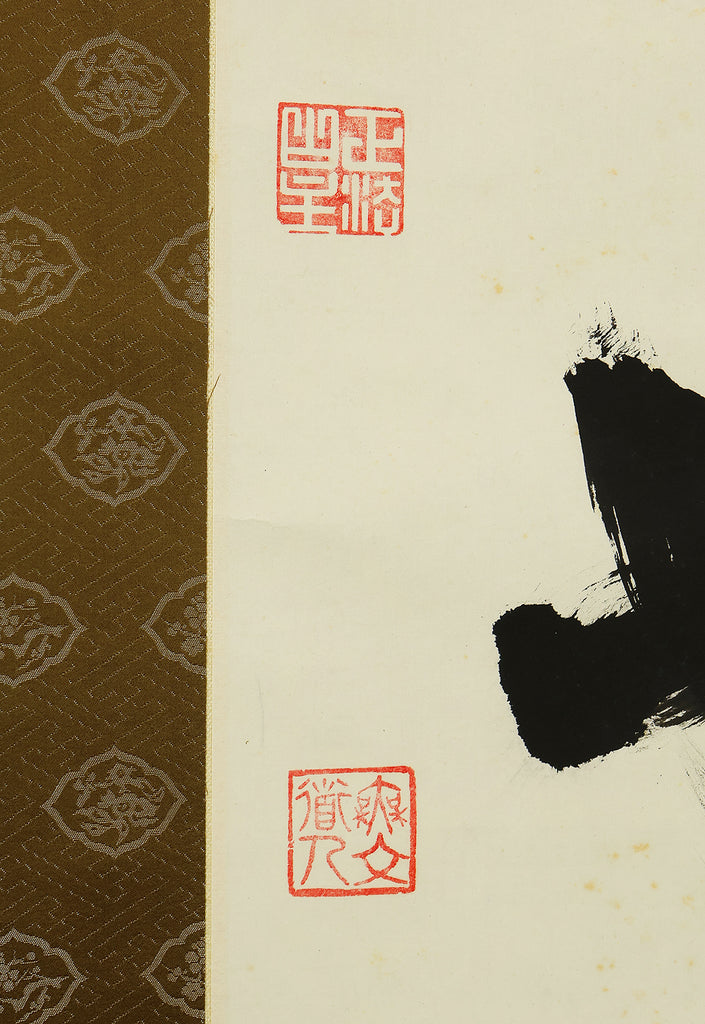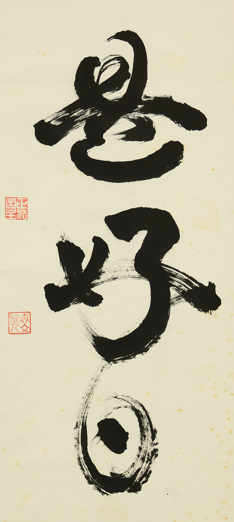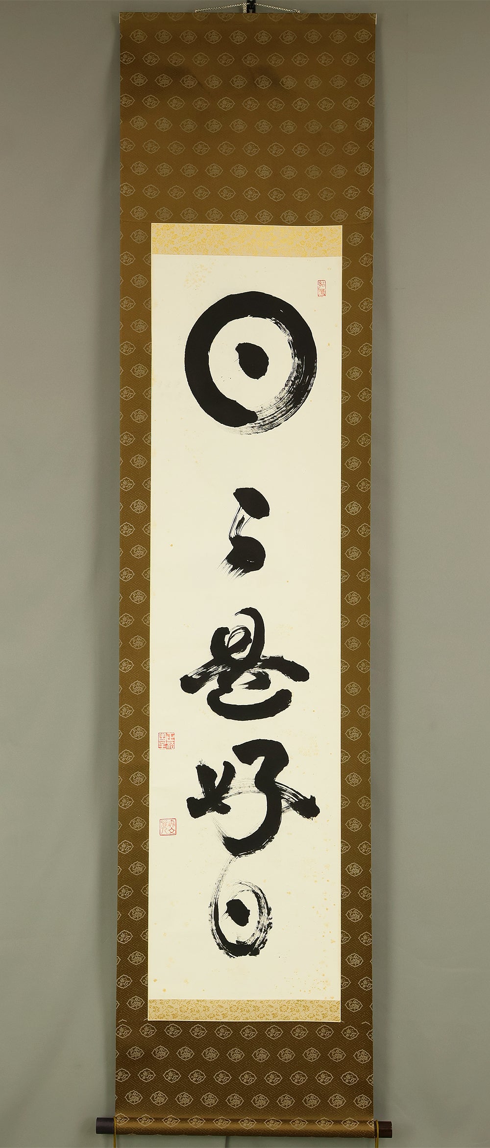 A powerful single-line calligraphy (ichigyōsho) by Yamada Mumon, a renowned Rinzai Zen master and calligrapher of the 20th century. His works are celebrated for their spiritual depth, expressive brushwork, and embodiment of Zen philosophy. The inscription reads 「日々是好日」(Nichinichi Kore Kōnichi), meaning “Every day is a good day.” This classic Zen phrase invites reflection on mindfulness, acceptance, and the inherent beauty of each moment, regardless of circumstance. Executed in bold, spontaneous strokes, the calligraphy conveys both strength and serenity. The scroll is mounted in traditional format and includes the original tomobako (signed wooden box), confirming authenticity and enhancing its value for collectors. An inspiring piece for admirers of Zen art, Japanese calligraphy, and philosophical aesthetics.