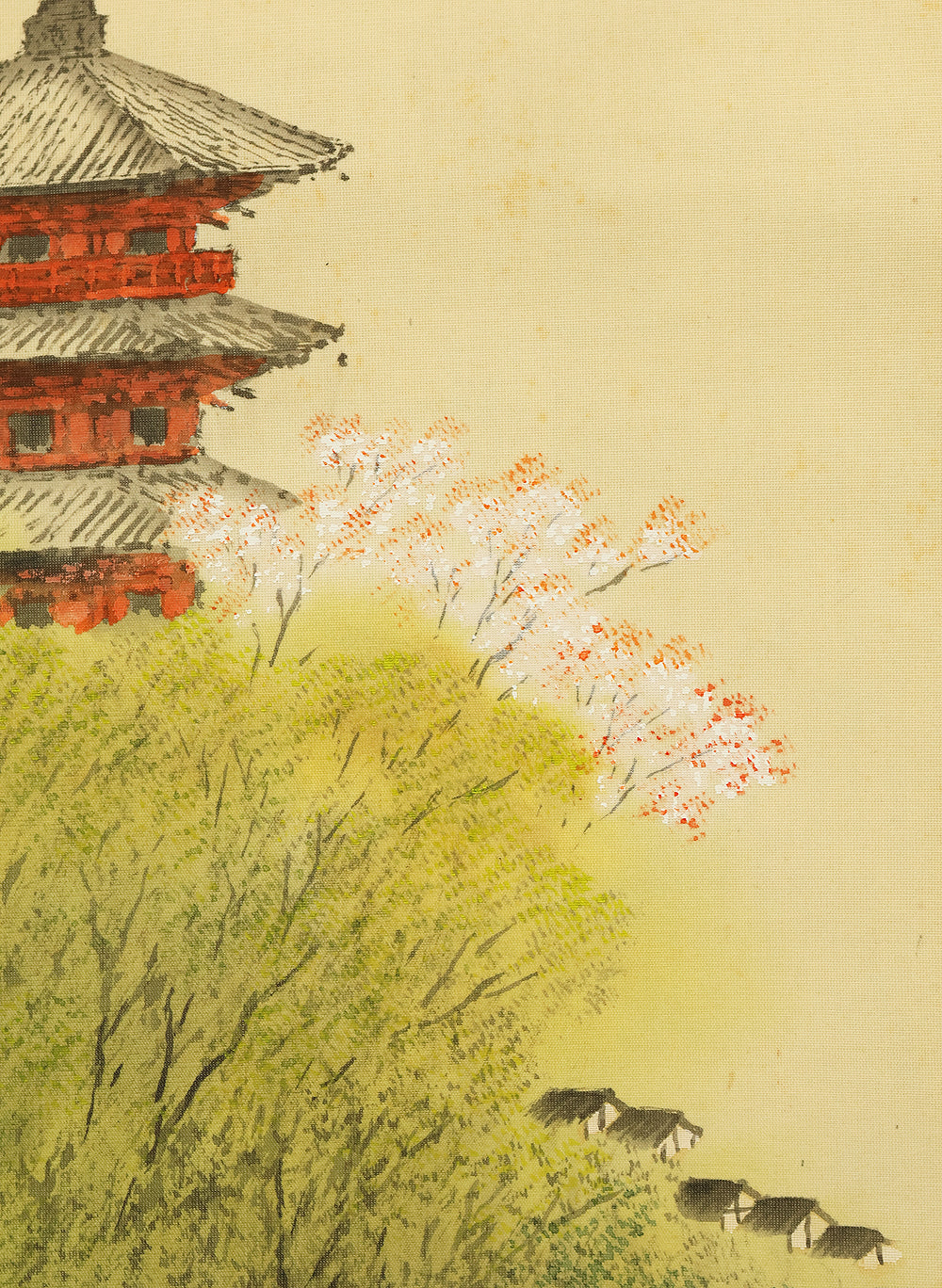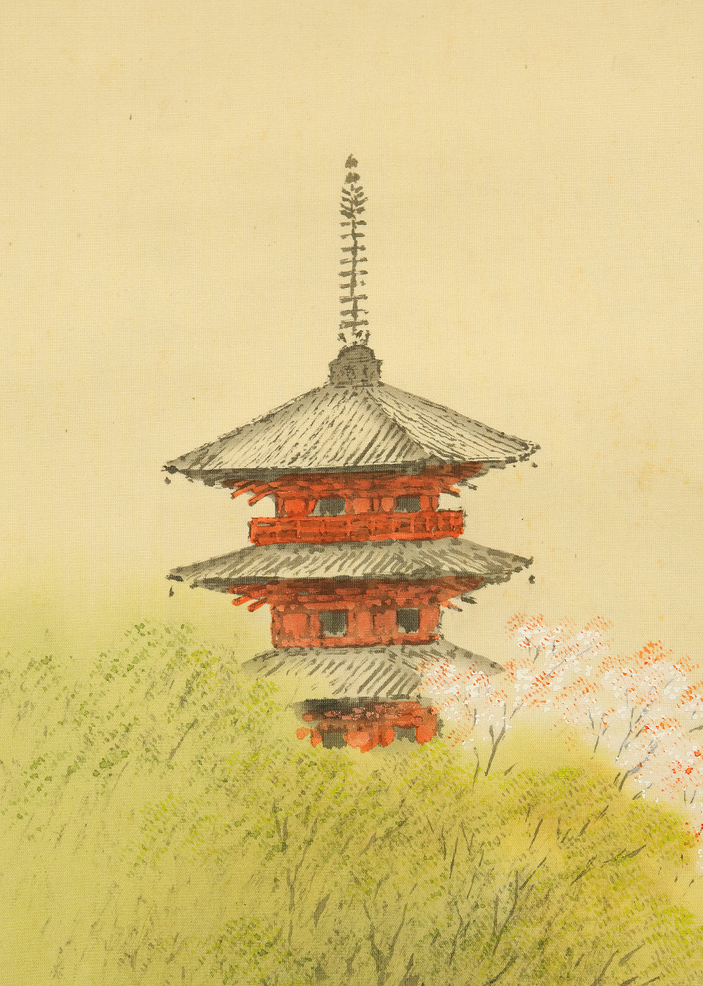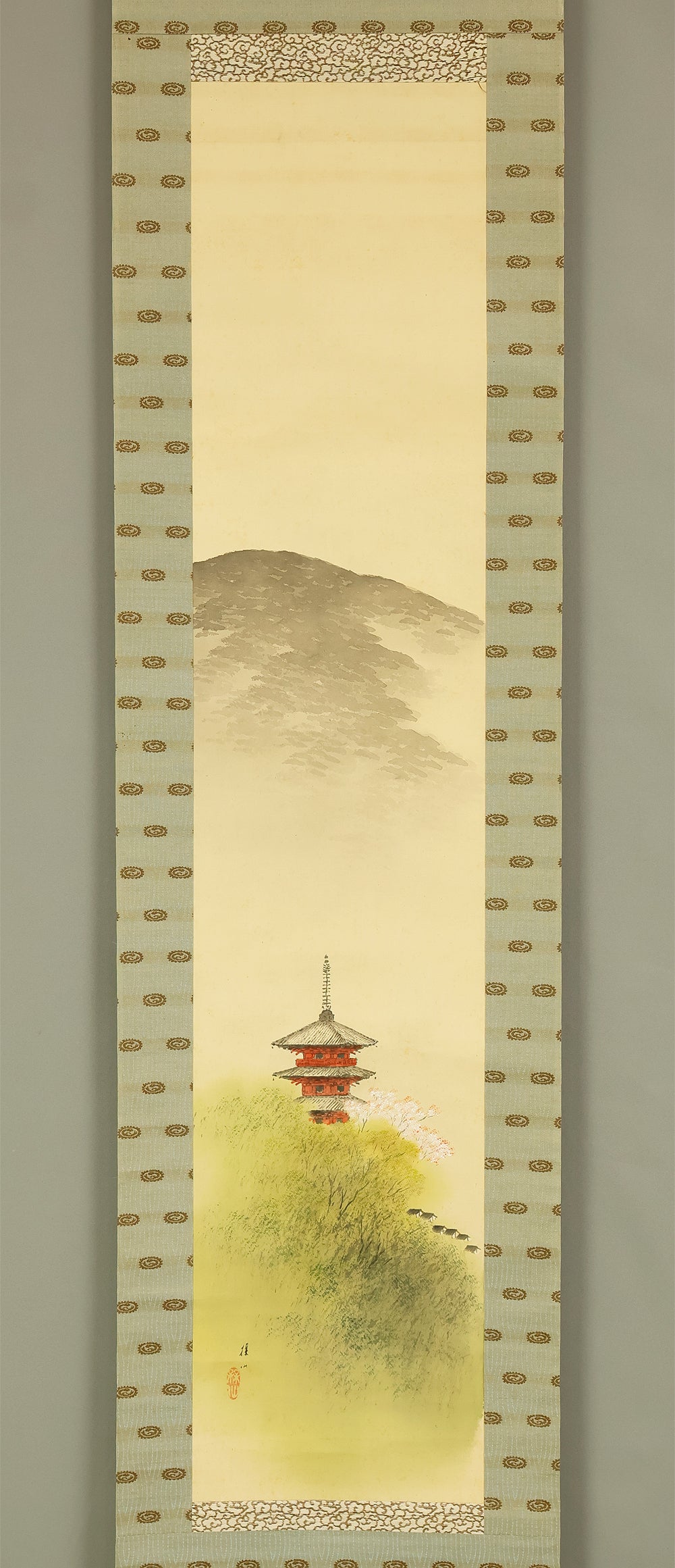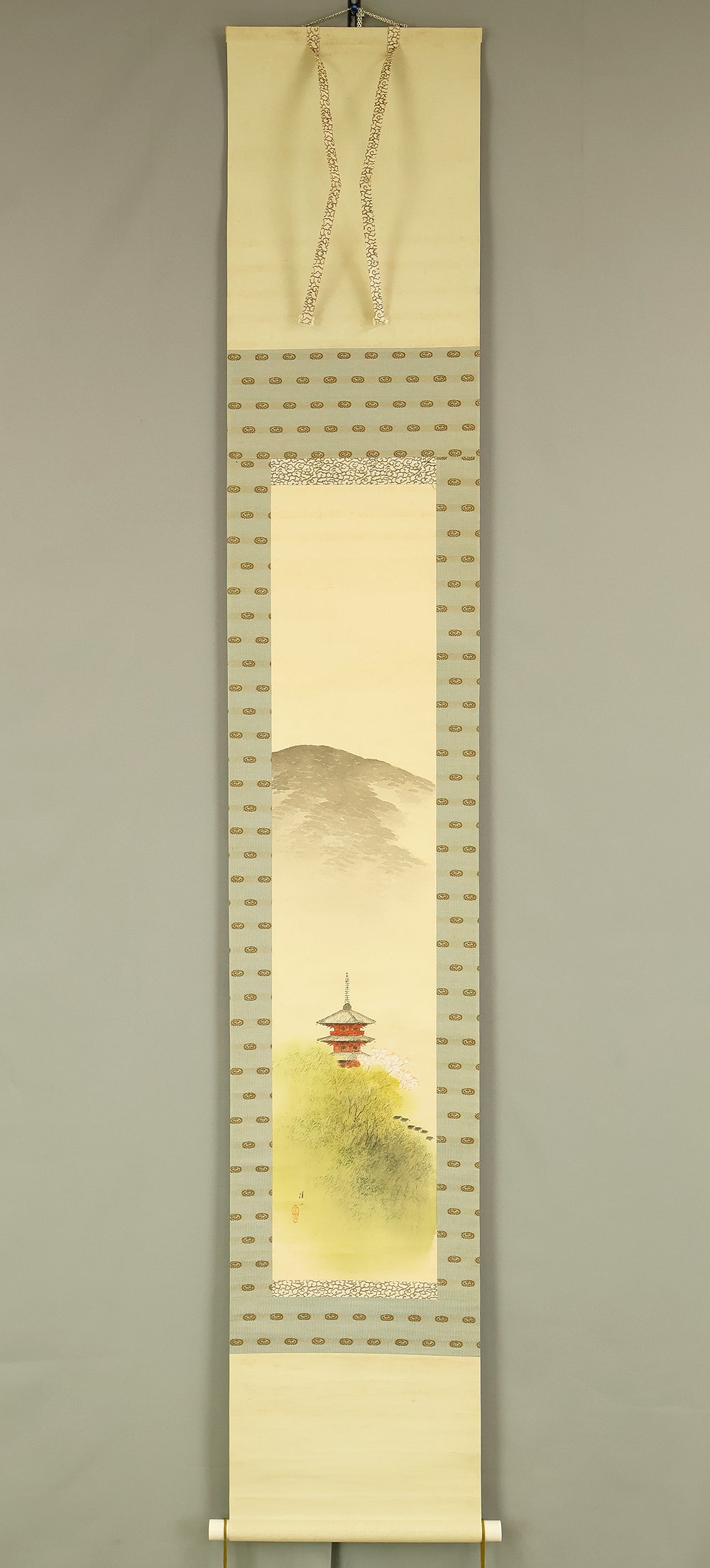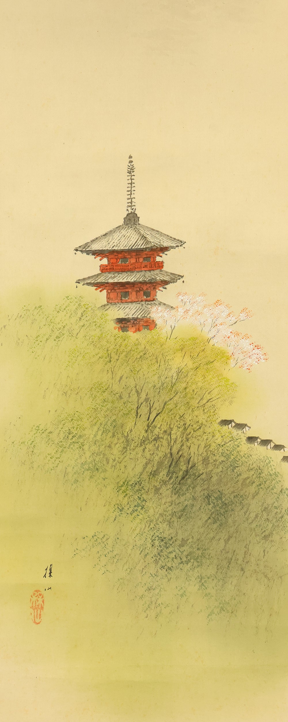 平井楳仙 Hirai Baisen (1889-1969) Japanese art kakejiku kakemono wall hanging scroll / Kyoto Pagoda in Spring Mountain Scenery with Original Double Box (Tomobako) RD882