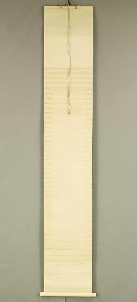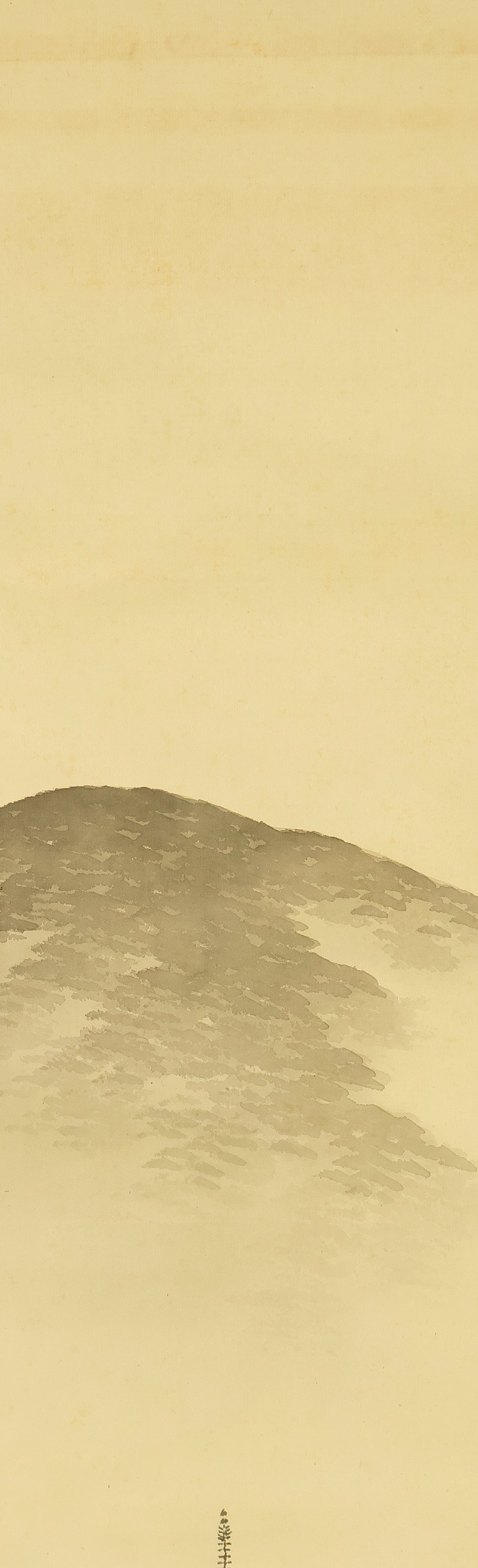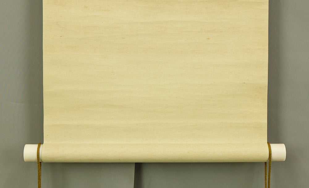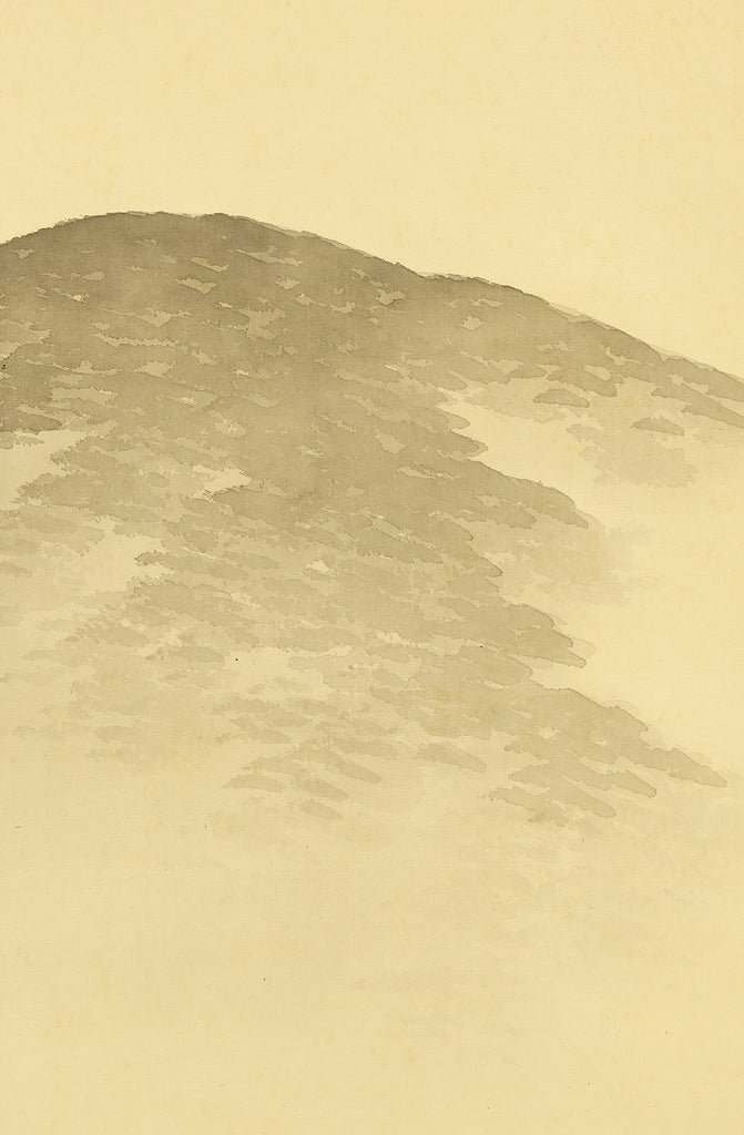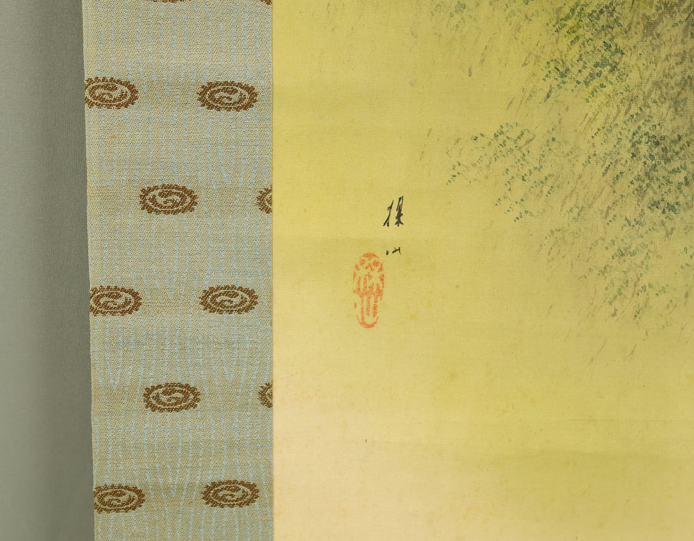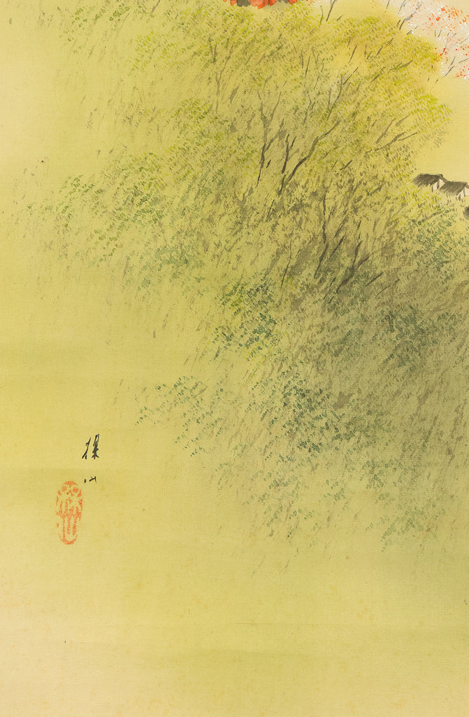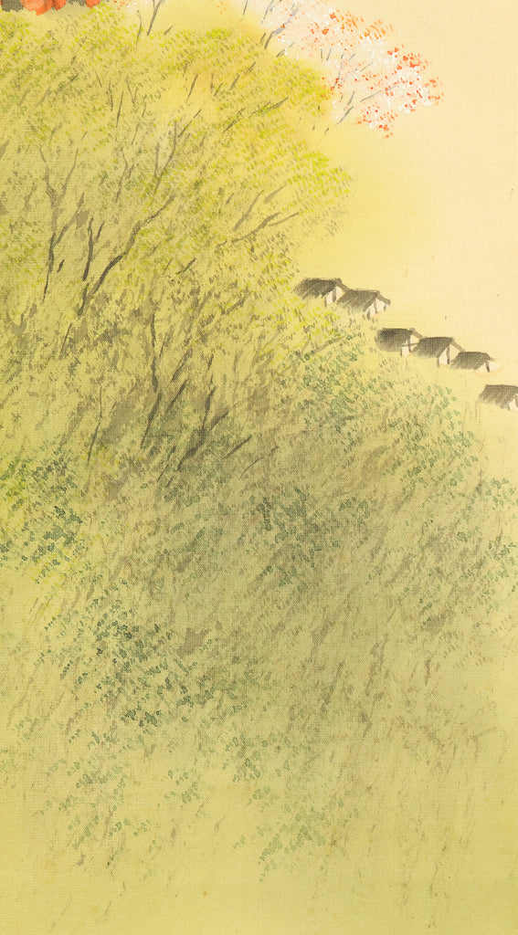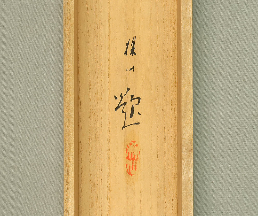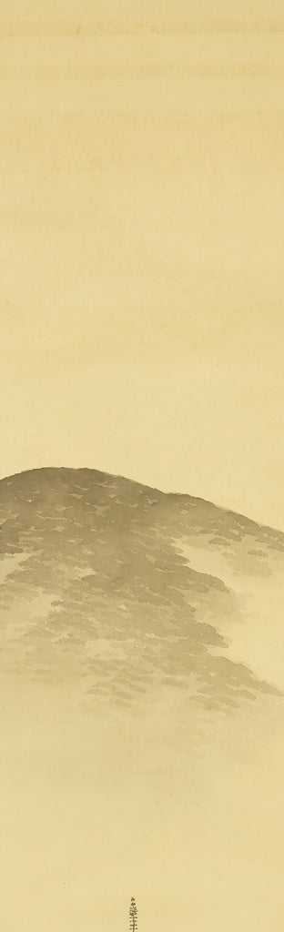 This elegant hanging scroll by Hirai Baisen (1889–1969) captures the serene beauty of Kyoto’s eastern hills in springtime. The composition features a red pagoda nestled among lush foliage, with misty mountains rising in the background — a tranquil scene rendered in soft, harmonious tones. The title inscribed on the box, “Tōzan Shunshoku” (東山春色), translates to “Spring Colors of the Eastern Hills”, referring to the Higashiyama district of Kyoto. This area, rich in temples, gardens, and cultural heritage, has long inspired artists and poets as a symbol of seasonal renewal and spiritual calm. Hirai Baisen, active in the Taishō and Shōwa periods, was known for his lyrical landscapes and refined brushwork. His paintings often reflect a deep sensitivity to nature’s rhythms and a classical Japanese aesthetic rooted in harmony and restraint. The scroll is housed in its original double tomobako (wooden storage box) — an inner and outer box set — which adds significant value and provenance, indicating careful preservation and formal presentation. A superb example of modern Japanese landscape painting, ideal for collectors of Kyoto-themed works and seasonal compositions.