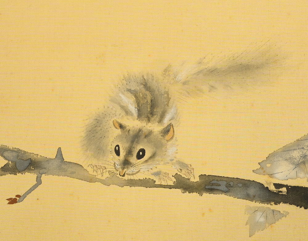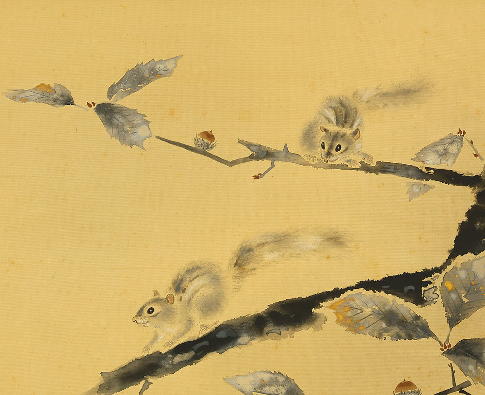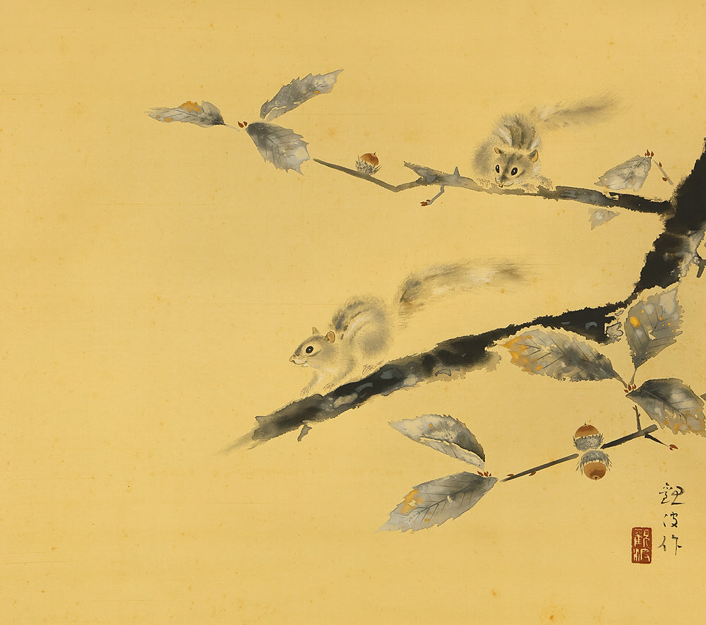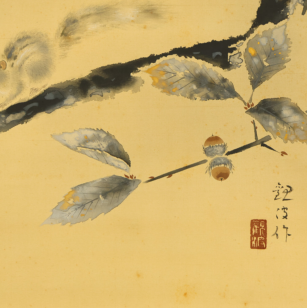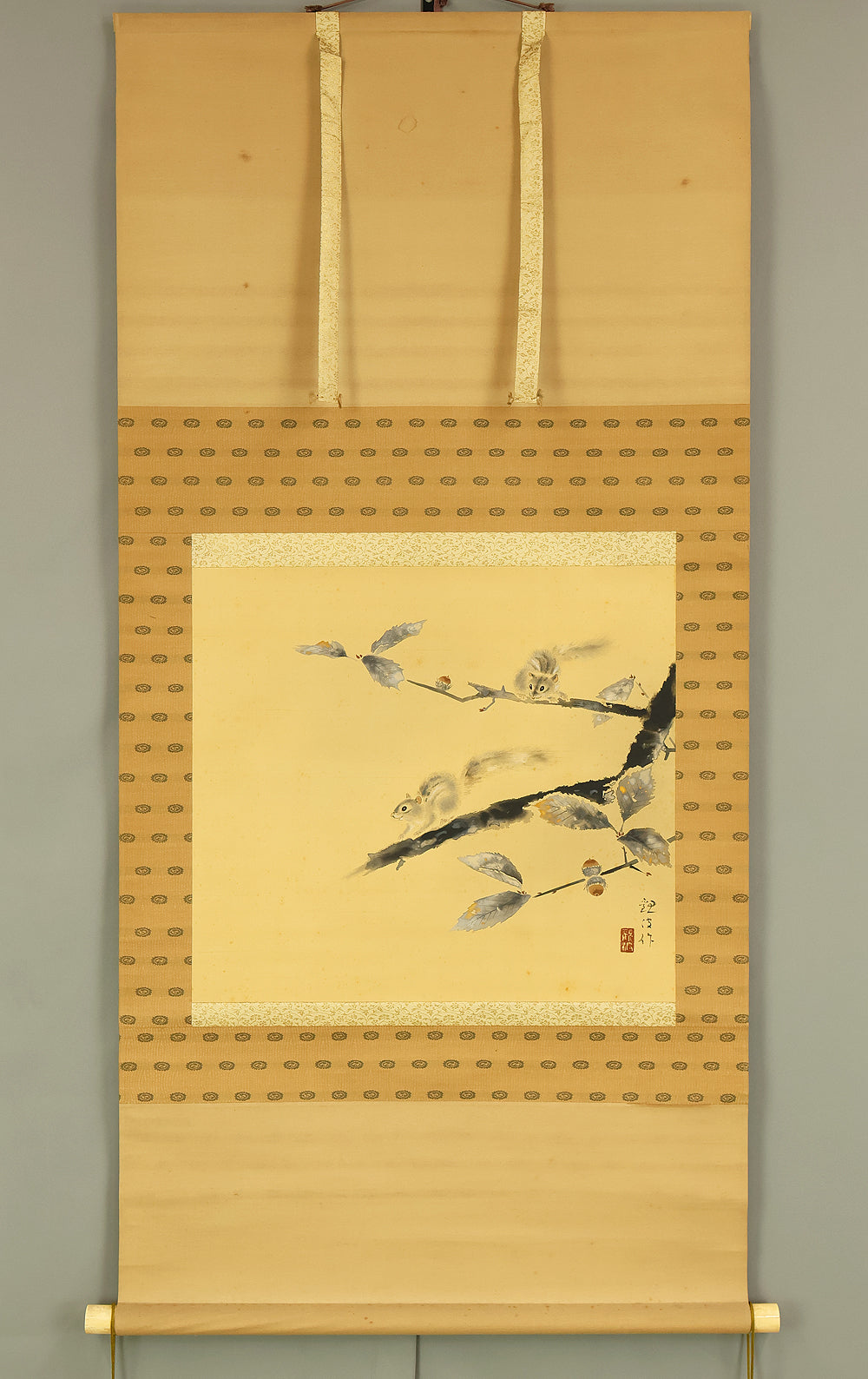 This charming Japanese hanging scroll features a squirrel perched on an oak branch, surrounded by acorns and autumn foliage. Painted by Asai Kanpa (1897–1985), a distinguished Nihonga artist known for his refined flower-and-bird compositions, the work captures the seasonal beauty and symbolic warmth of autumn. In Japanese and East Asian symbolism, squirrels represent diligence, preparation, and domestic harmony, while acorns signify growth, prosperity, and the promise of future abundance. The pairing evokes a sense of natural balance and poetic tranquility, making it ideal for seasonal display or interior decoration. Kanpa’s brushwork combines realistic detail with lyrical composition, reflecting his training under Araki Kampō and his exposure to Indian mural traditions. His works were regularly exhibited at the Teiten and Bunten exhibitions, earning acclaim for their elegance and emotional depth.