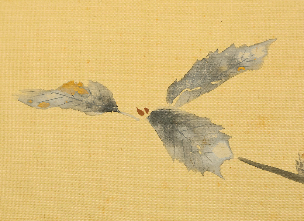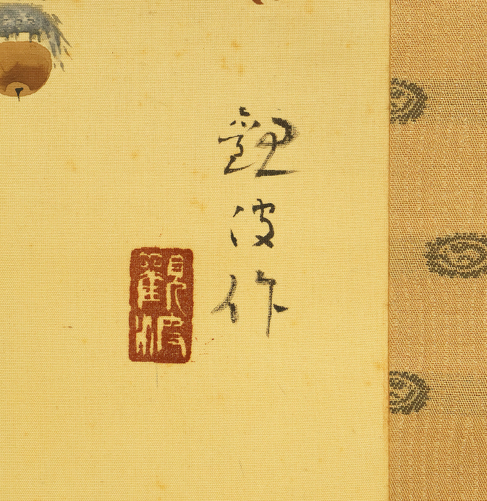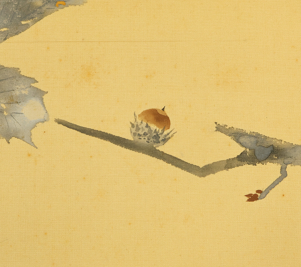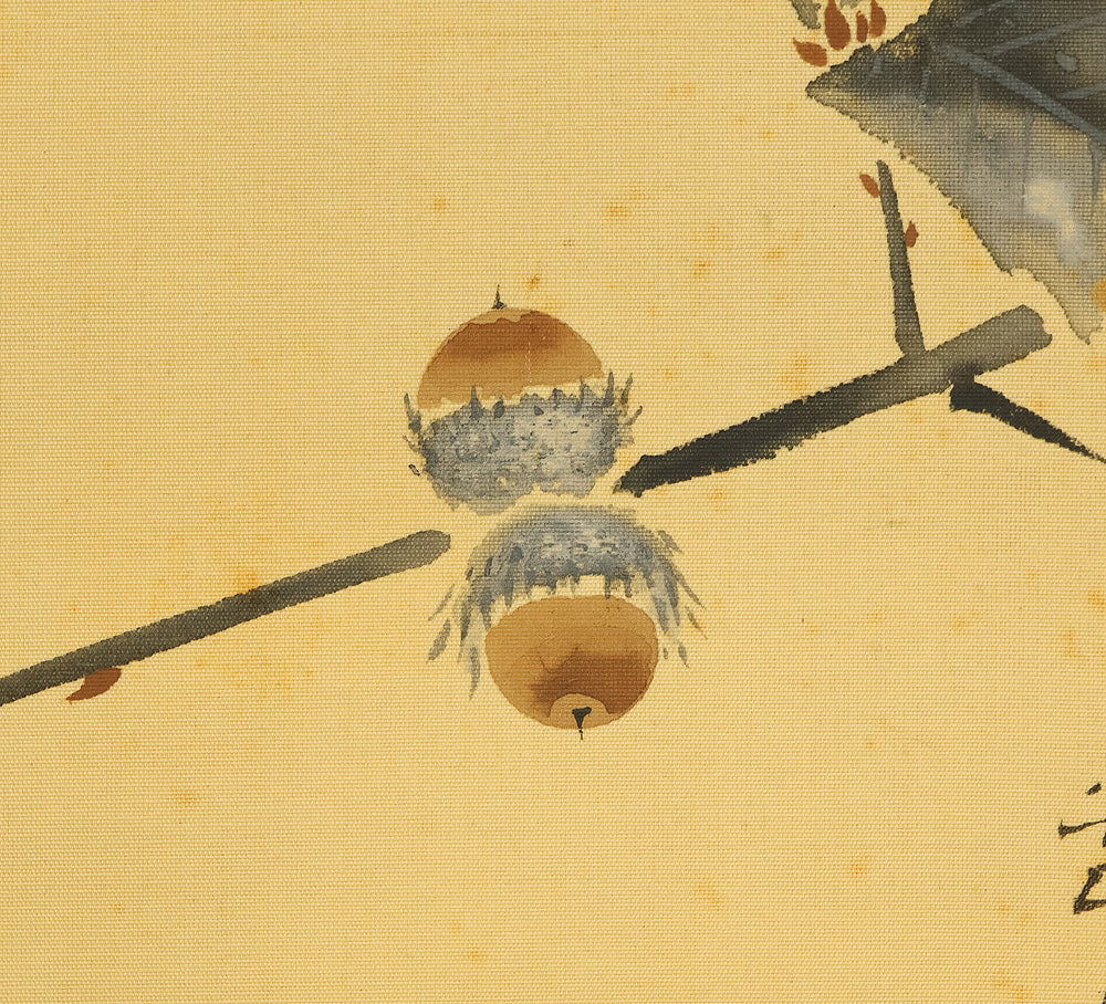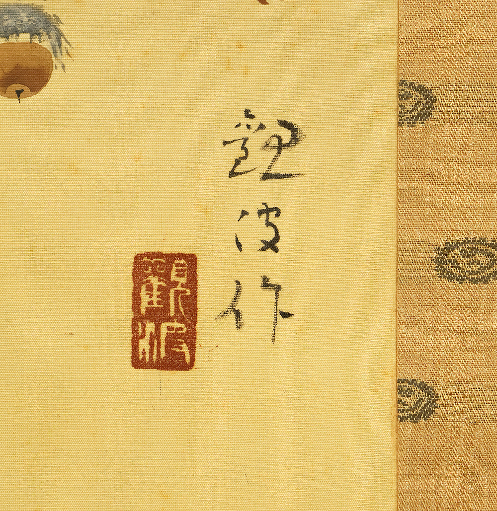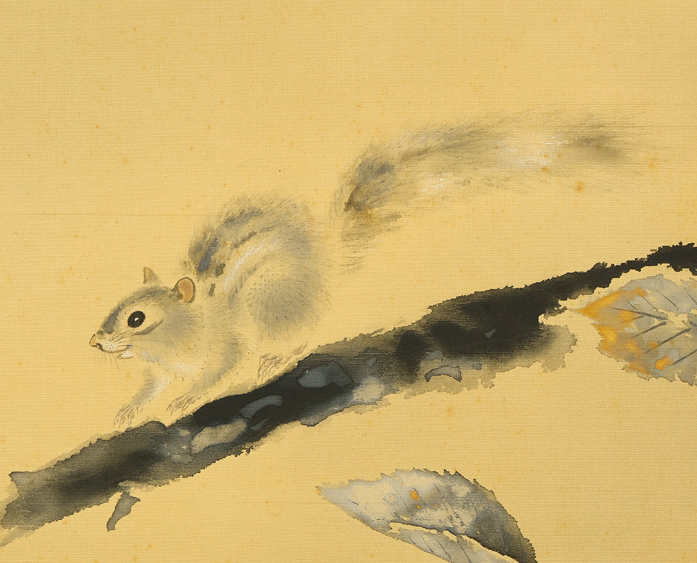 This charming Japanese hanging scroll features a squirrel perched on an oak branch, surrounded by acorns and autumn foliage. Painted by Asai Kanpa (1897–1985), a distinguished Nihonga artist known for his refined flower-and-bird compositions, the work captures the seasonal beauty and symbolic warmth of autumn. In Japanese and East Asian symbolism, squirrels represent diligence, preparation, and domestic harmony, while acorns signify growth, prosperity, and the promise of future abundance. The pairing evokes a sense of natural balance and poetic tranquility, making it ideal for seasonal display or interior decoration. Kanpa’s brushwork combines realistic detail with lyrical composition, reflecting his training under Araki Kampō and his exposure to Indian mural traditions. His works were regularly exhibited at the Teiten and Bunten exhibitions, earning acclaim for their elegance and emotional depth.