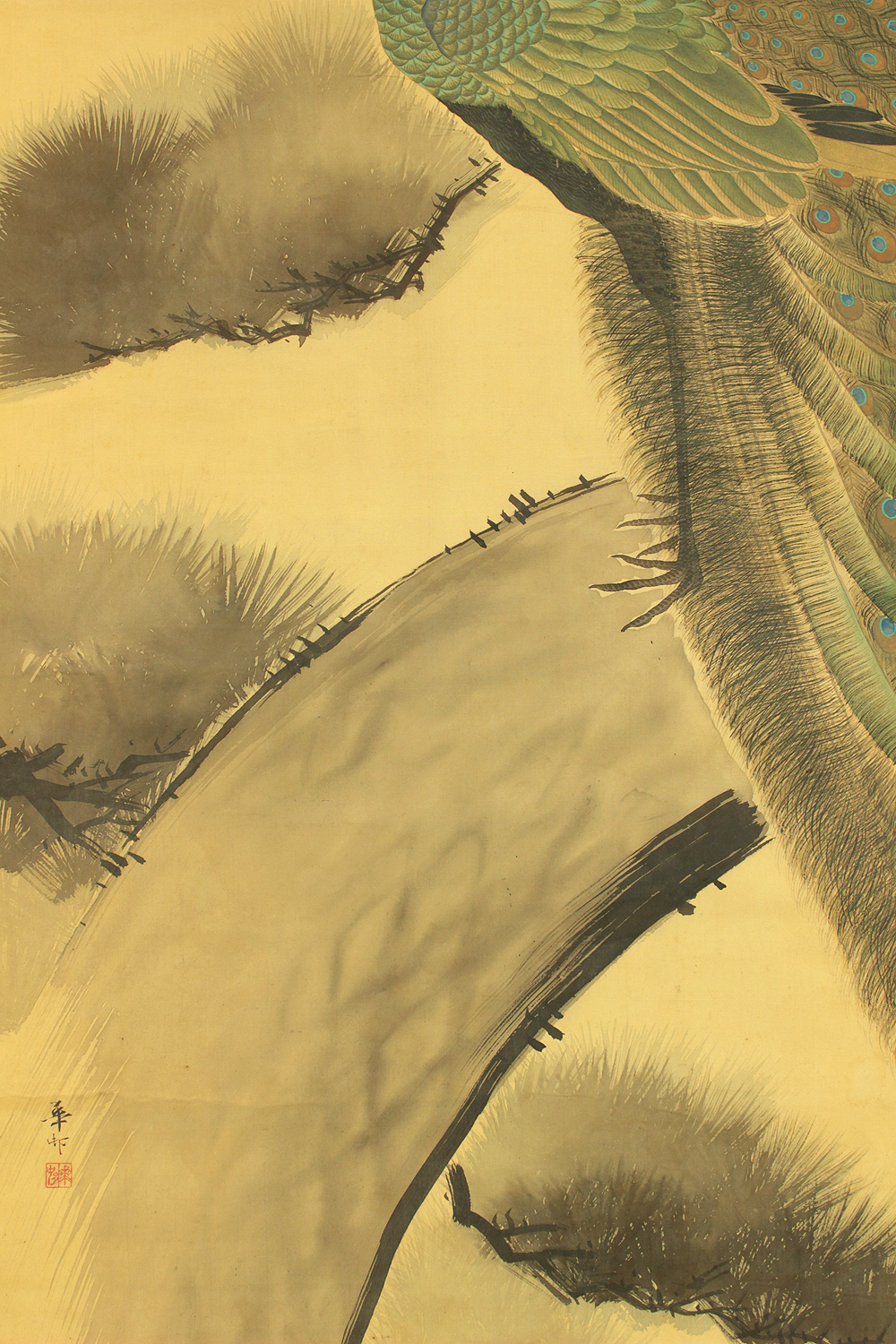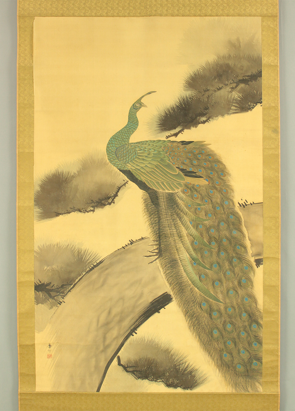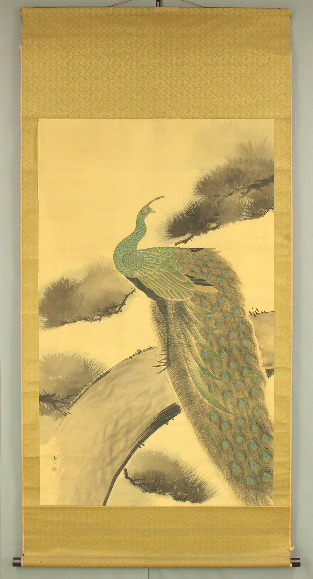 鈴木華邨 Suzuki Kason (1860-1919) Japanese art Large kakejiku kakemono wall hanging scroll / Peacock Perched Pine Tree with Box RD729