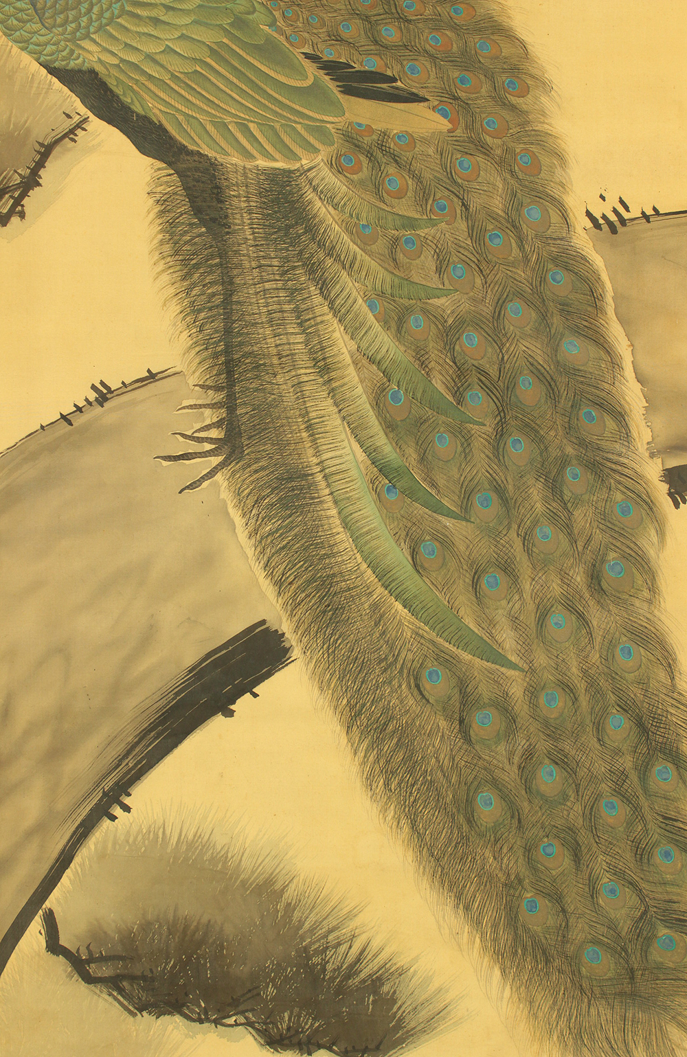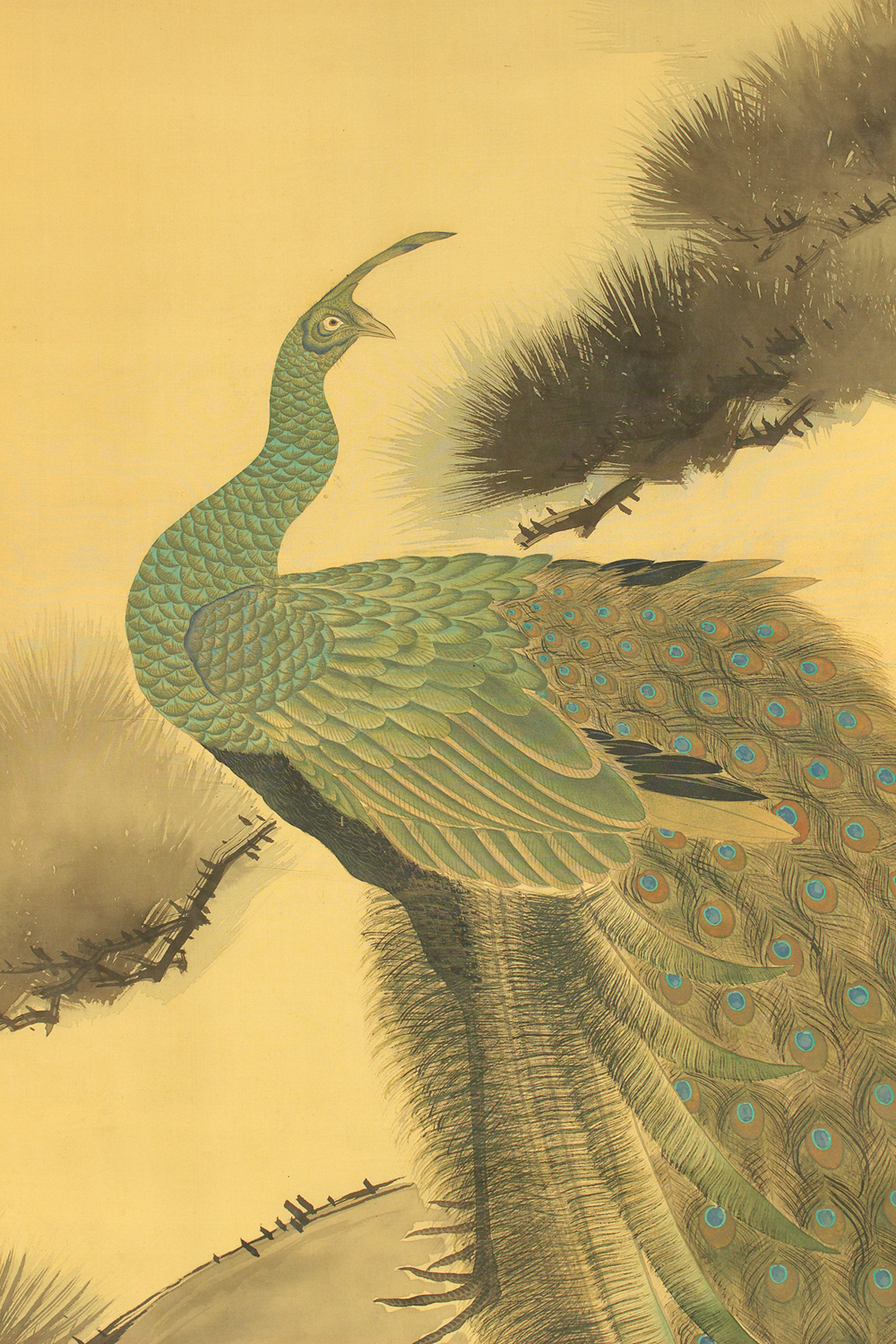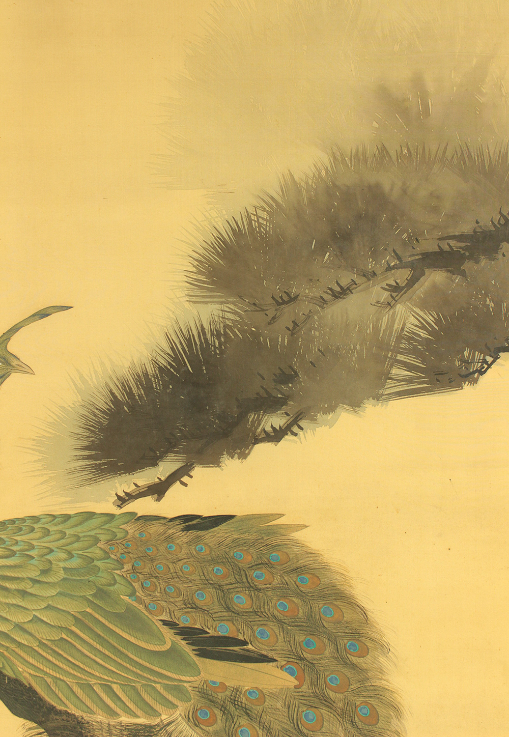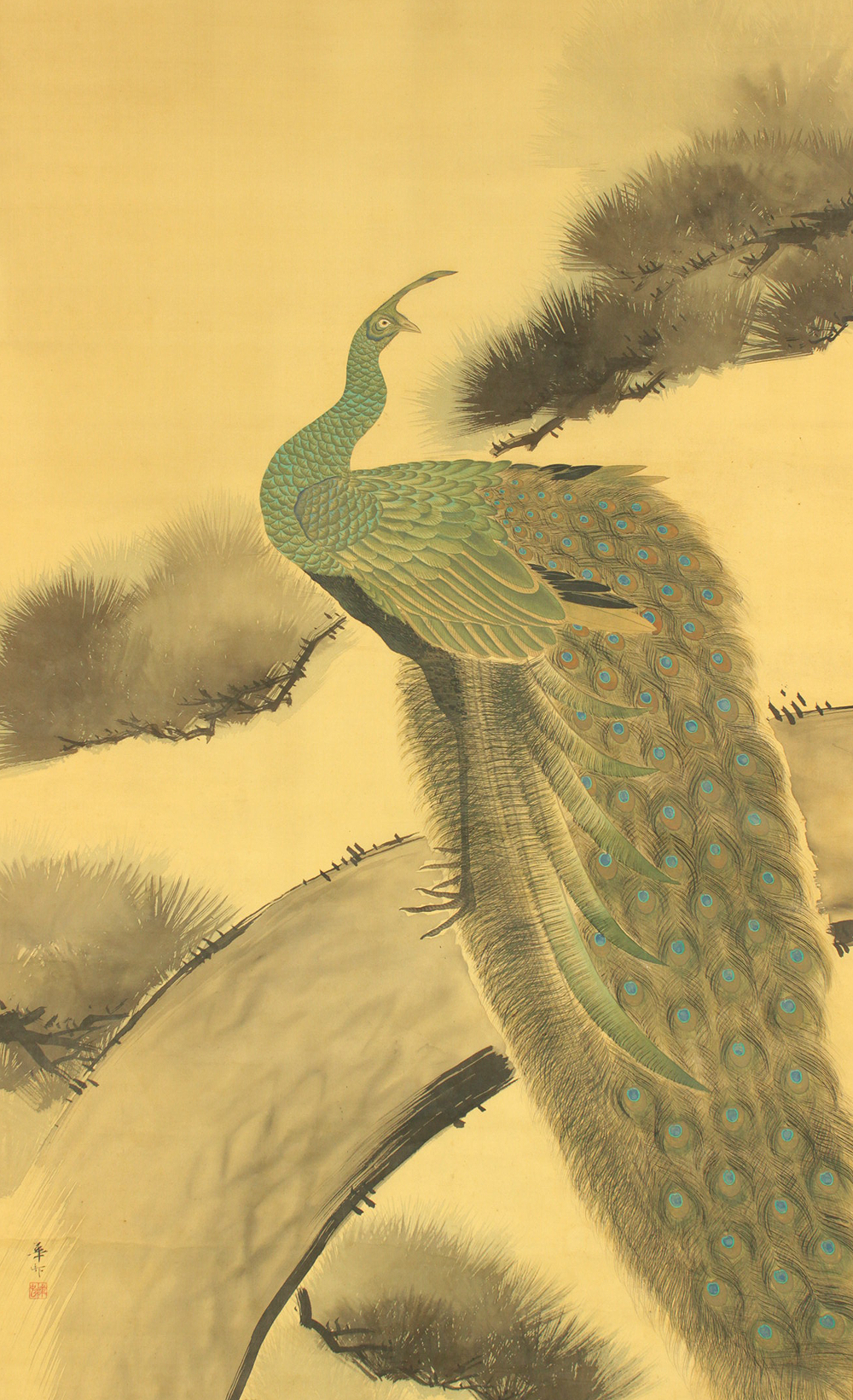 鈴木華邨 Suzuki Kason (1860-1919) Japanese art Large kakejiku kakemono wall hanging scroll / Peacock Perched Pine Tree with Box RD729