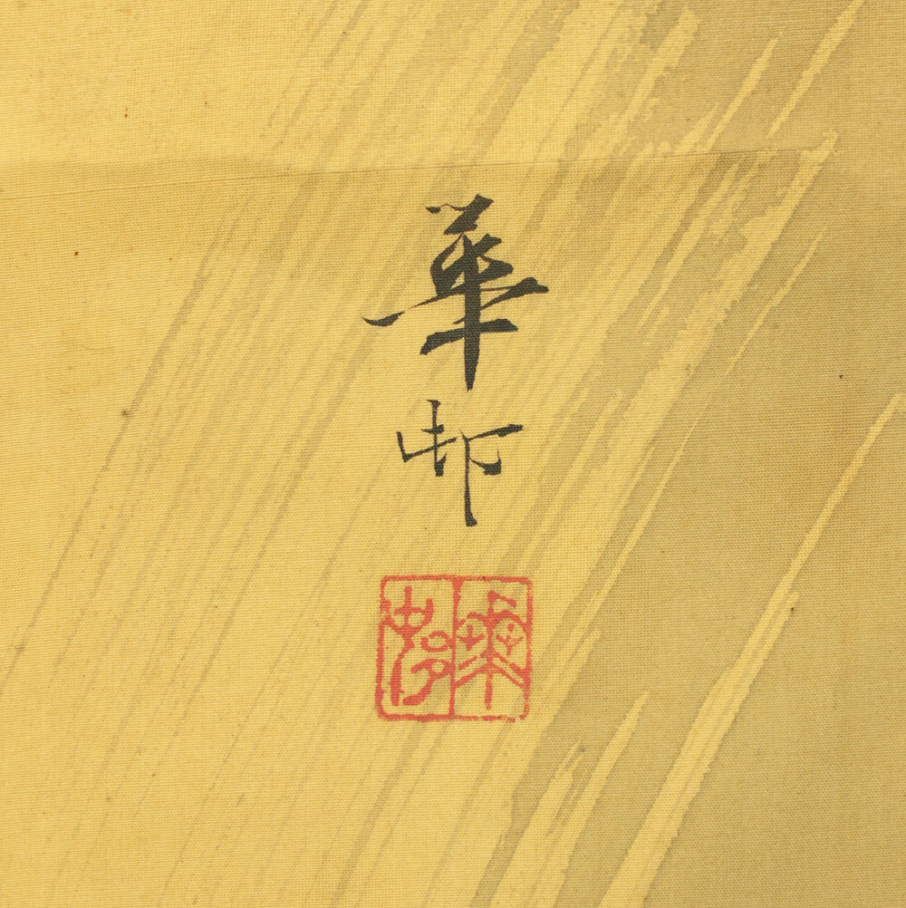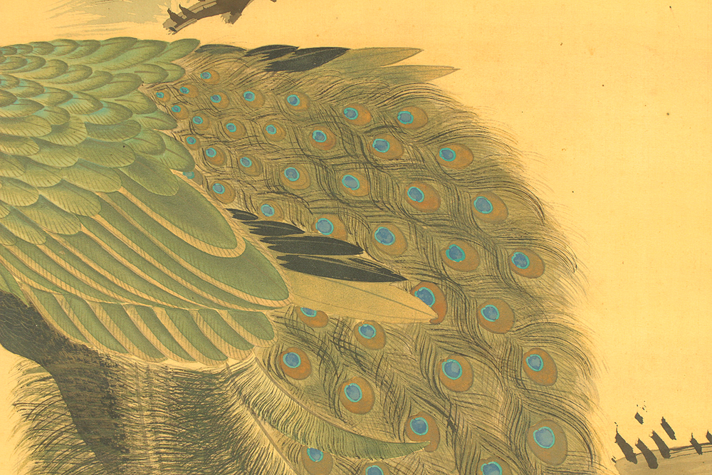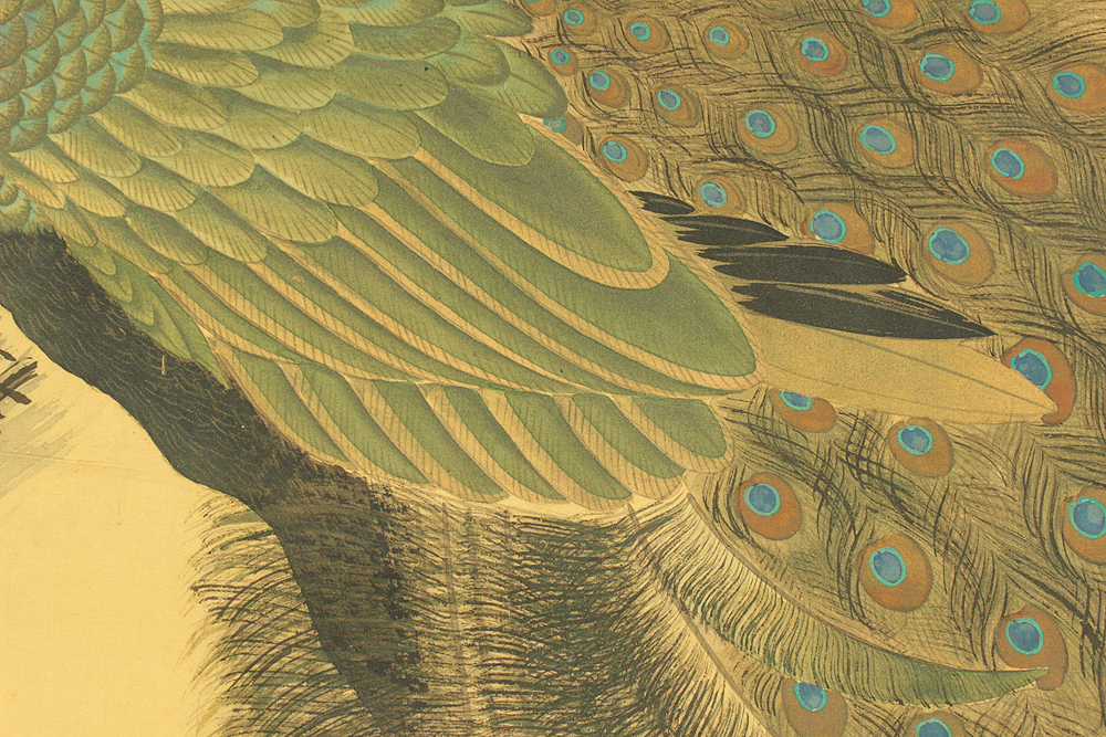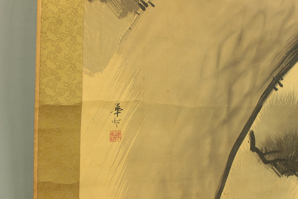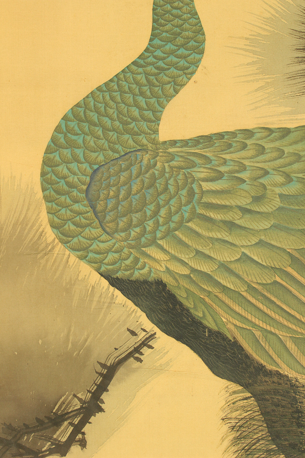 This large hanging scroll by Suzuki Kason (鈴木華邨, 1860–1919) presents a majestic peacock perched on a pine tree, rendered with exquisite detail and vibrant coloration. The iridescent blues and greens of the plumage, especially the elaborate tail feathers with eye-like motifs, are balanced by the textured pine needles and soft background tones, creating a composition that radiates elegance and serenity. Kason, active during the Meiji and Taisho periods, began his artistic training in the Yosai school of figure painting, later incorporating stylistic elements from the Tosa school and ukiyo-e traditions of the Shijō school. His mature style is especially celebrated in kachōga (flower-and-bird painting), where he combined classical refinement with a modern sensibility. Signed and sealed “Kason” (華邨), this scroll is accompanied by a box, preserving a work that exemplifies the grace and technical mastery of late 19th-century Japanese painting. It stands as a testament to Kason’s ability to harmonize decorative beauty with natural realism, making it a compelling piece for collectors and connoisseurs of Nihonga.