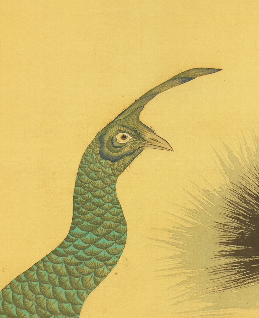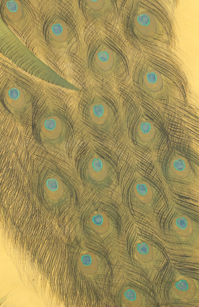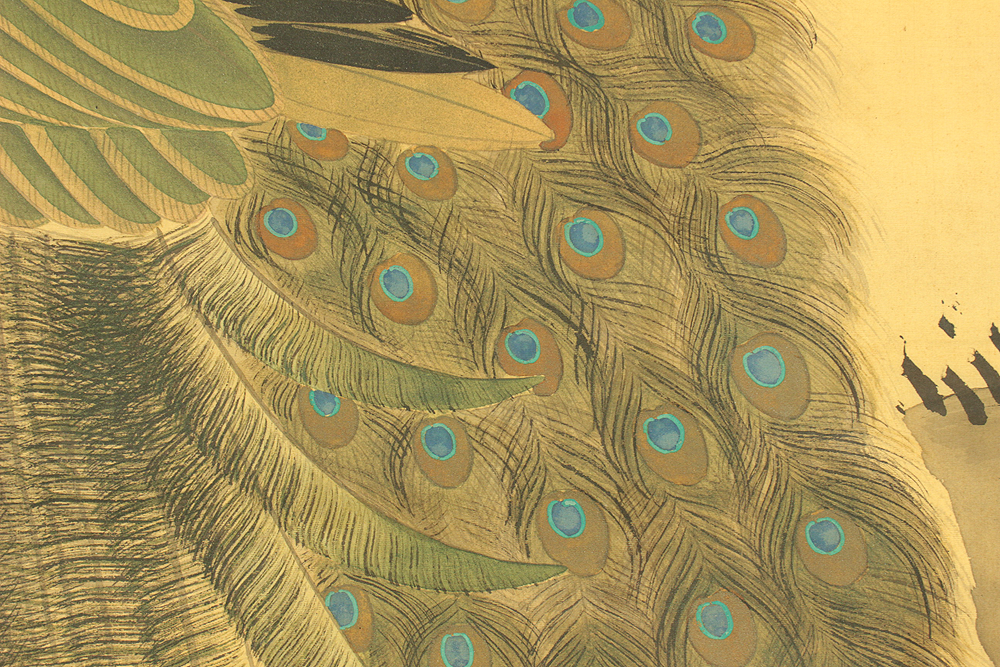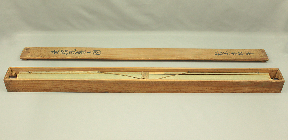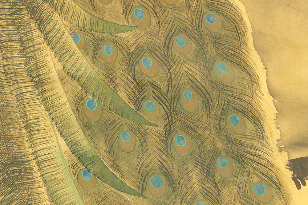 This large hanging scroll by Suzuki Kason (鈴木華邨, 1860–1919) presents a majestic peacock perched on a pine tree, rendered with exquisite detail and vibrant coloration. The iridescent blues and greens of the plumage, especially the elaborate tail feathers with eye-like motifs, are balanced by the textured pine needles and soft background tones, creating a composition that radiates elegance and serenity. Kason, active during the Meiji and Taisho periods, began his artistic training in the Yosai school of figure painting, later incorporating stylistic elements from the Tosa school and ukiyo-e traditions of the Shijō school. His mature style is especially celebrated in kachōga (flower-and-bird painting), where he combined classical refinement with a modern sensibility. Signed and sealed “Kason” (華邨), this scroll is accompanied by a box, preserving a work that exemplifies the grace and technical mastery of late 19th-century Japanese painting. It stands as a testament to Kason’s ability to harmonize decorative beauty with natural realism, making it a compelling piece for collectors and connoisseurs of Nihonga.