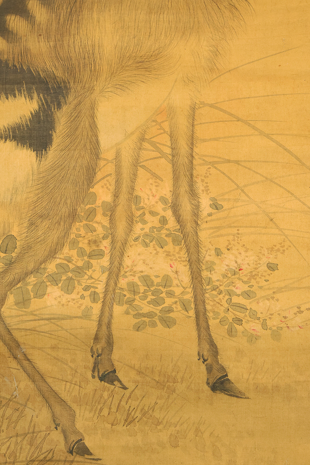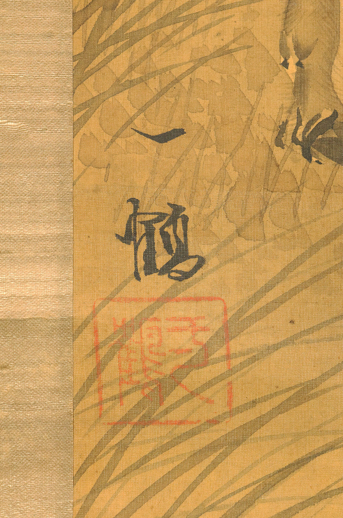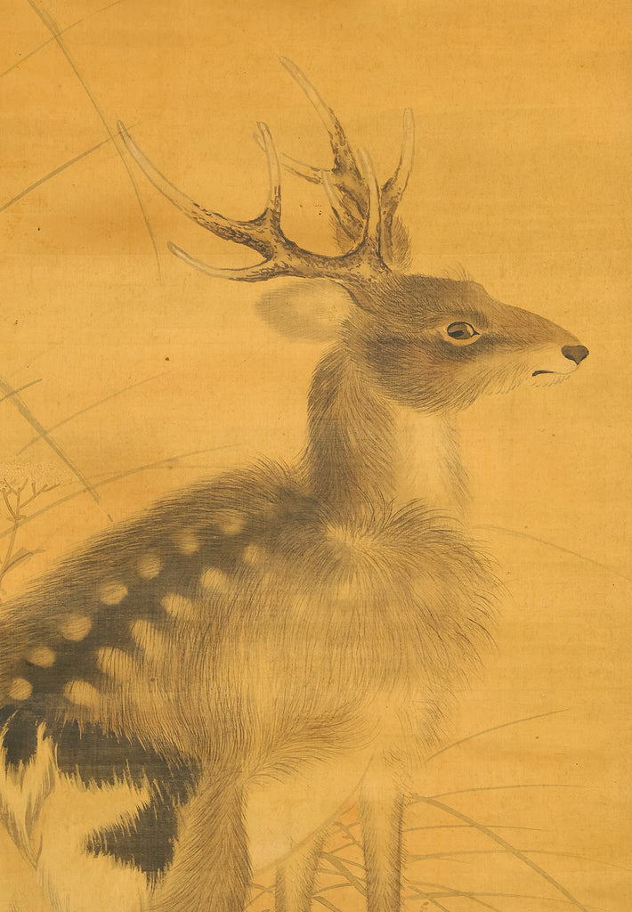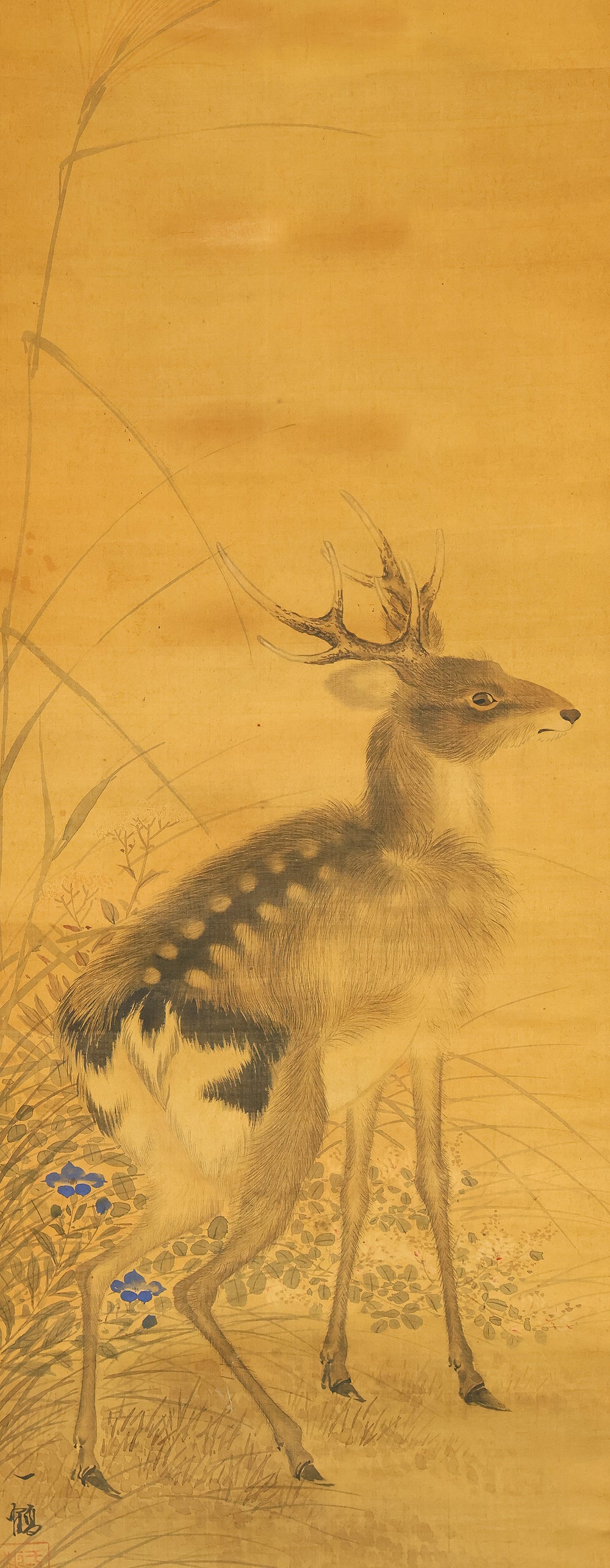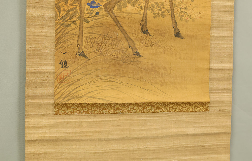 Softly illuminated against a warm, muted ground, this kakejiku depicts a deer standing among silver grass, gentian, and bush clovers—an ensemble of autumn motifs that heightens the quiet dignity of the animal. The painter’s delicate modulation of ink and color brings out the texture of the fur and the alert posture of the deer, while the surrounding plants create a gentle vertical rhythm that guides the viewer’s gaze through the composition. The restrained palette and spacious arrangement lend the work a calm, seasonal atmosphere, making it suitable for both traditional and modern interiors. The scroll bears the signature and seal “Ikkaku” (一鶴), reflecting the artist’s assured handling of nature subjects. It is accompanied by a preservation box, consistent with customary storage practices for hanging scrolls.