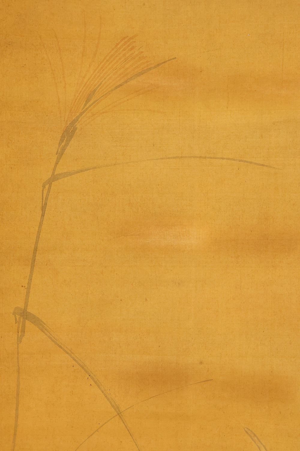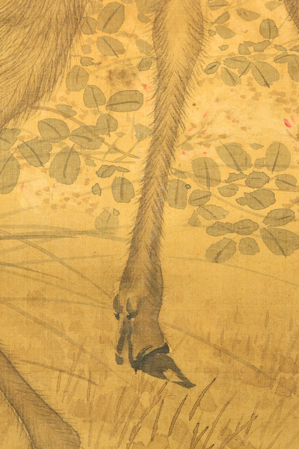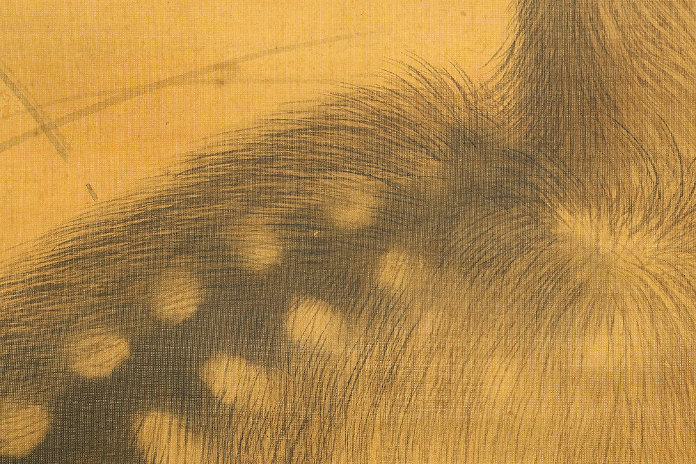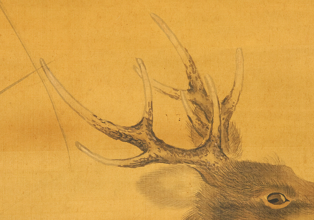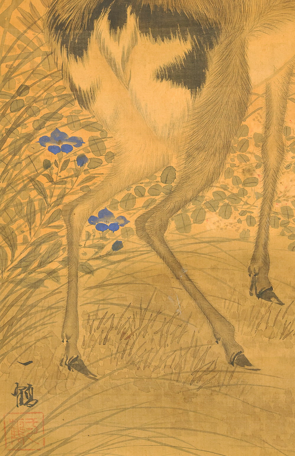 Softly illuminated against a warm, muted ground, this kakejiku depicts a deer standing among silver grass, gentian, and bush clovers—an ensemble of autumn motifs that heightens the quiet dignity of the animal. The painter’s delicate modulation of ink and color brings out the texture of the fur and the alert posture of the deer, while the surrounding plants create a gentle vertical rhythm that guides the viewer’s gaze through the composition. The restrained palette and spacious arrangement lend the work a calm, seasonal atmosphere, making it suitable for both traditional and modern interiors. The scroll bears the signature and seal “Ikkaku” (一鶴), reflecting the artist’s assured handling of nature subjects. It is accompanied by a preservation box, consistent with customary storage practices for hanging scrolls.
