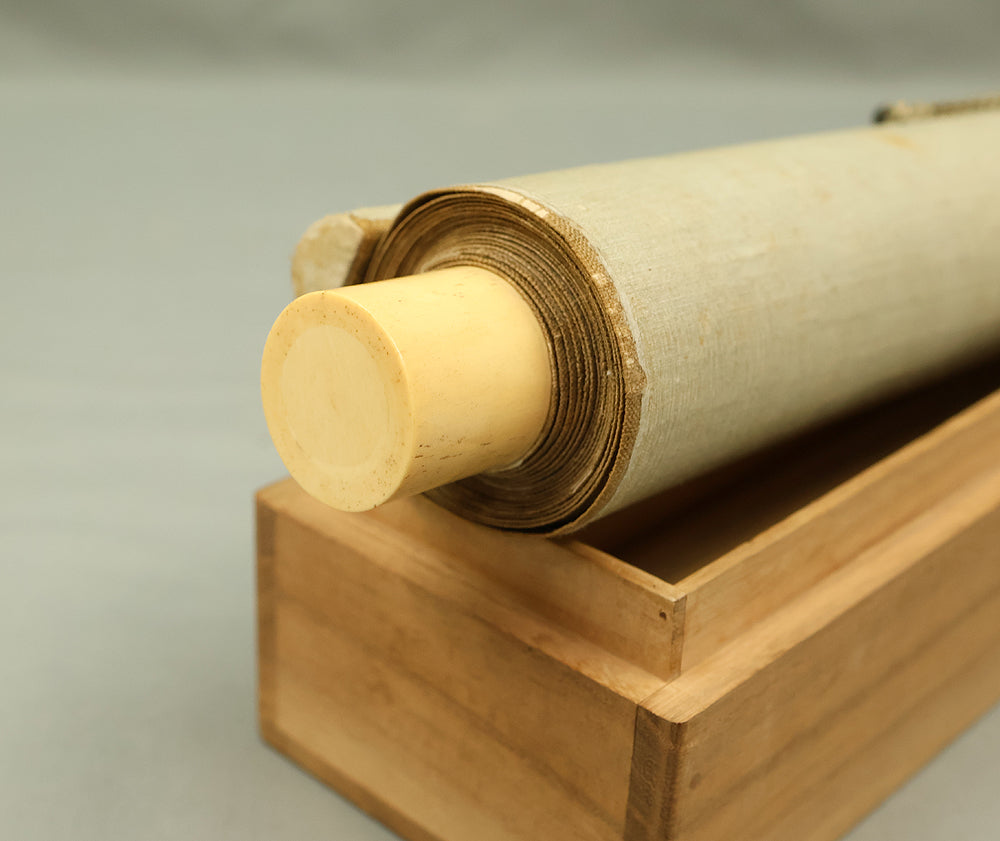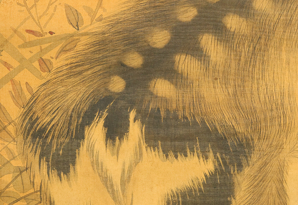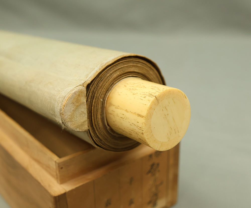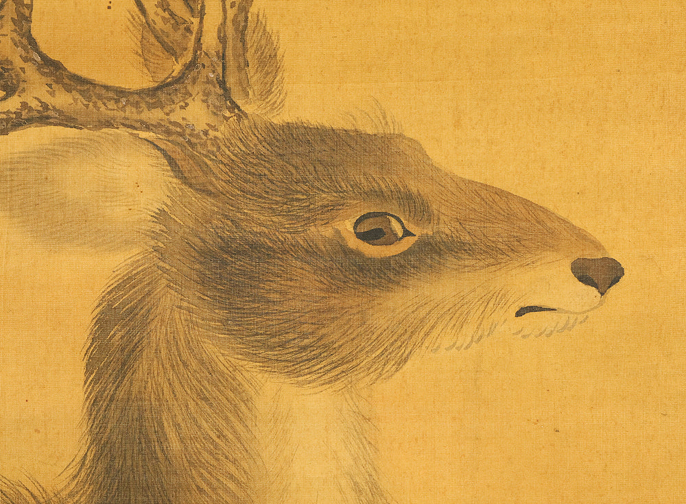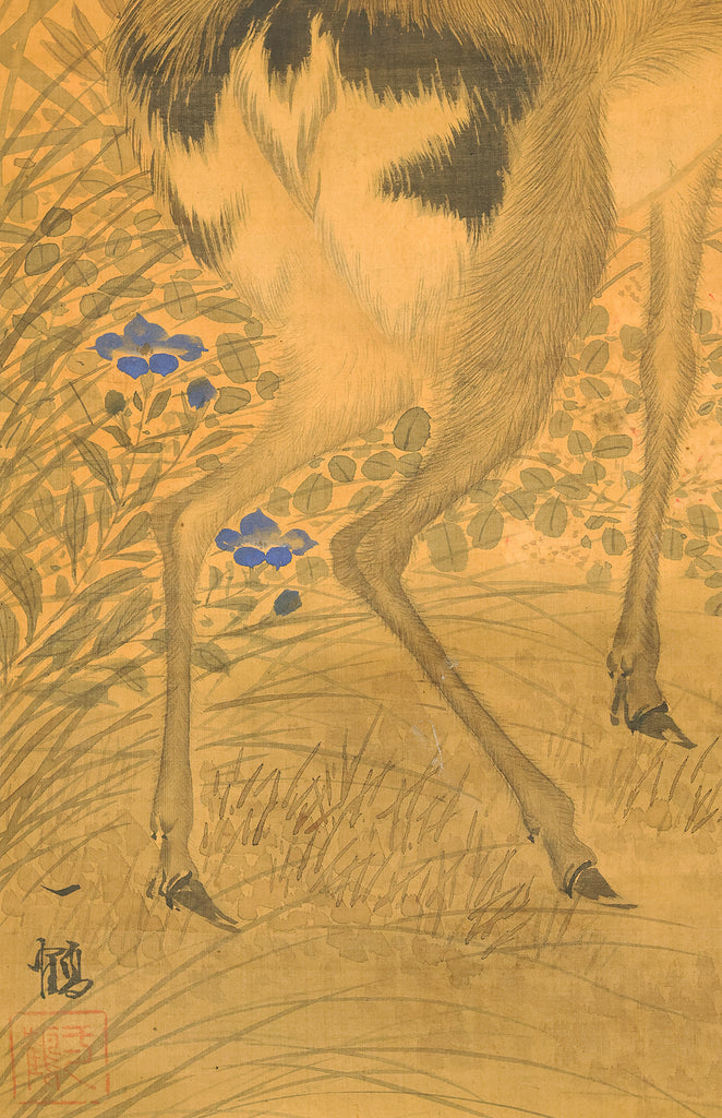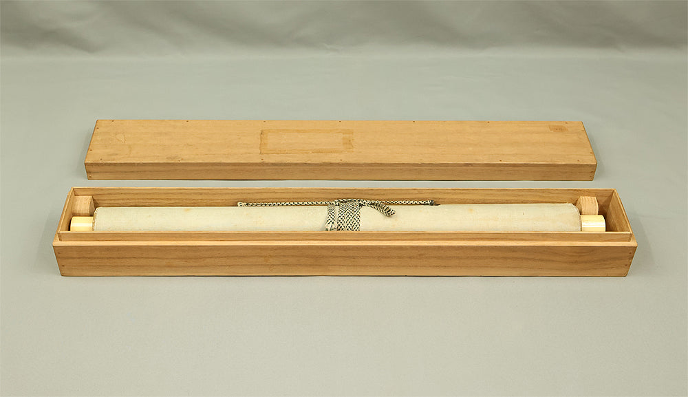 Softly illuminated against a warm, muted ground, this kakejiku depicts a deer standing among silver grass, gentian, and bush clovers—an ensemble of autumn motifs that heightens the quiet dignity of the animal. The painter’s delicate modulation of ink and color brings out the texture of the fur and the alert posture of the deer, while the surrounding plants create a gentle vertical rhythm that guides the viewer’s gaze through the composition. The restrained palette and spacious arrangement lend the work a calm, seasonal atmosphere, making it suitable for both traditional and modern interiors. The scroll bears the signature and seal “Ikkaku” (一鶴), reflecting the artist’s assured handling of nature subjects. It is accompanied by a preservation box, consistent with customary storage practices for hanging scrolls.
