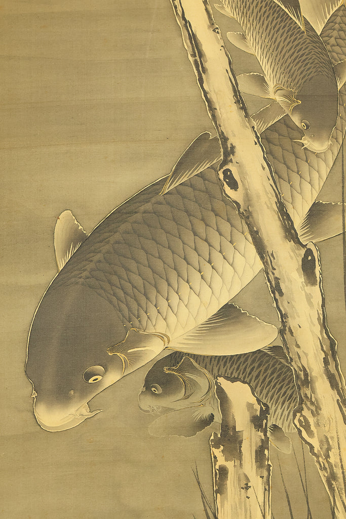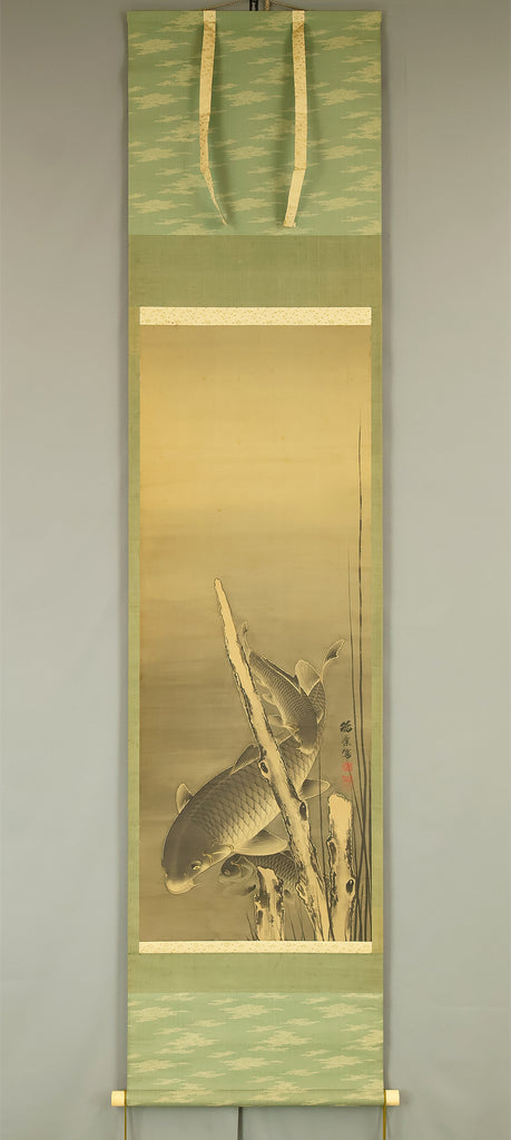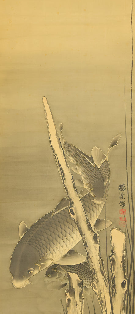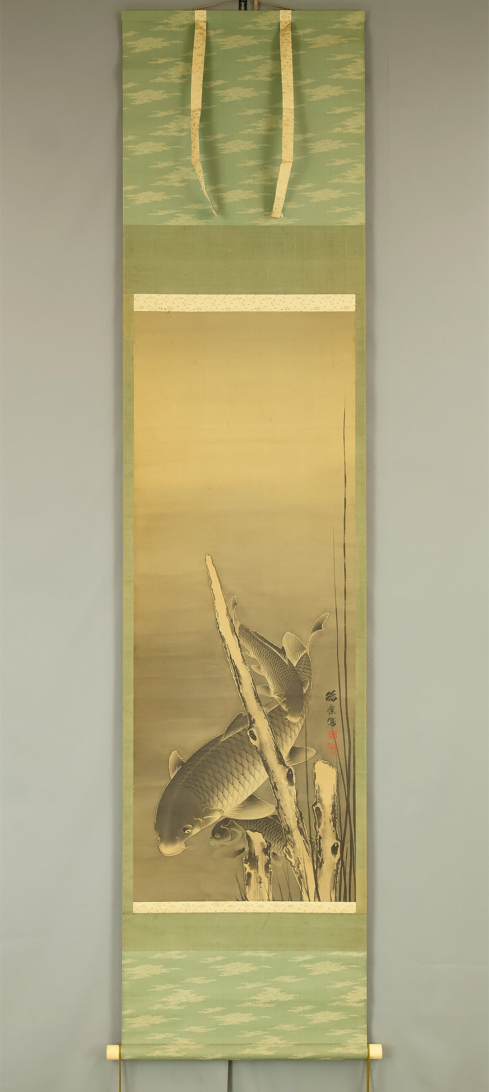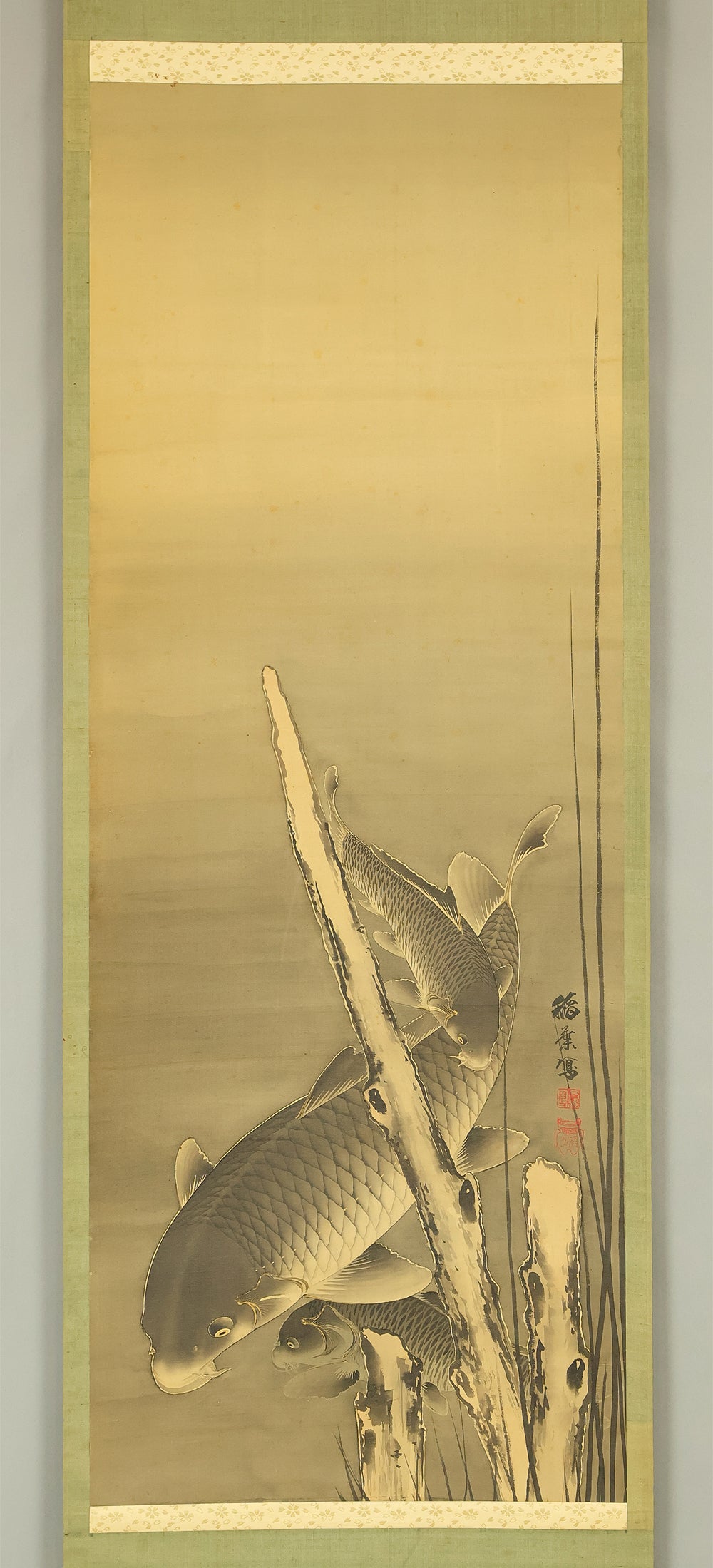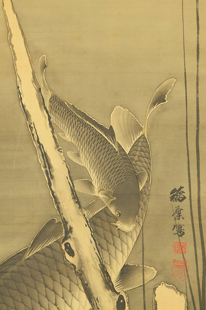 Moving with a quiet, fluid rhythm, the three carp in this kakejiku are rendered with a sensitivity that captures the tension between stillness and motion within flowing water. Each fish is defined by subtle gradations of ink, the weight of the body conveyed through confident brushwork and the gentle modulation of tone. The reeds and aquatic plants create a vertical counterbalance, guiding the eye through the composition and enhancing the sense of depth. The signature and seal “Inaba” (稲葉) appear on the scroll, indicating that the work belongs to the painter’s early period, when he was still shaping the observational precision and naturalistic clarity that would later become hallmarks of his mature style. The scroll is accompanied by a preservation box, consistent with traditional storage practices for Edo‑period hanging scrolls.