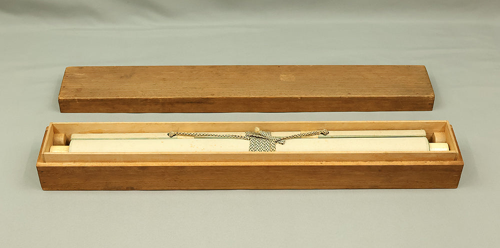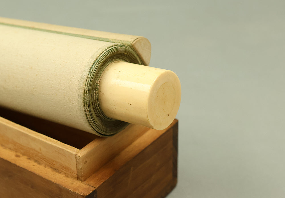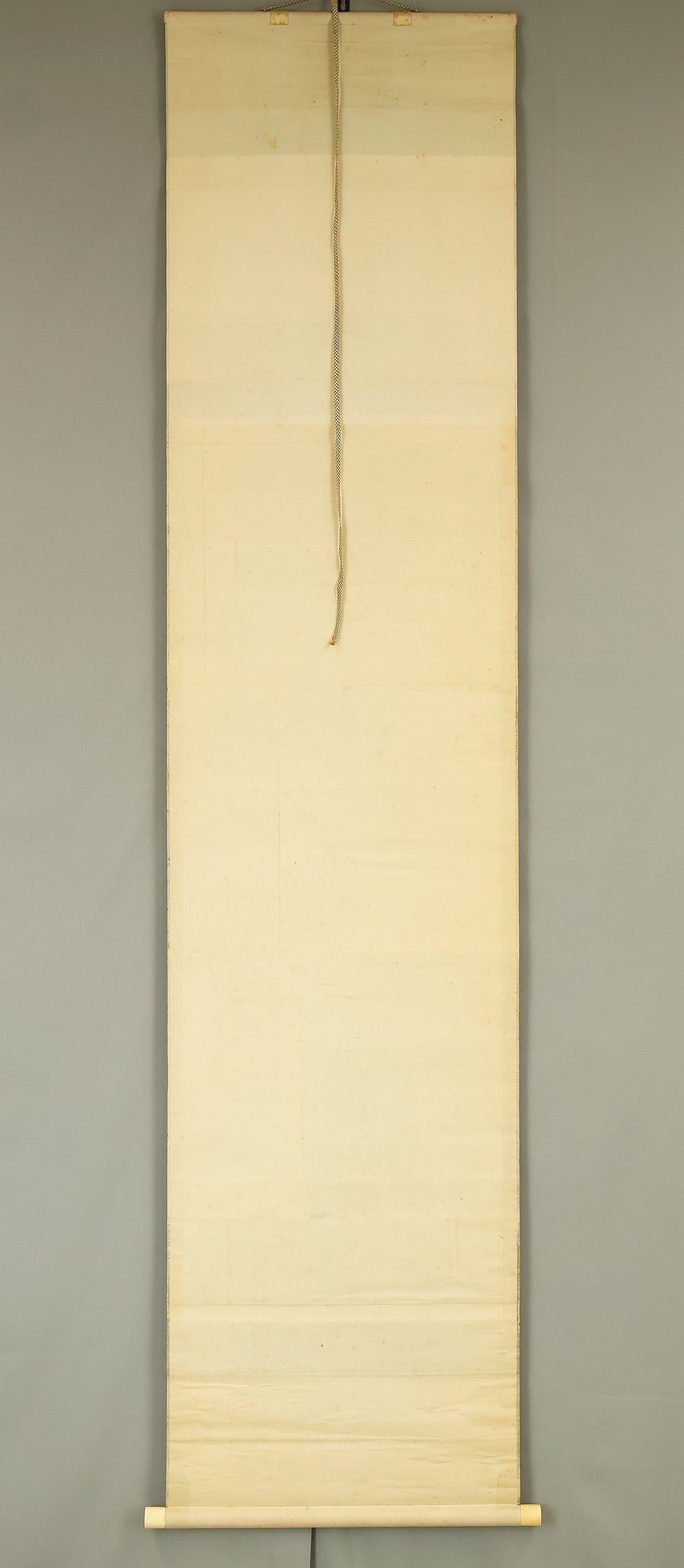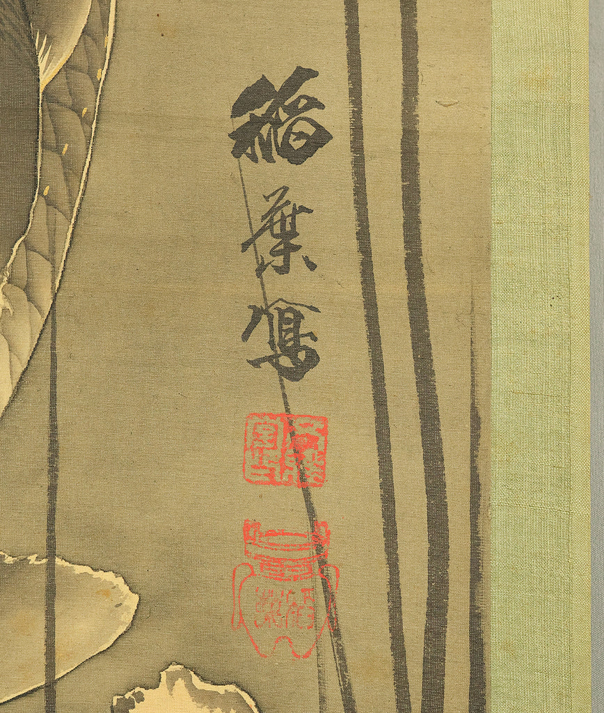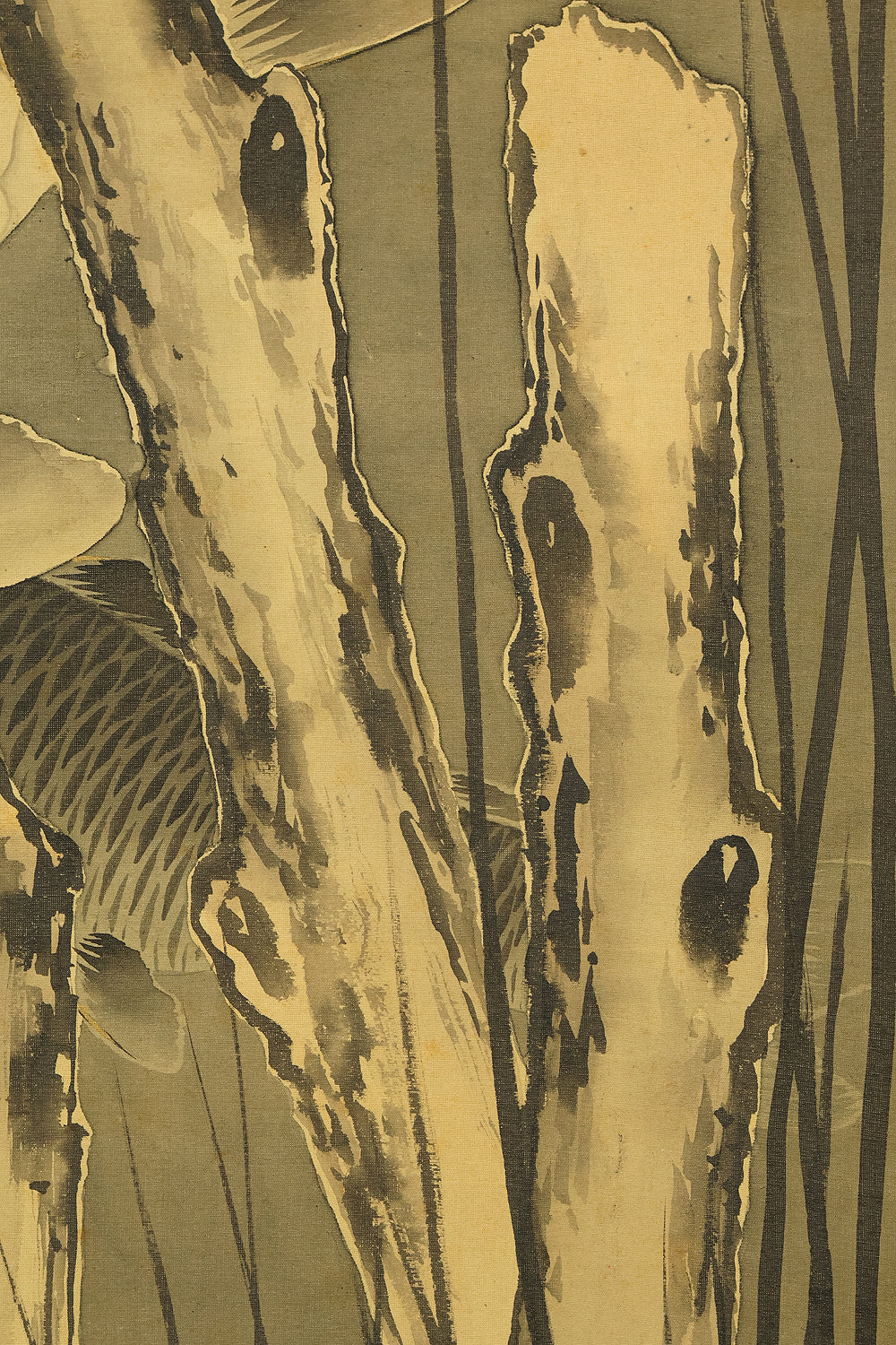 Moving with a quiet, fluid rhythm, the three carp in this kakejiku are rendered with a sensitivity that captures the tension between stillness and motion within flowing water. Each fish is defined by subtle gradations of ink, the weight of the body conveyed through confident brushwork and the gentle modulation of tone. The reeds and aquatic plants create a vertical counterbalance, guiding the eye through the composition and enhancing the sense of depth. The signature and seal “Inaba” (稲葉) appear on the scroll, indicating that the work belongs to the painter’s early period, when he was still shaping the observational precision and naturalistic clarity that would later become hallmarks of his mature style. The scroll is accompanied by a preservation box, consistent with traditional storage practices for Edo‑period hanging scrolls.