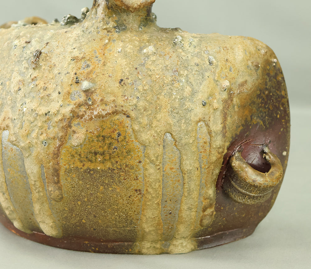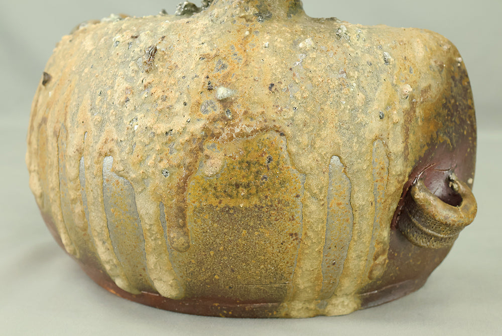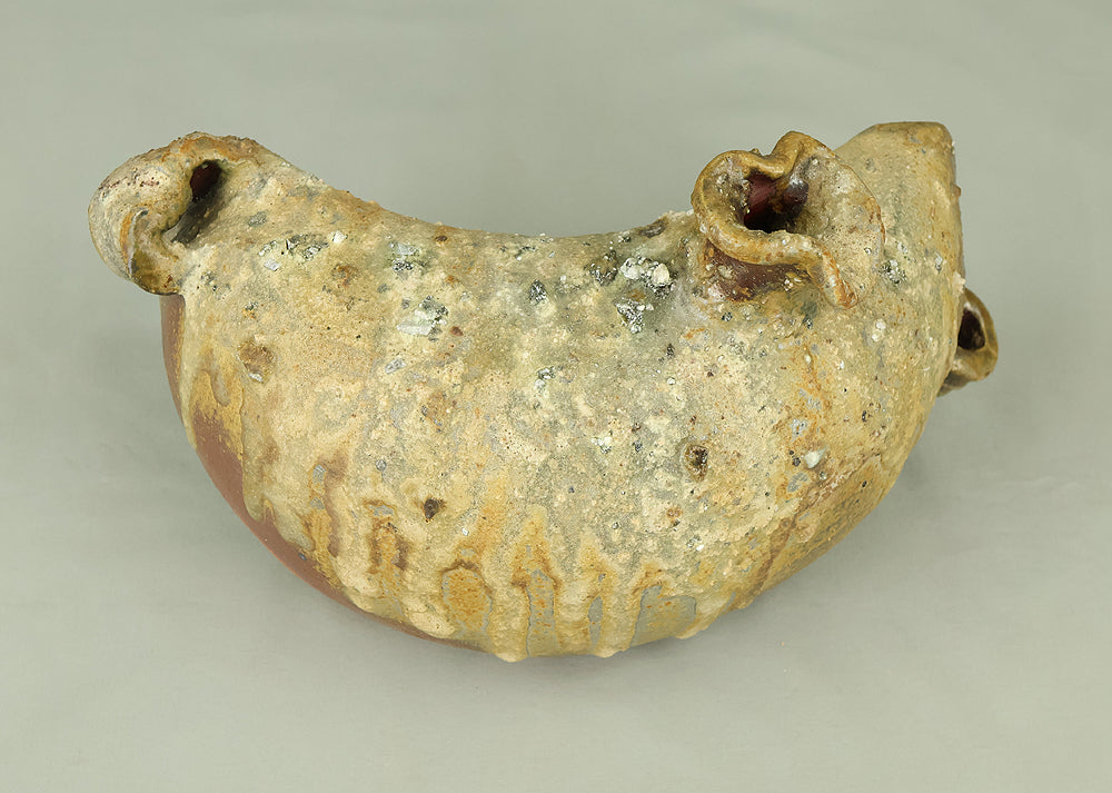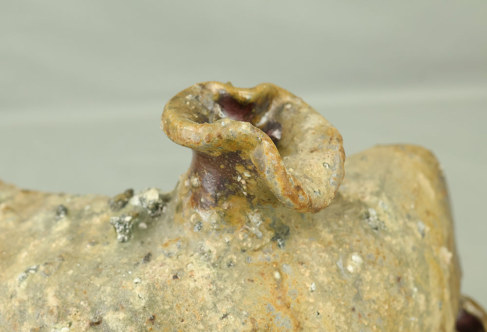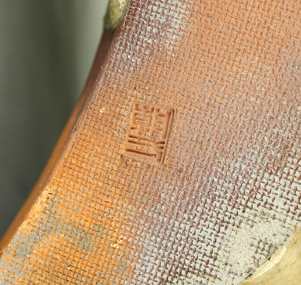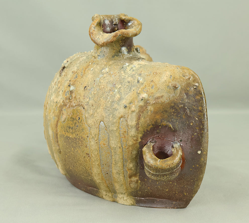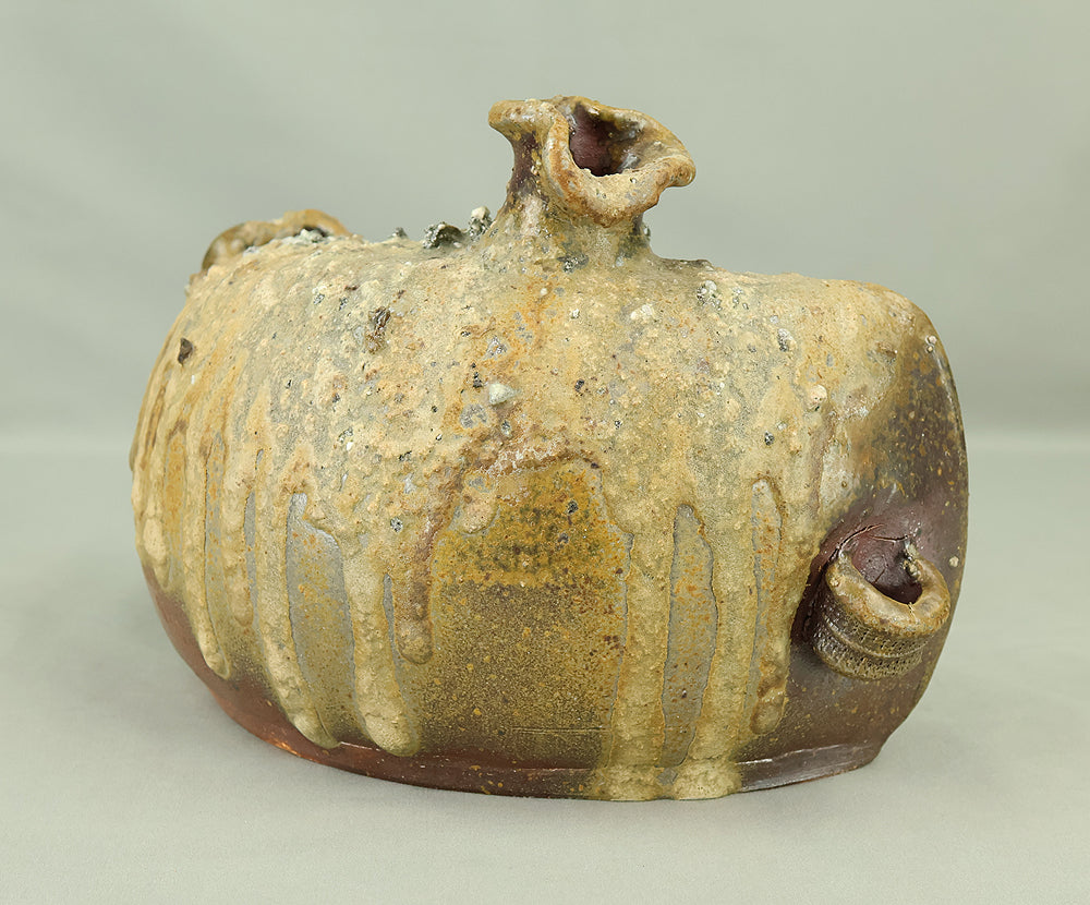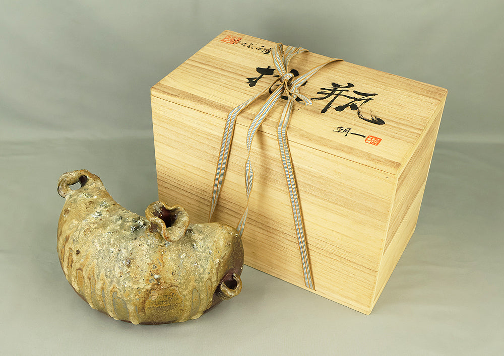 Created by Yonaha Choichi (b.1936), a leading Okinawan ceramic artist and Gold Prize recipient at the 5th Contemporary Okinawan Ceramics Exhibition, this shoulder‑carried sake bottle (dachibin) reflects the island’s distinctive pottery traditions. The vessel’s sculptural form—multiple openings, asymmetrical contours, and hand‑built presence—evokes the practical origins of the dachibin, once carried on the shoulder during celebrations and communal gatherings. Its textured surface and earthy tones highlight Yonaha’s sensitivity to clay and firing, giving the piece a natural, weathered character that feels rooted in Okinawa’s landscape. Measuring 30 × 18 × 18 cm and made of robust pottery, it balances functionality with expressive craftsmanship. The work is accompanied by its original tomobako, underscoring its authenticity and the esteem given to pieces by this respected artist.