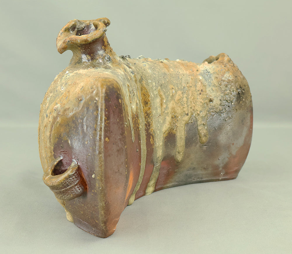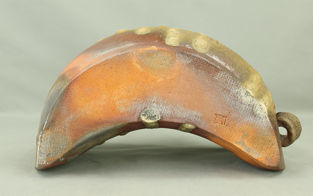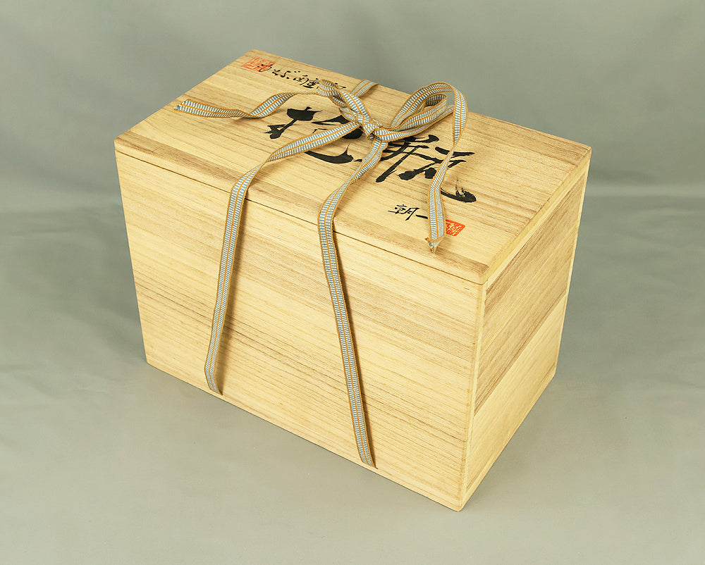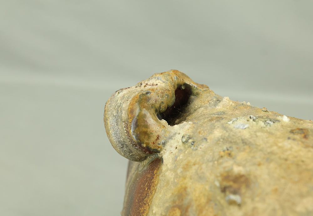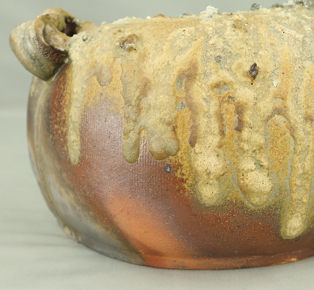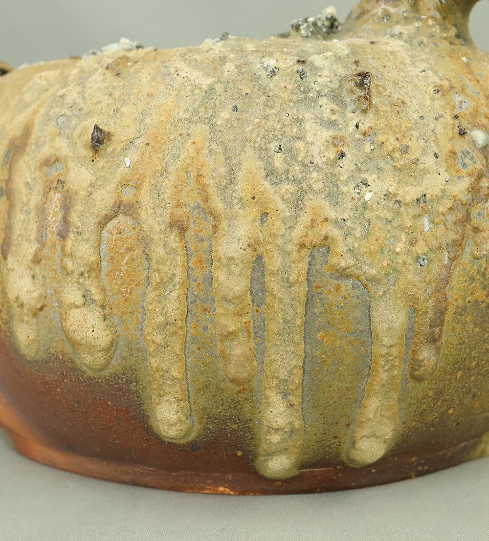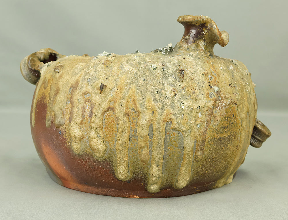Created by Yonaha Choichi (b.1936), a leading Okinawan ceramic artist and Gold Prize recipient at the 5th Contemporary Okinawan Ceramics Exhibition, this shoulder‑carried sake bottle (dachibin) reflects the island’s distinctive pottery traditions. The vessel’s sculptural form—multiple openings, asymmetrical contours, and hand‑built presence—evokes the practical origins of the dachibin, once carried on the shoulder during celebrations and communal gatherings. Its textured surface and earthy tones highlight Yonaha’s sensitivity to clay and firing, giving the piece a natural, weathered character that feels rooted in Okinawa’s landscape. Measuring 30 × 18 × 18 cm and made of robust pottery, it balances functionality with expressive craftsmanship. The work is accompanied by its original tomobako, underscoring its authenticity and the esteem given to pieces by this respected artist.