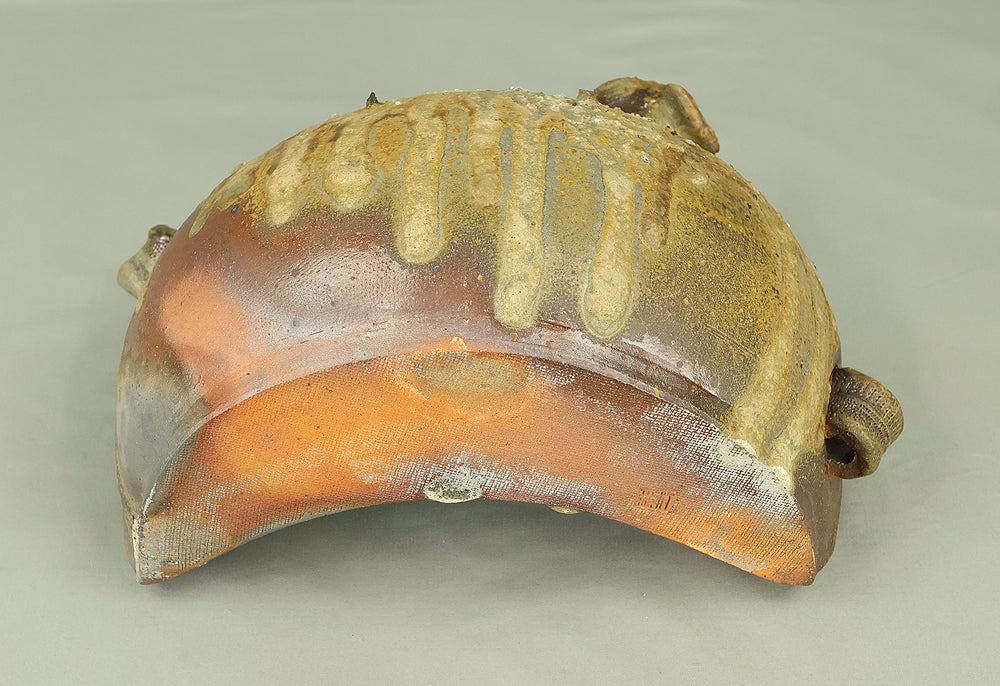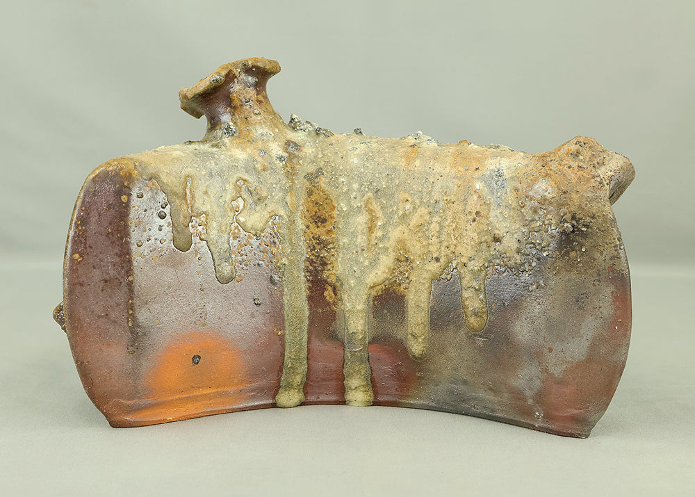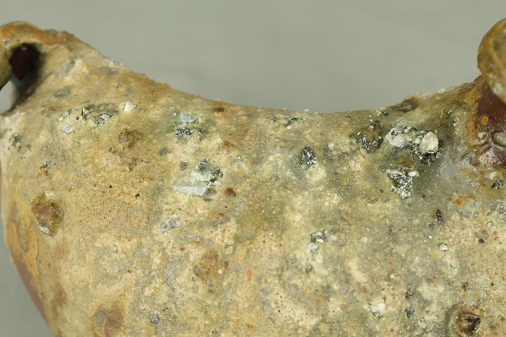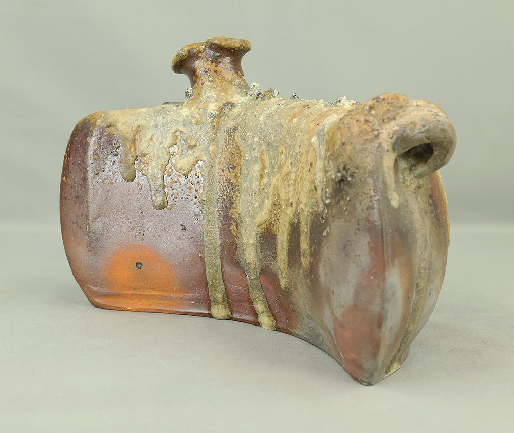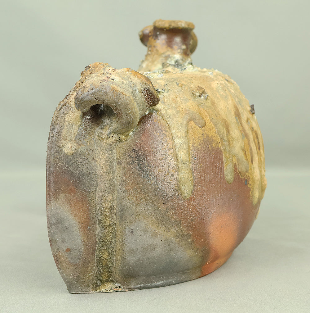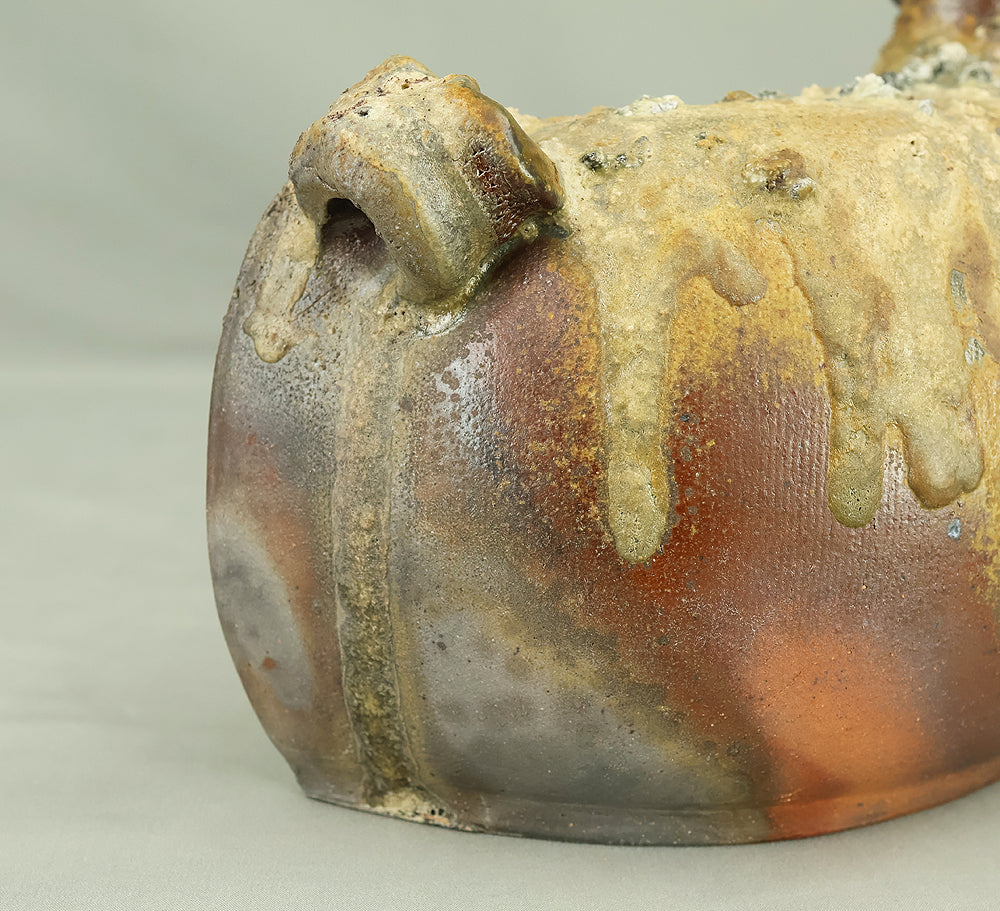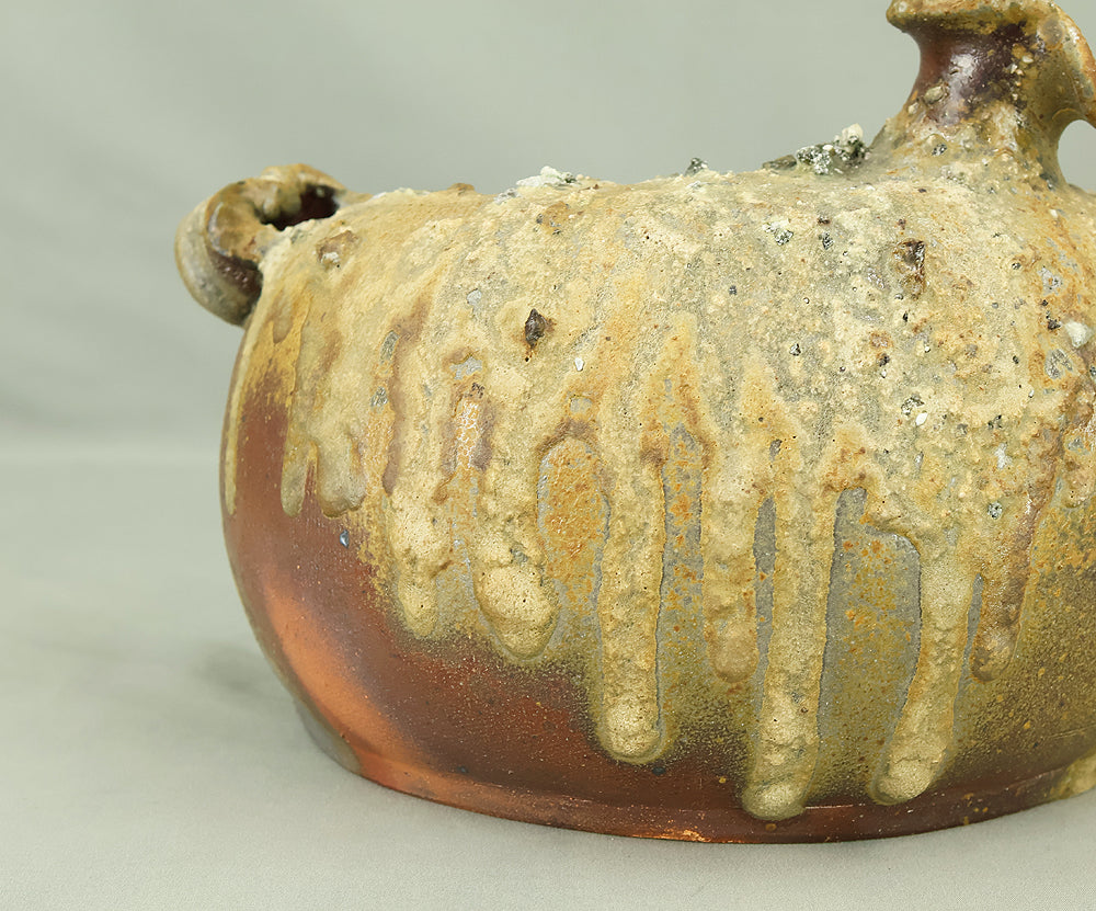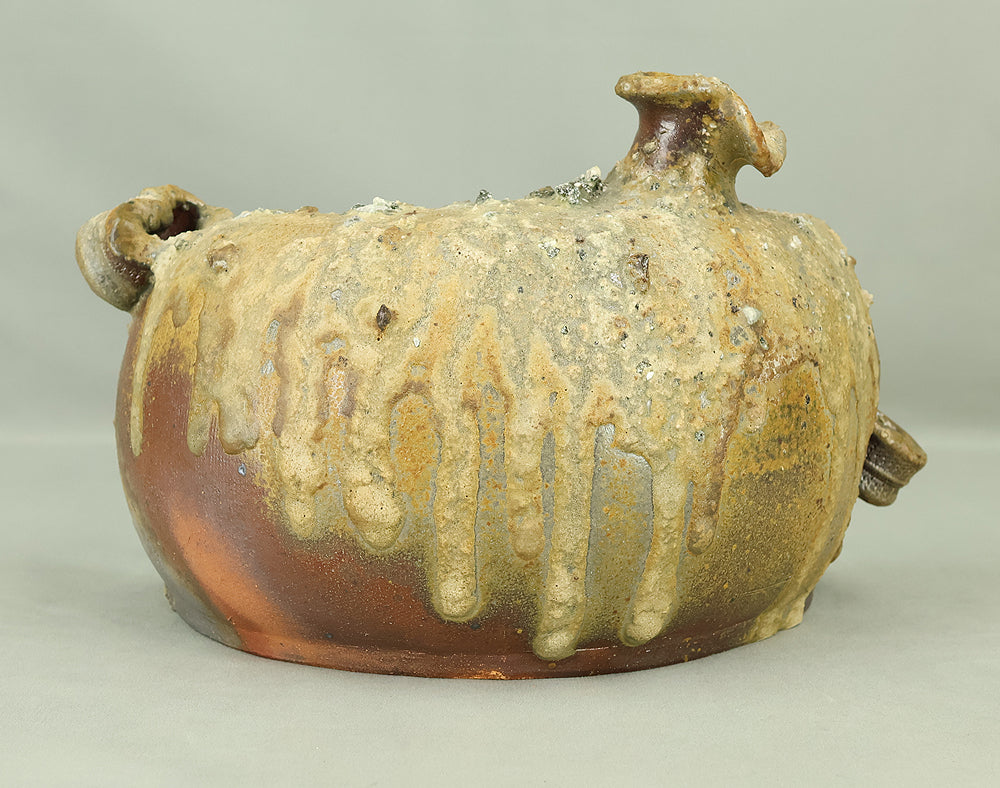 Created by Yonaha Choichi (b.1936), a leading Okinawan ceramic artist and Gold Prize recipient at the 5th Contemporary Okinawan Ceramics Exhibition, this shoulder‑carried sake bottle (dachibin) reflects the island’s distinctive pottery traditions. The vessel’s sculptural form—multiple openings, asymmetrical contours, and hand‑built presence—evokes the practical origins of the dachibin, once carried on the shoulder during celebrations and communal gatherings. Its textured surface and earthy tones highlight Yonaha’s sensitivity to clay and firing, giving the piece a natural, weathered character that feels rooted in Okinawa’s landscape. Measuring 30 × 18 × 18 cm and made of robust pottery, it balances functionality with expressive craftsmanship. The work is accompanied by its original tomobako, underscoring its authenticity and the esteem given to pieces by this respected artist.