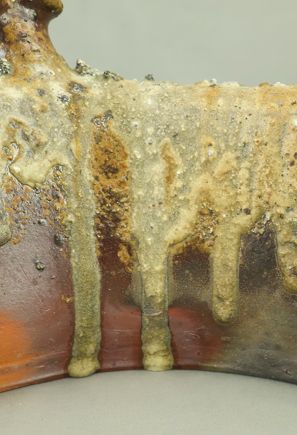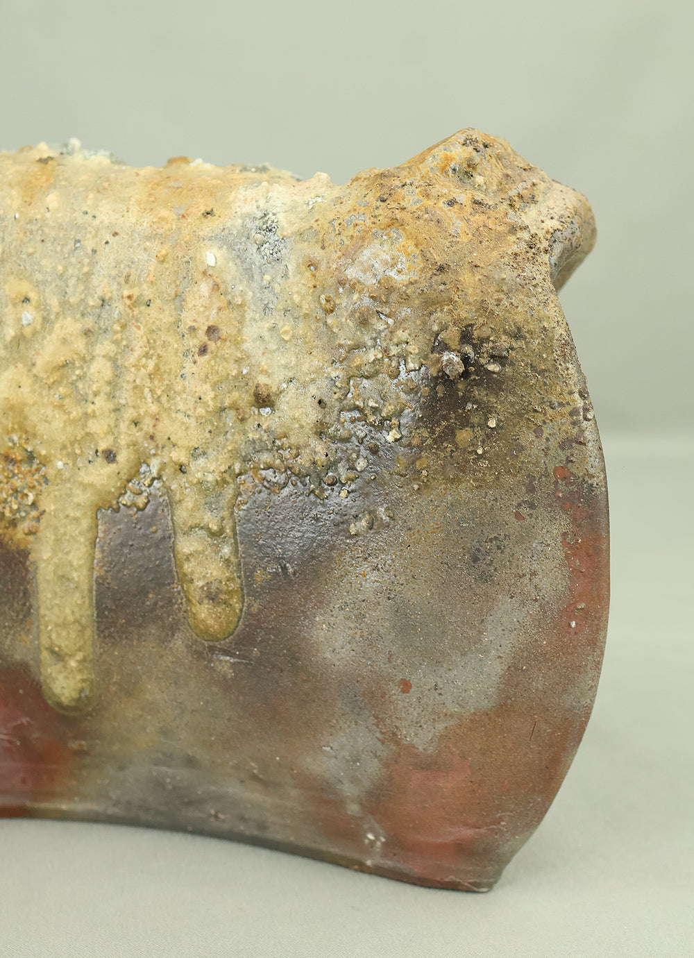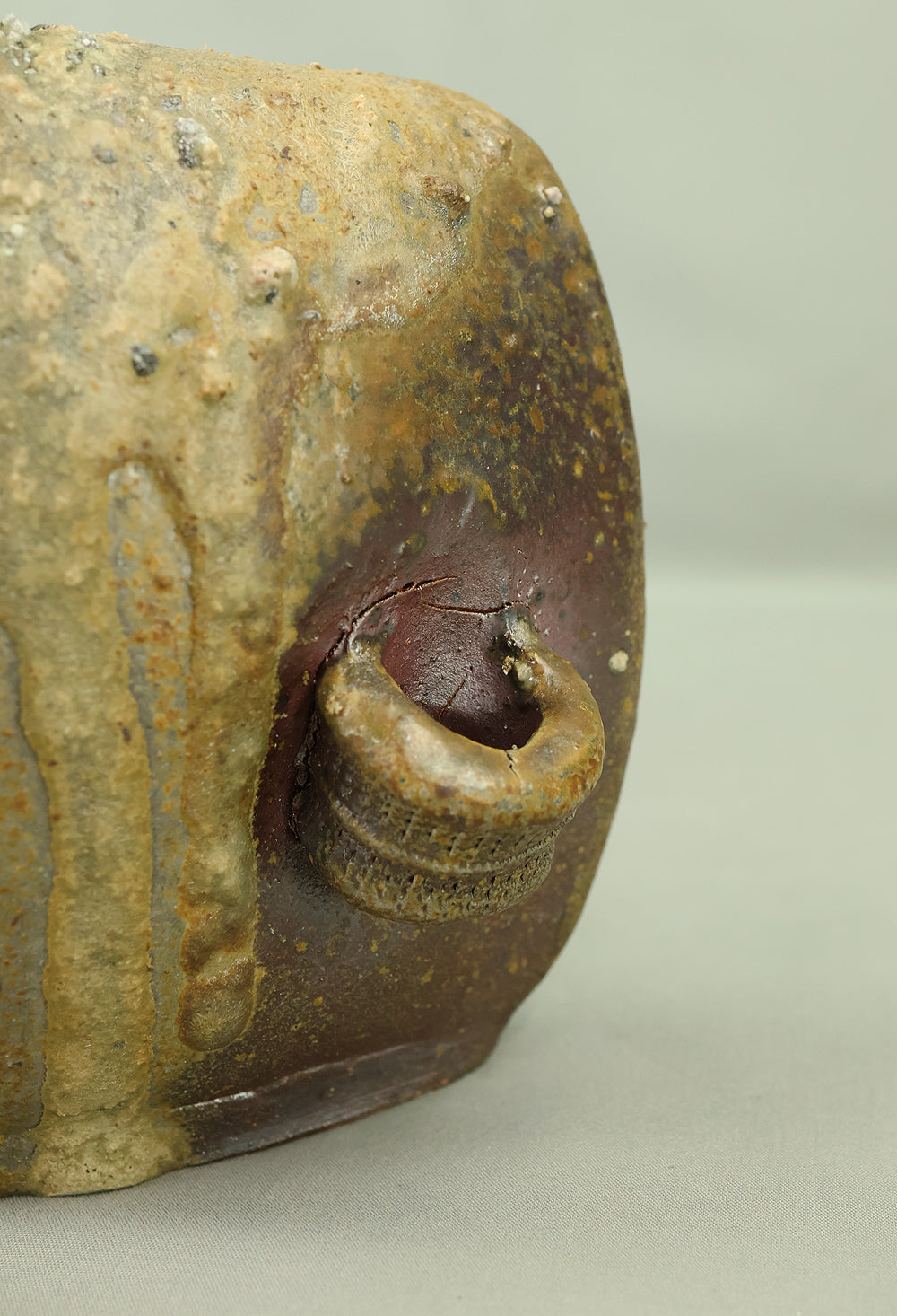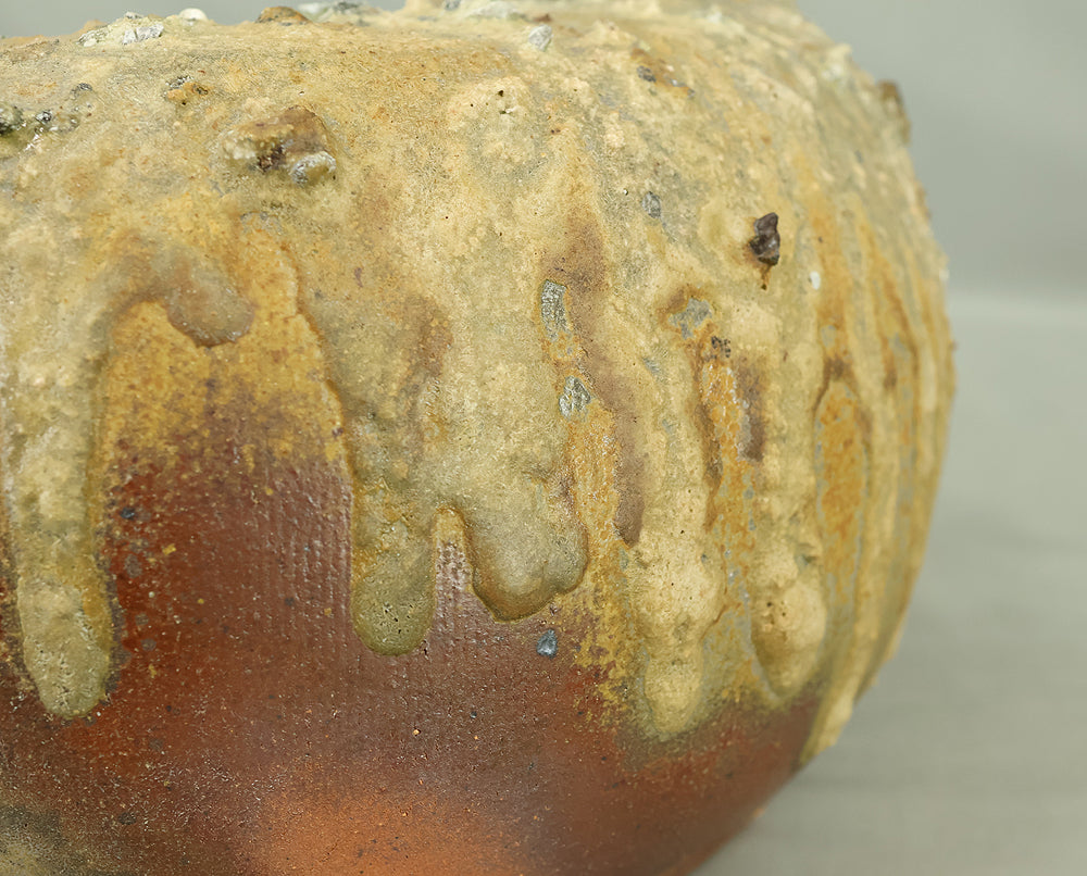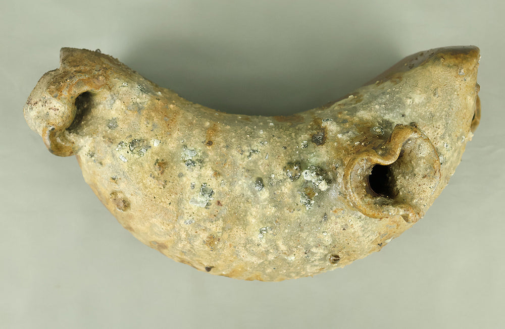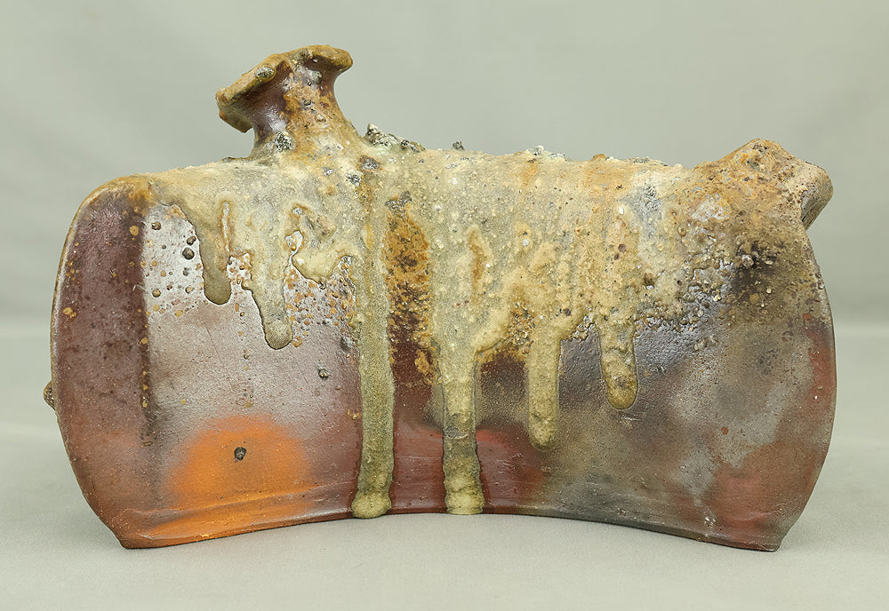 Created by Yonaha Choichi (b.1936), a leading Okinawan ceramic artist and Gold Prize recipient at the 5th Contemporary Okinawan Ceramics Exhibition, this shoulder‑carried sake bottle (dachibin) reflects the island’s distinctive pottery traditions. The vessel’s sculptural form—multiple openings, asymmetrical contours, and hand‑built presence—evokes the practical origins of the dachibin, once carried on the shoulder during celebrations and communal gatherings. Its textured surface and earthy tones highlight Yonaha’s sensitivity to clay and firing, giving the piece a natural, weathered character that feels rooted in Okinawa’s landscape. Measuring 30 × 18 × 18 cm and made of robust pottery, it balances functionality with expressive craftsmanship. The work is accompanied by its original tomobako, underscoring its authenticity and the esteem given to pieces by this respected artist.